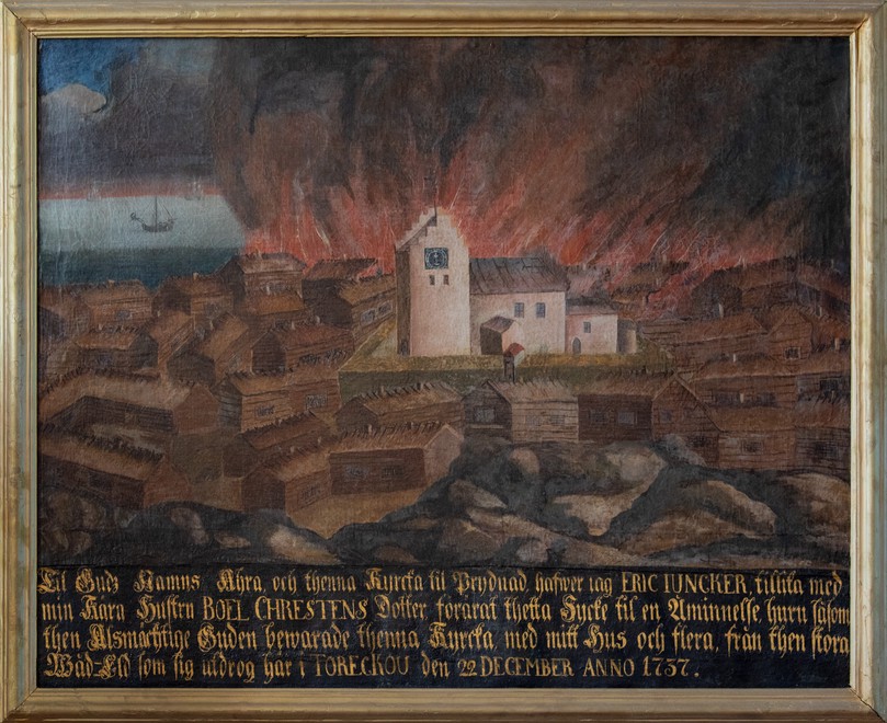 Ud over den brand, der lagde kirken øde i 1858 som omtalt ovenfor har en brand hærget byen i 1737, som det fremgår af teksten under billedet.