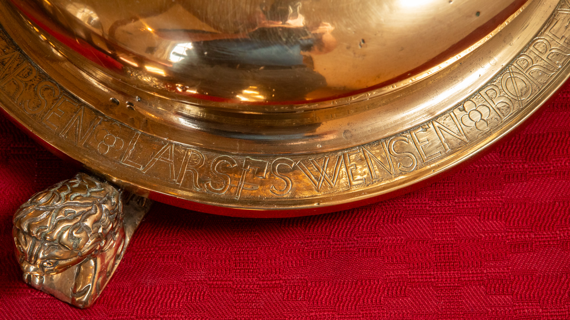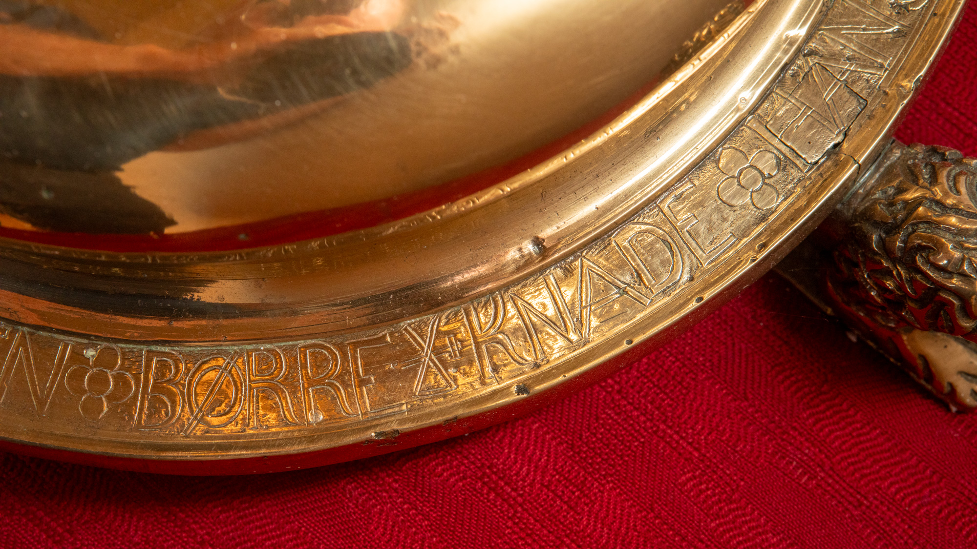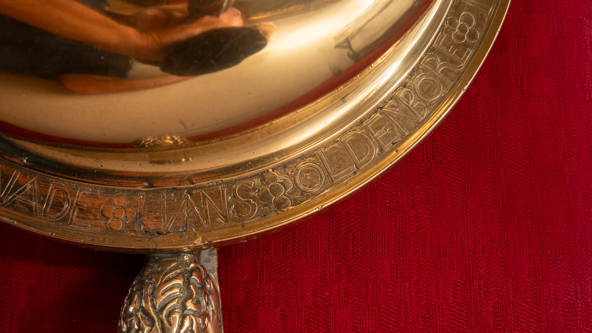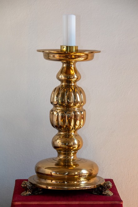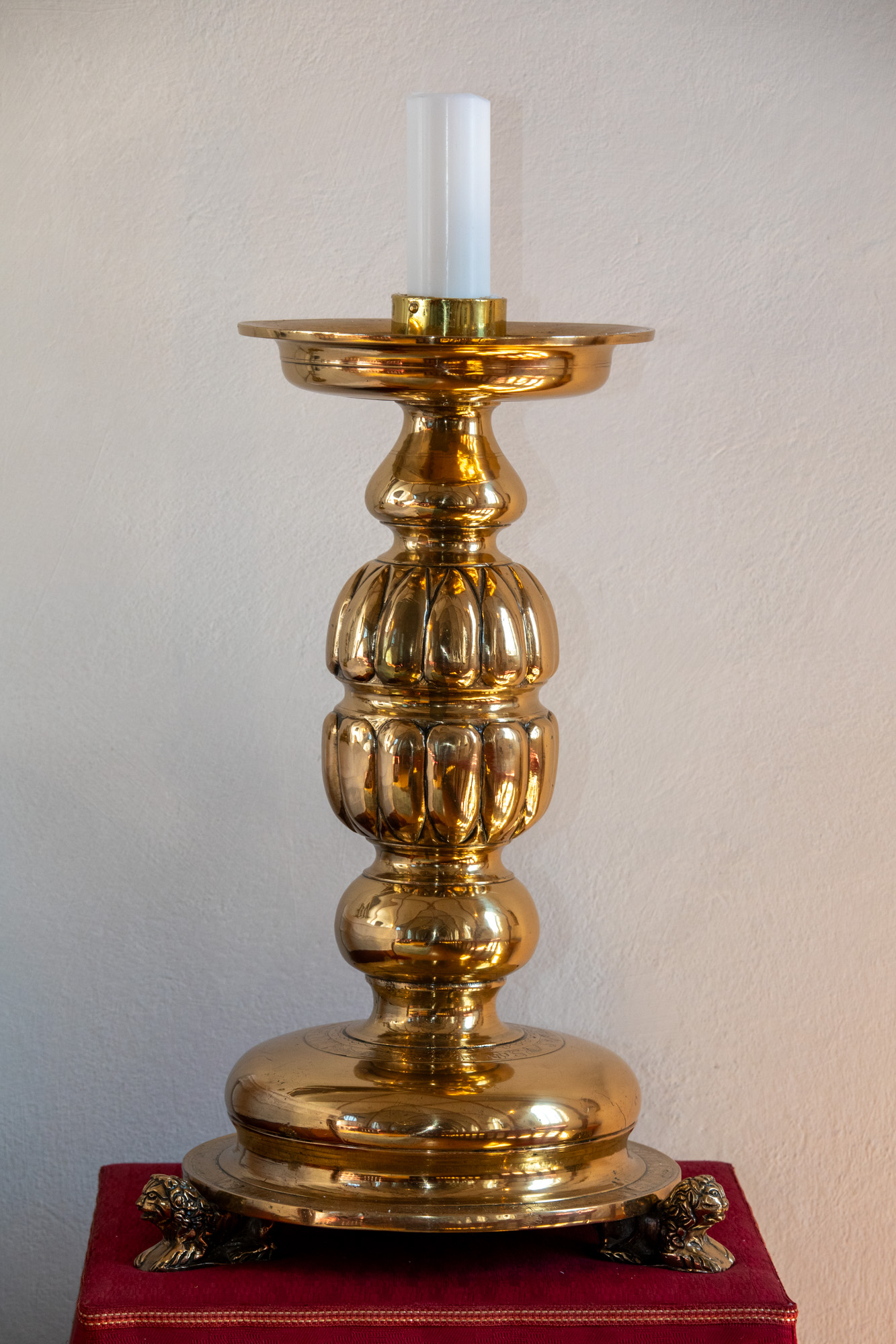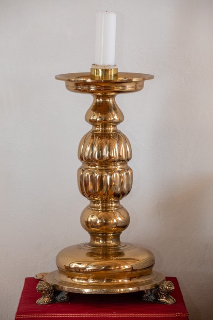 Alterstagerne hviler på liggende løver. Begge stager har lange indskrifter, en kortere rundt om foden og en længere rundt om fodens rand. På den første stage står der:
