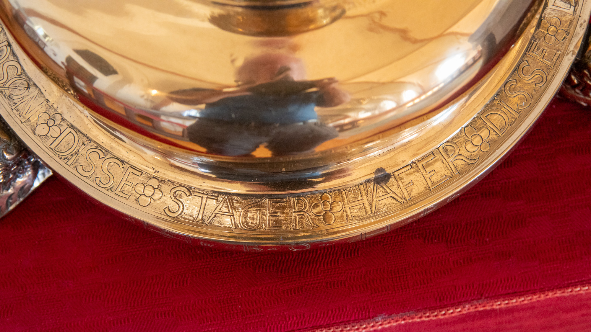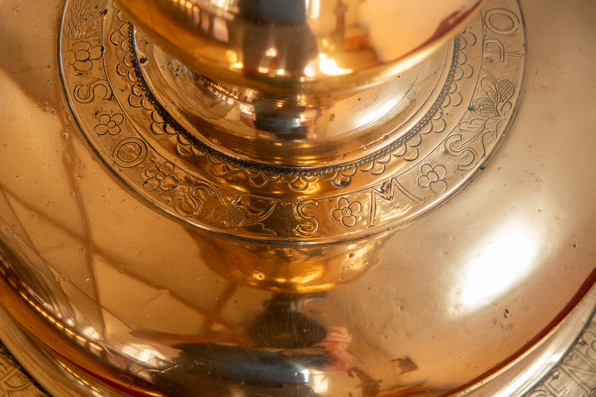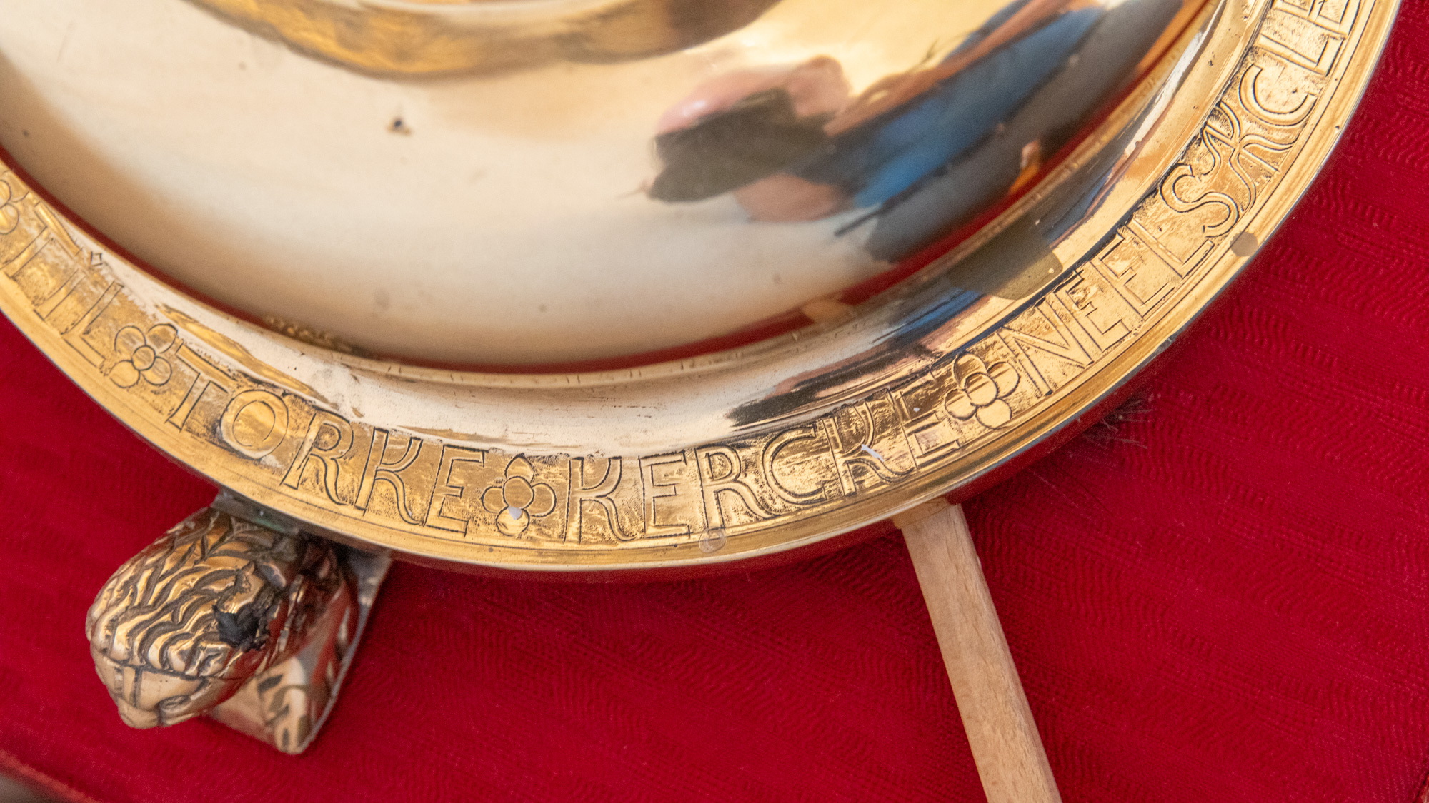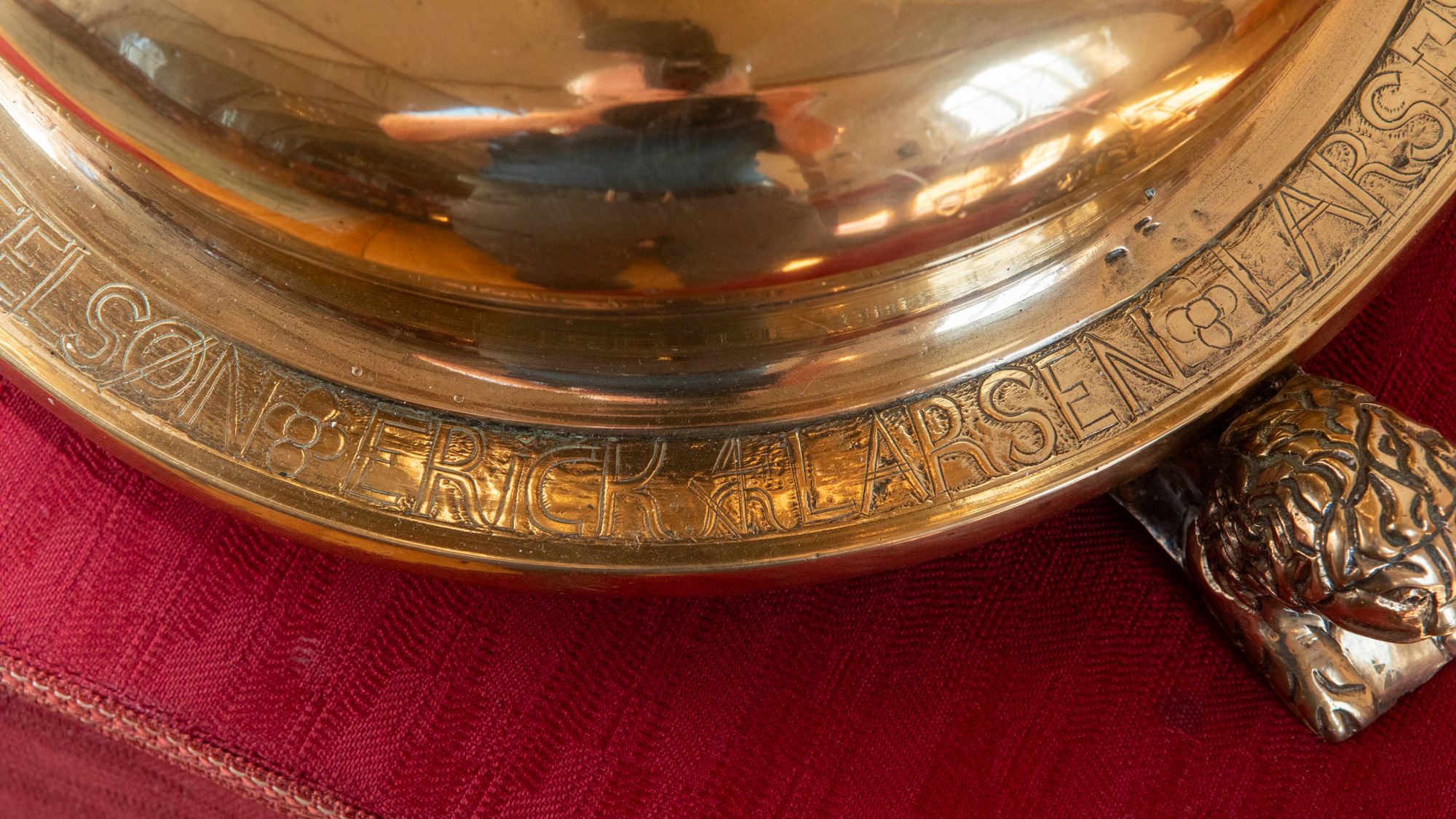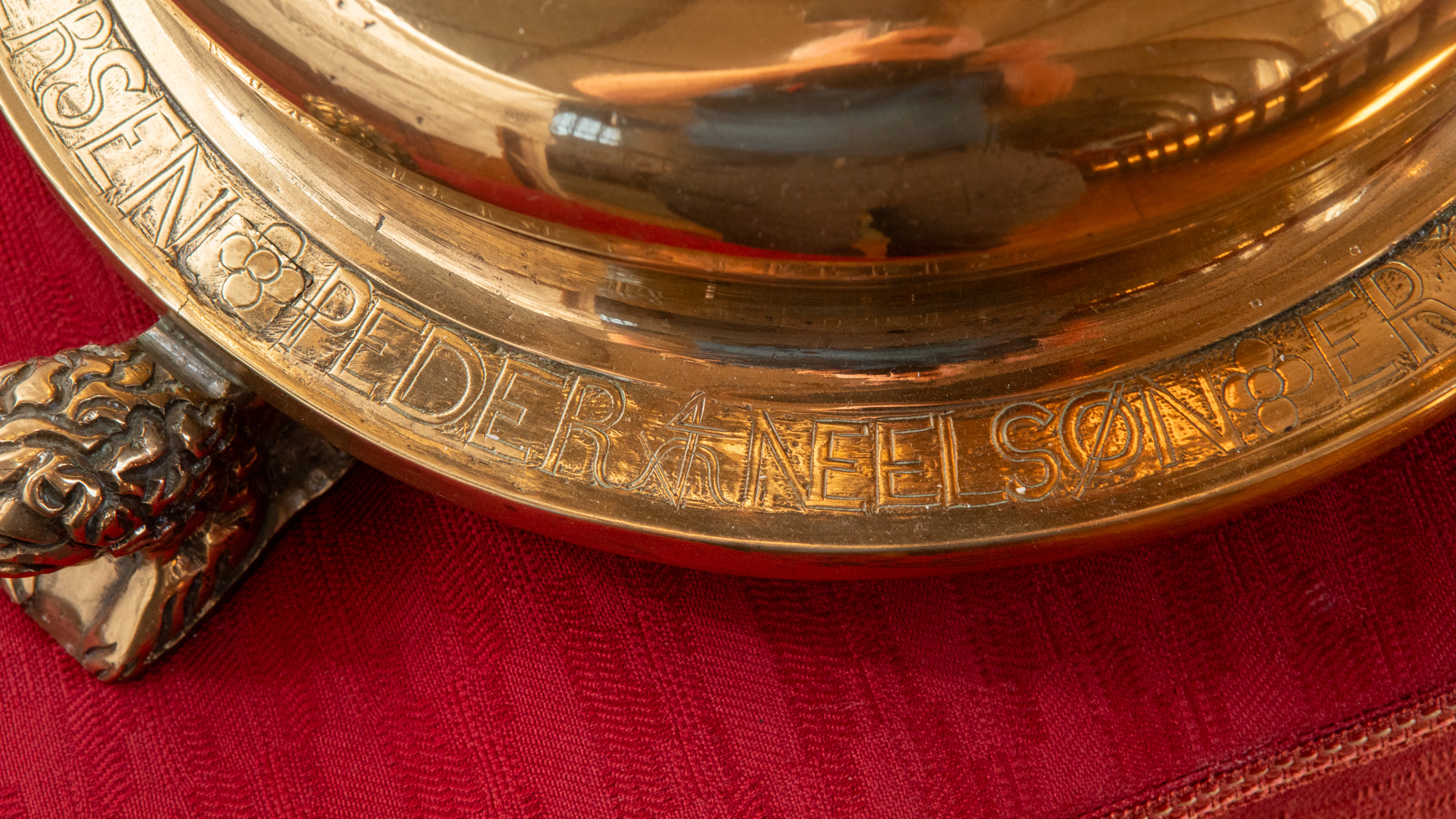 Alterstagerne hviler på liggende løver. Begge stager har lange indskrifter, en kortere rundt om foden og en længere rundt om fodens rand. På den første stage står der: