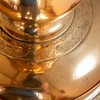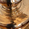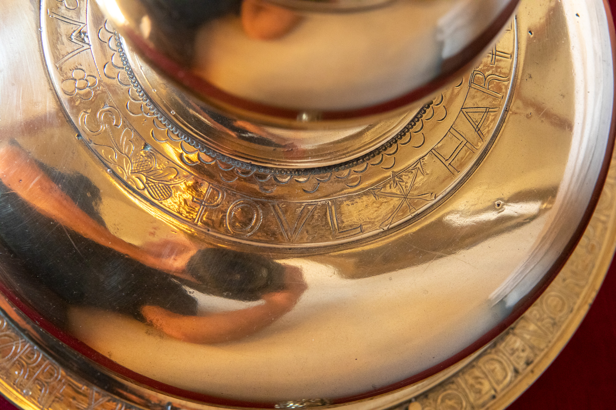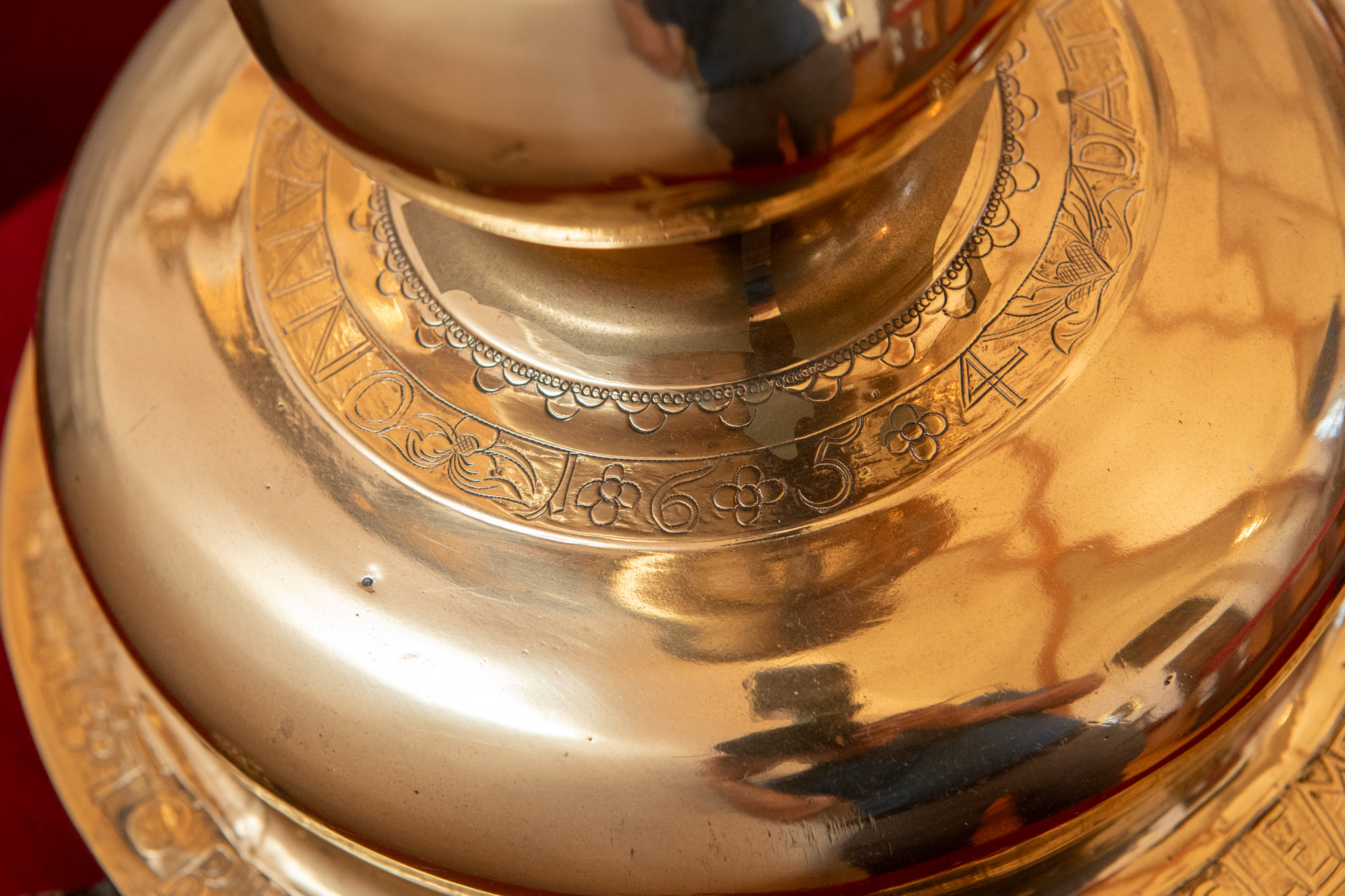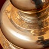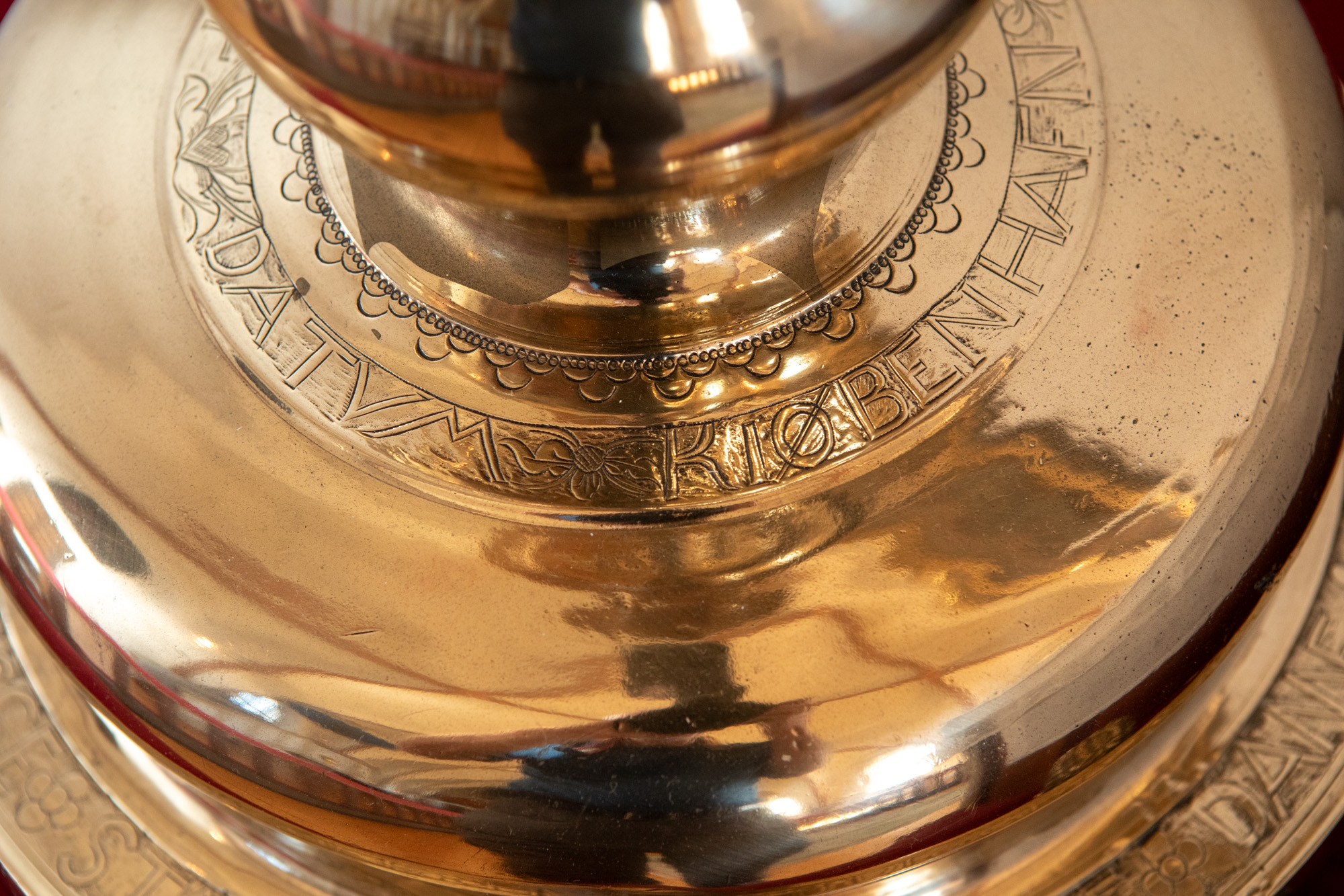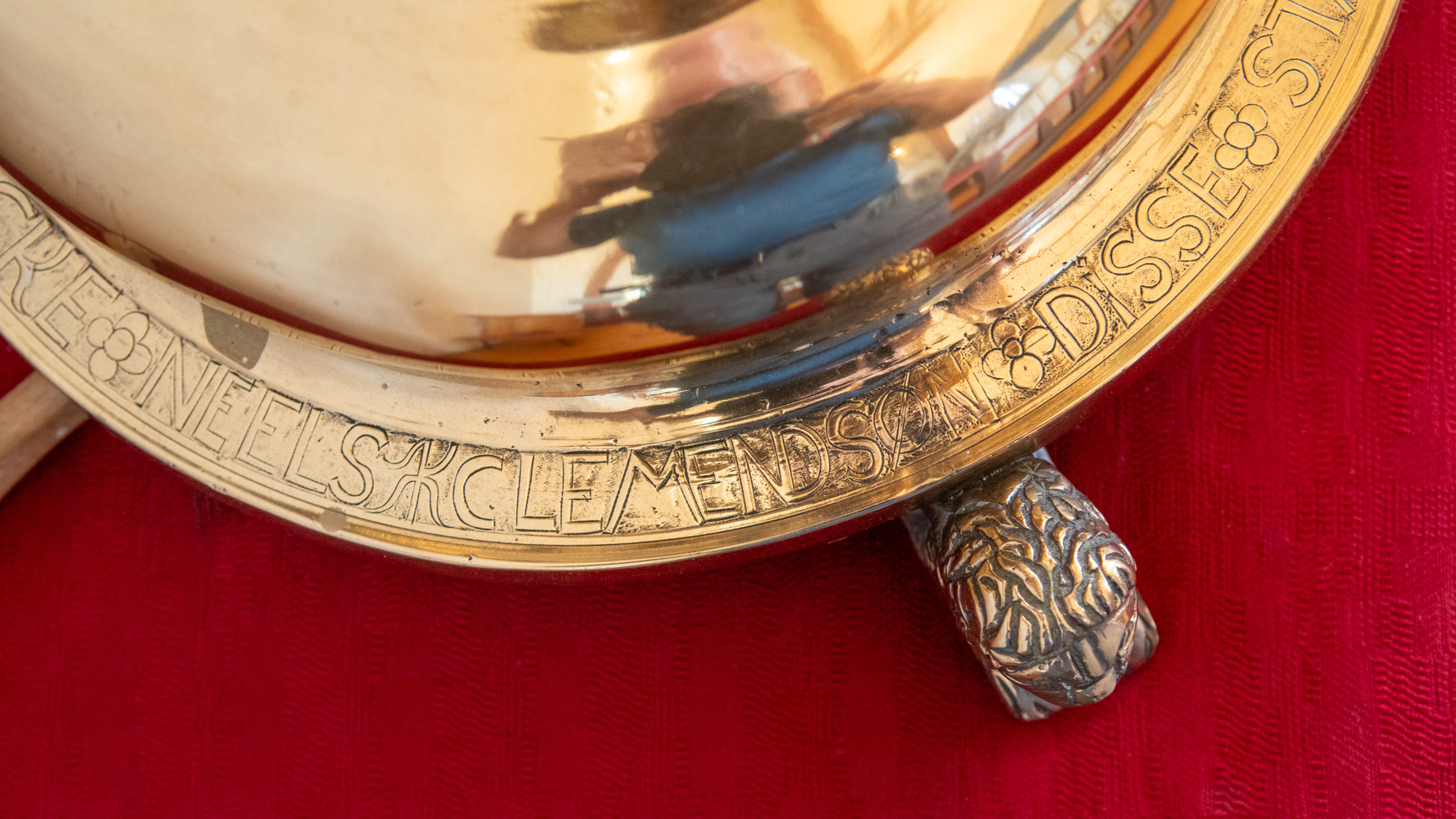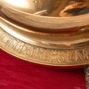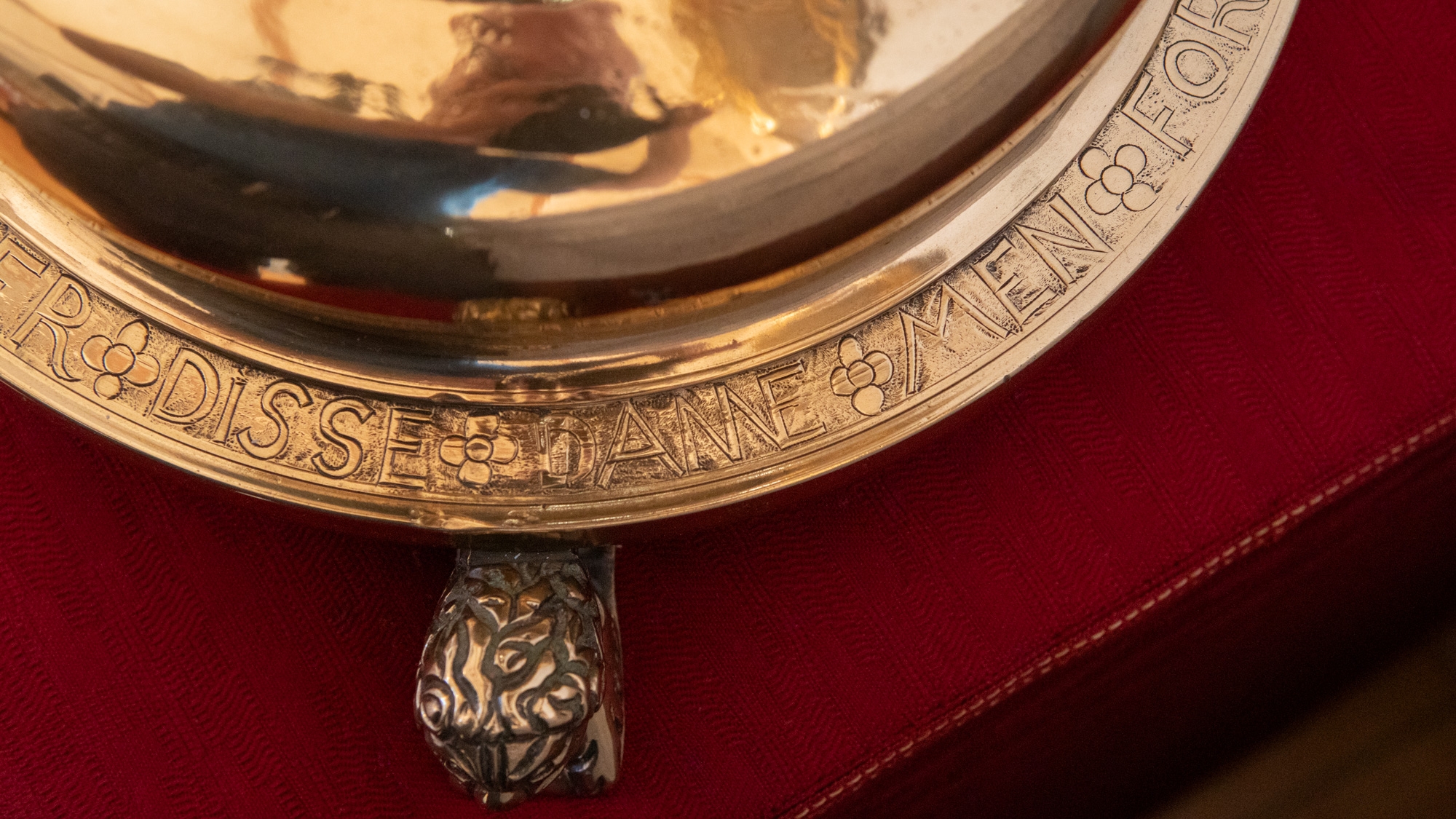 Alterstagerne hviler på liggende løver. Begge stager har lange indskrifter, en kortere rundt om foden og en længere rundt om fodens rand. På den første stage står der:
