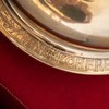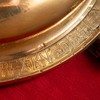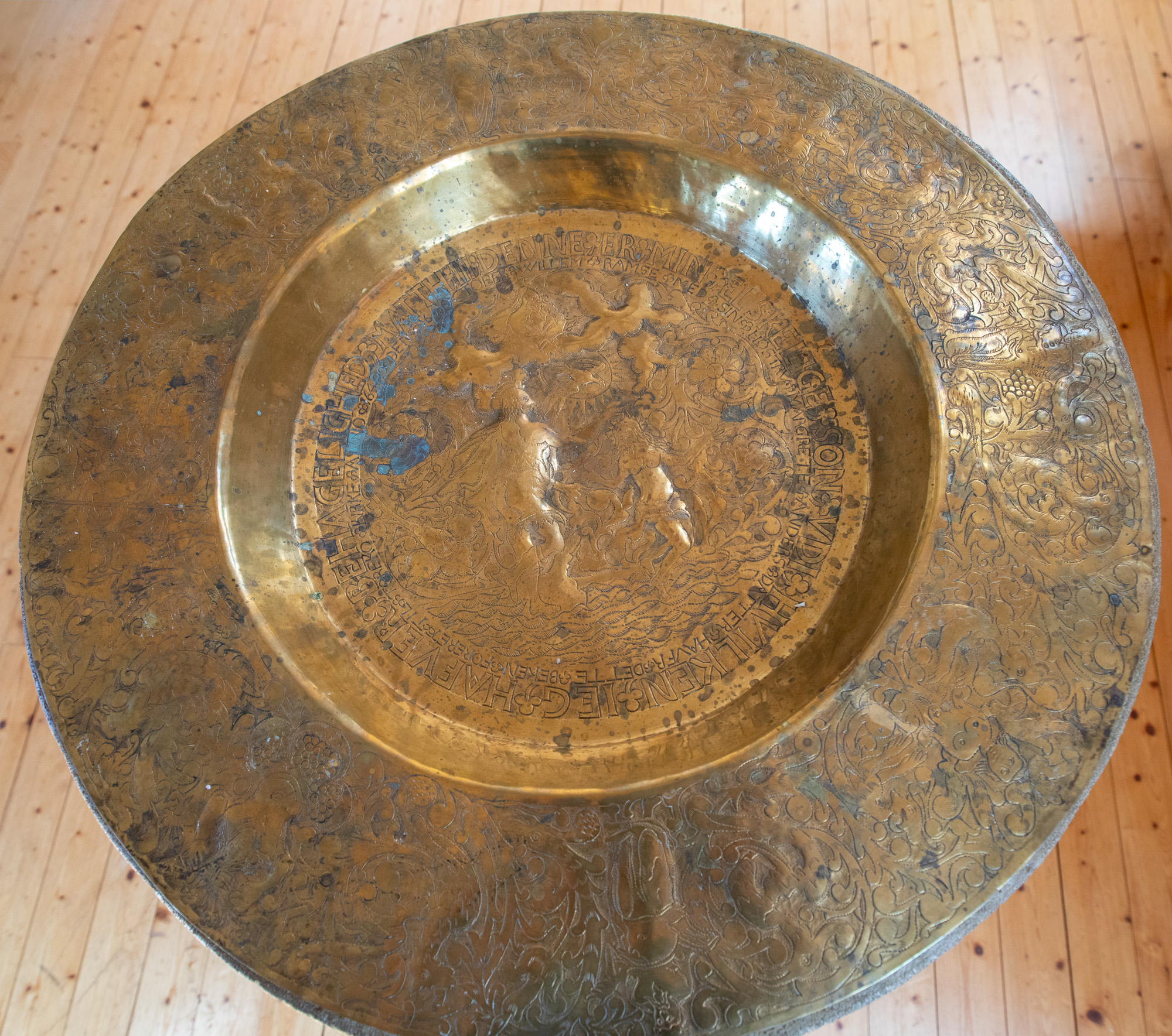 På fadets rand er der bladranker, frugtklaser, dyr og mennesker.