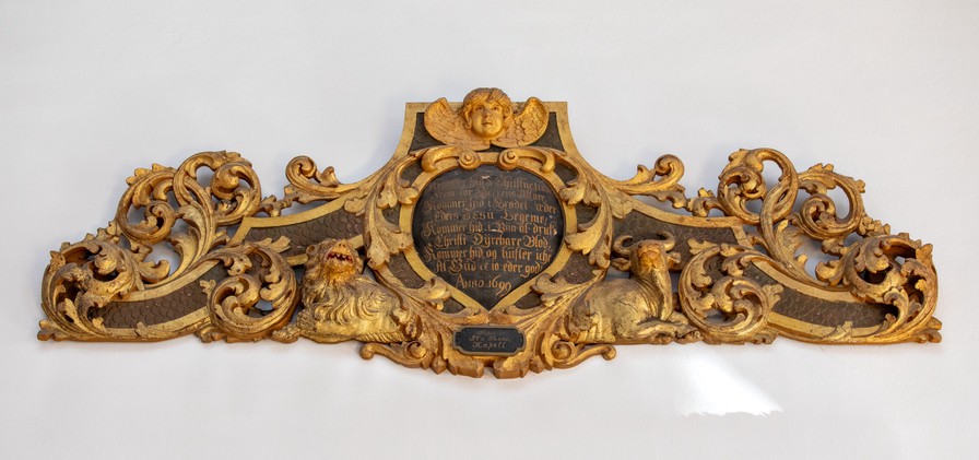 På korvæggen over alterbilledet hænger den øverste ramme fra noget, der formodentlig har været en altertavle. Tekstfeltet flaneres af en løve og okse, Markus og Lukas. I tekstfeltet står der: