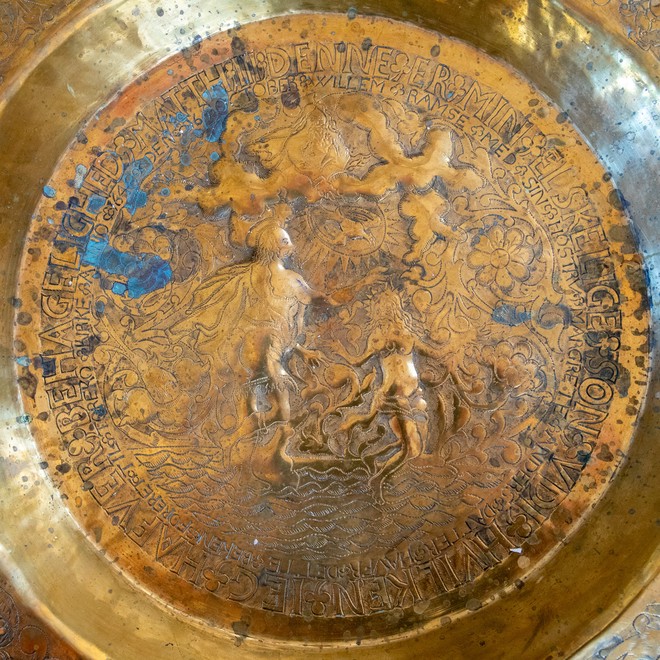 Dåbsfadet har Jesu Dåb i bunden af fadet. Langs den indvendig kant er der to tekstlinjer: