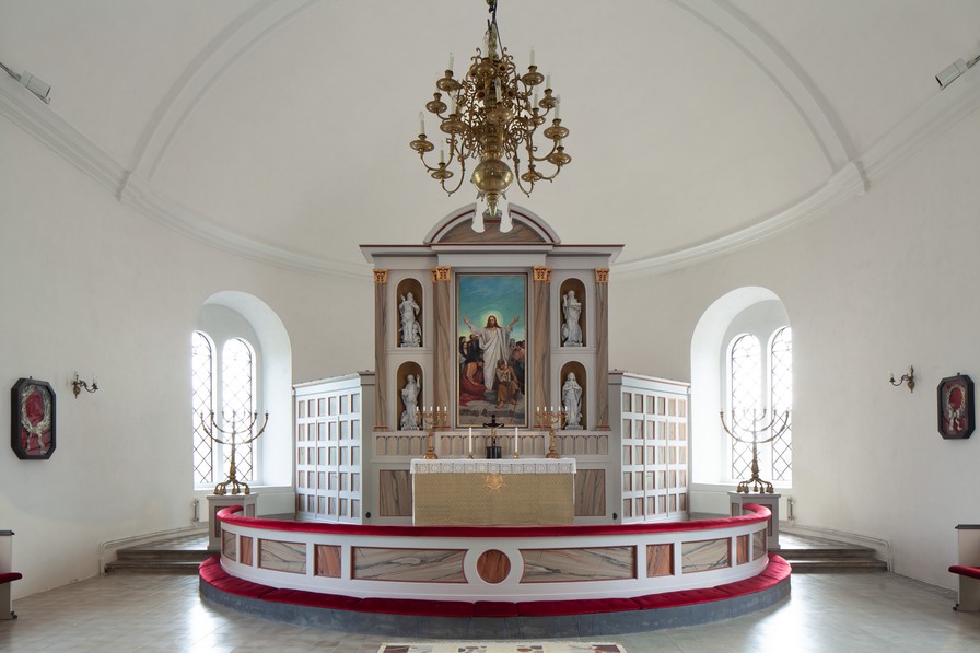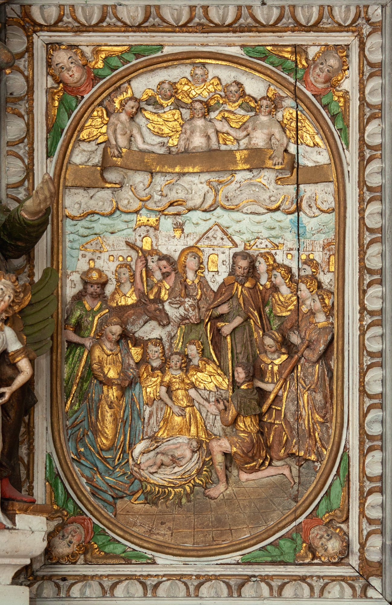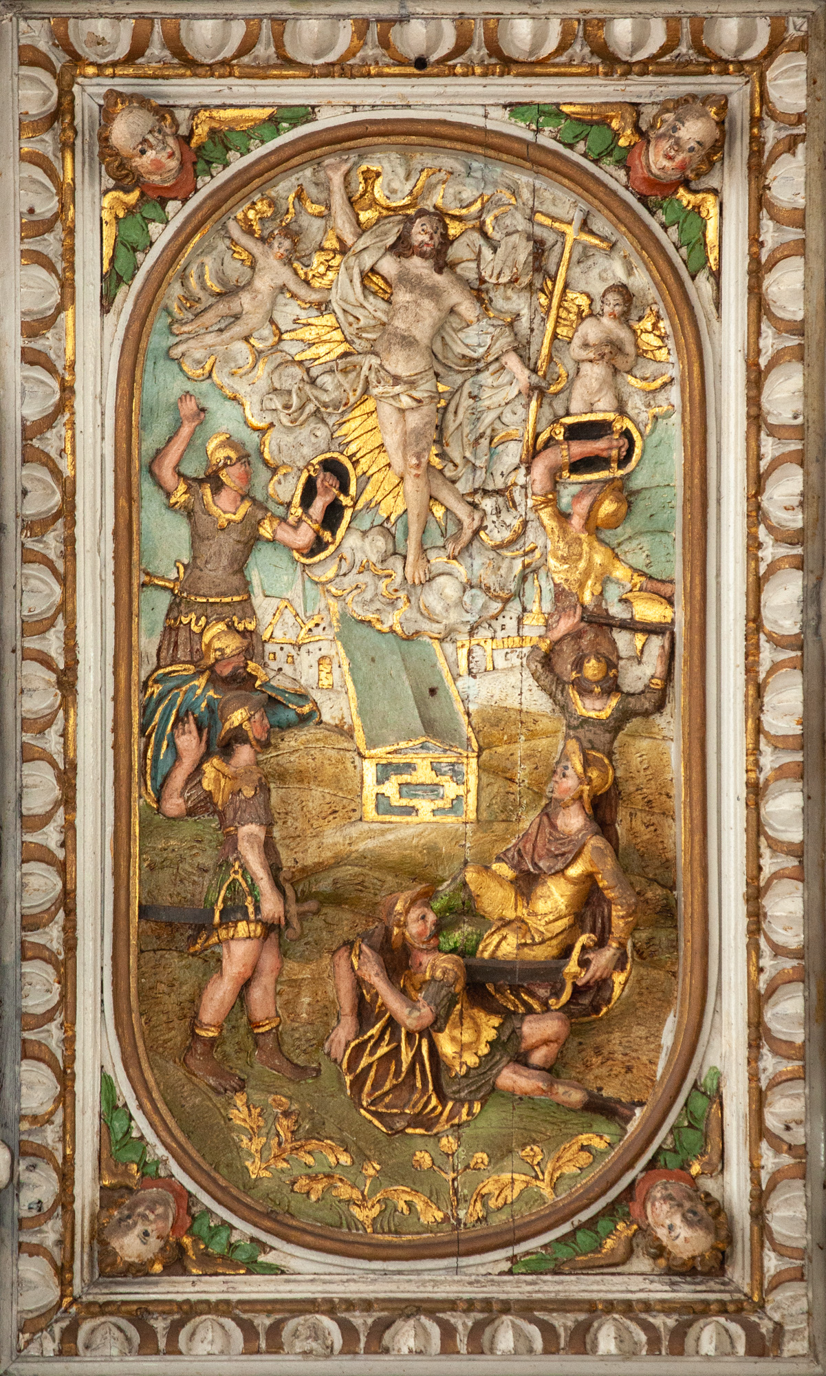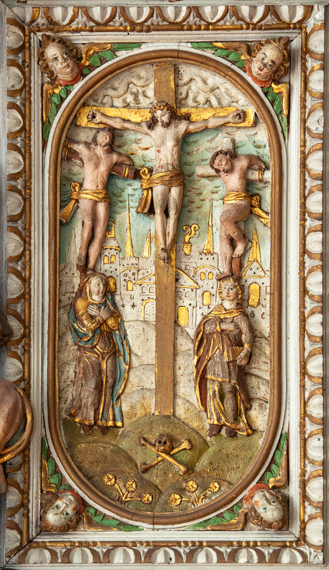 Storfelterne har ovale relieffer med fremstillinger af Jesu Fødsel, Korsfæstelsen, Opstandelsen, Himmelfarden og Pinseunderet. Motiverne er indsat i ovale rammer med engle i sviklerne.