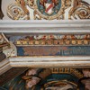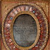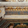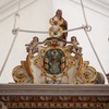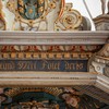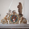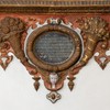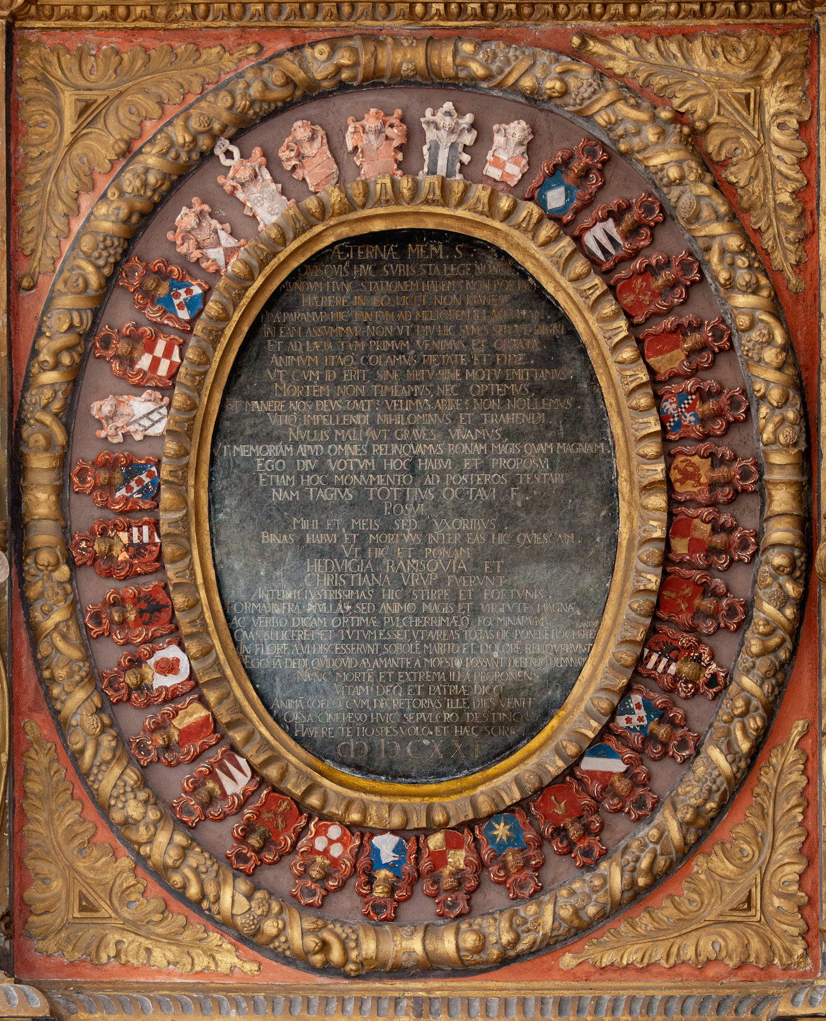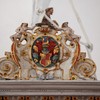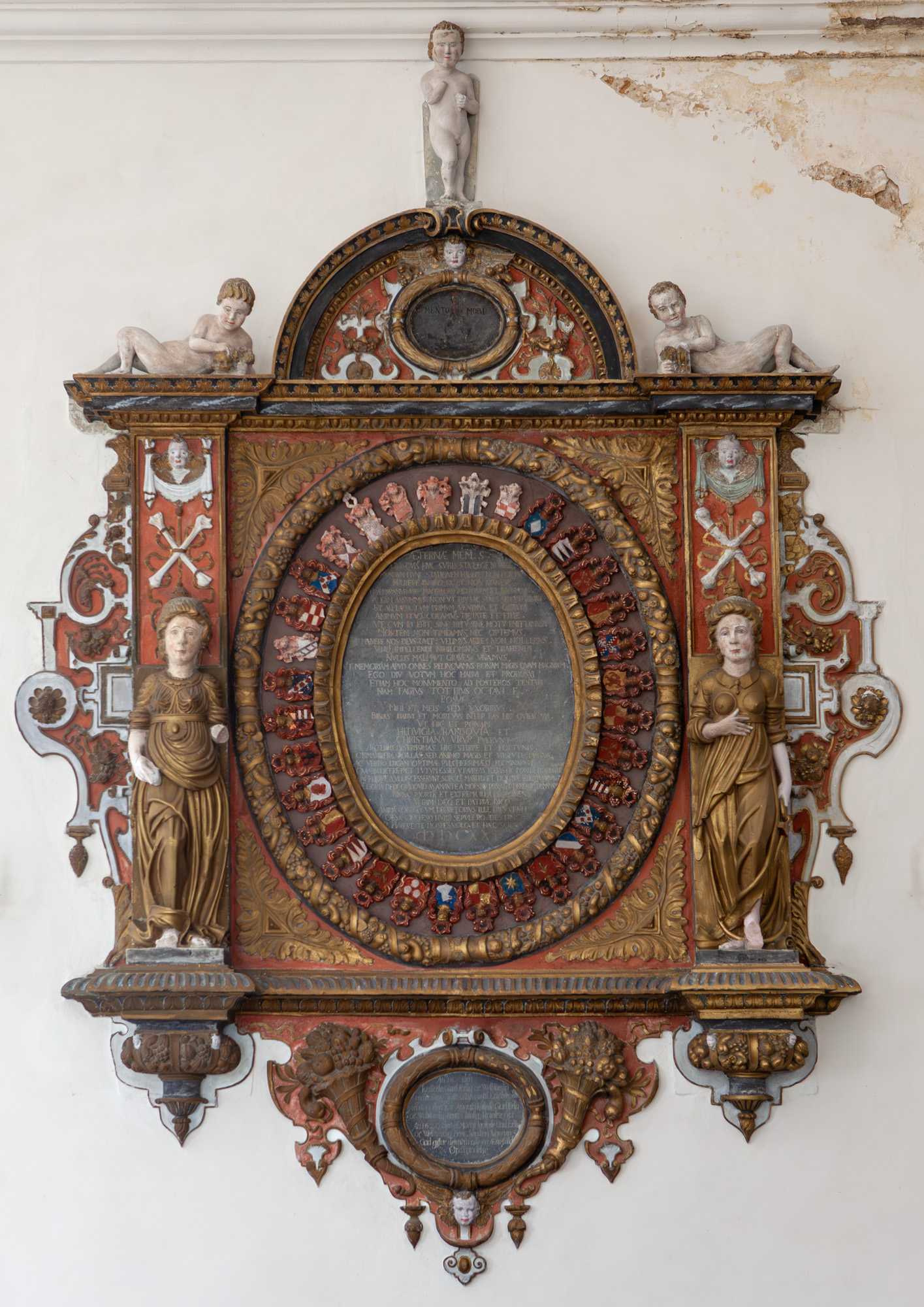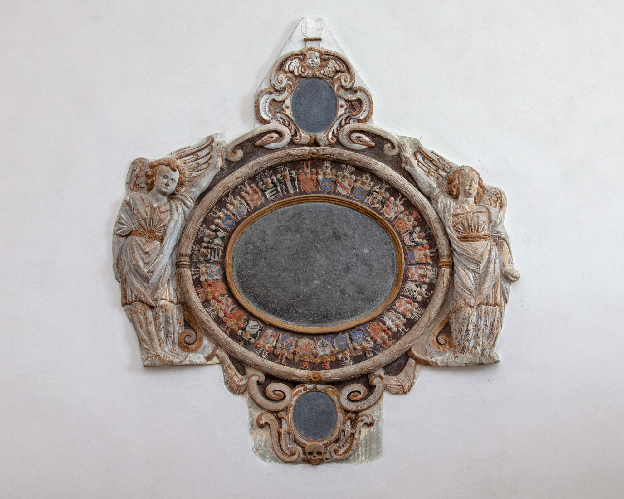 En oval tekstavle, som er helt udvisket, omgives af 2 gange 16 anevåben. Dette omgives af en laurbærkrans. Tavlen flankeres af to engle.