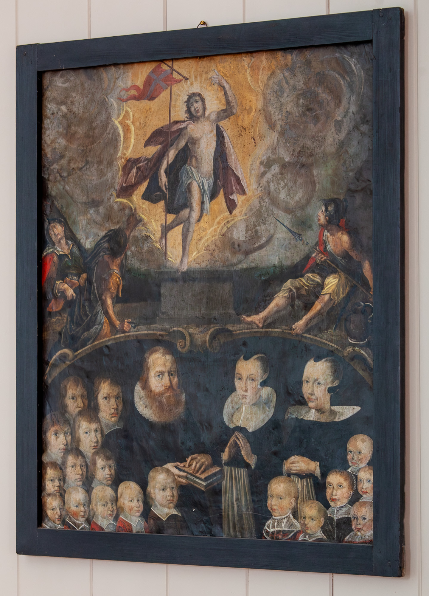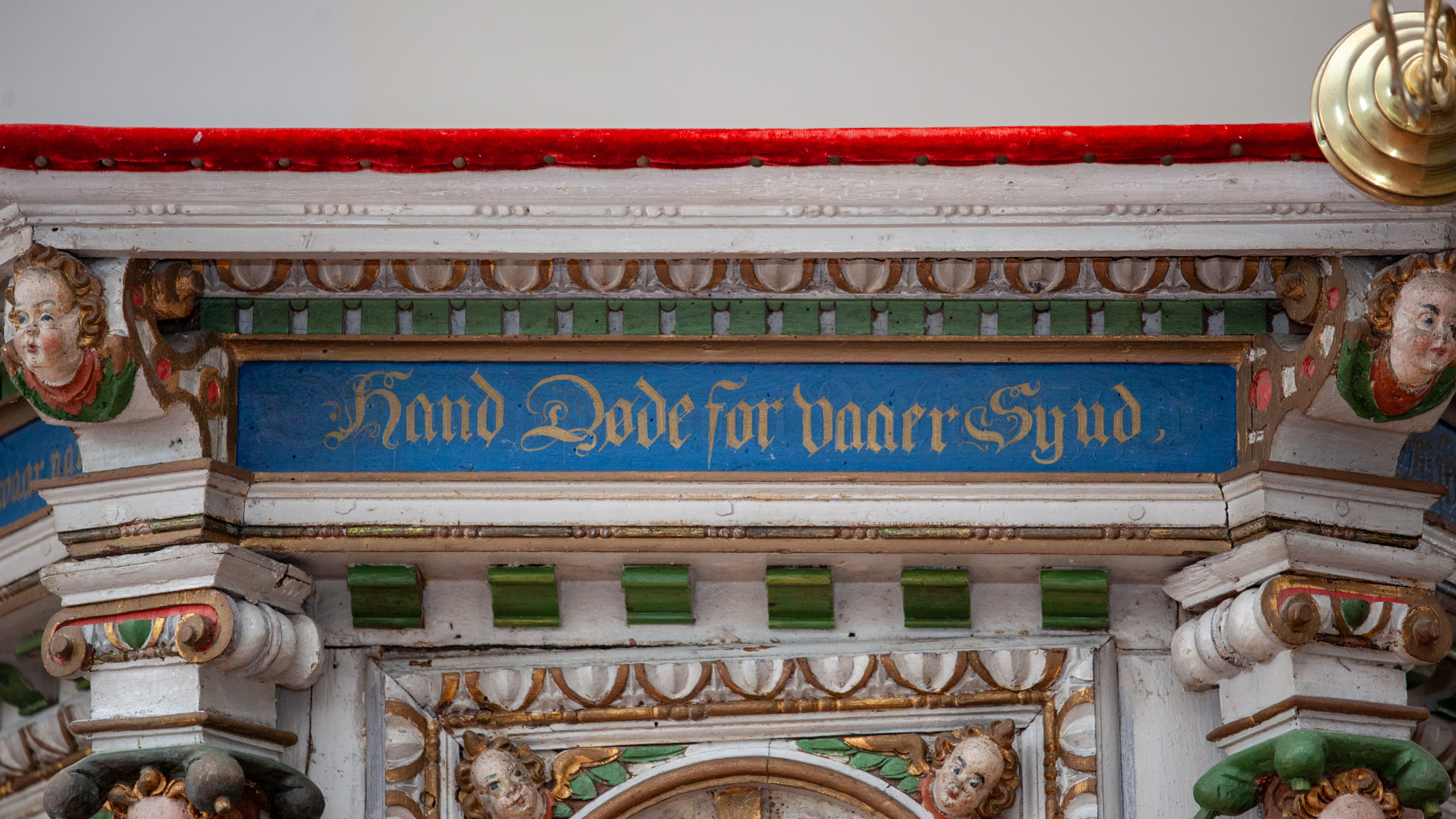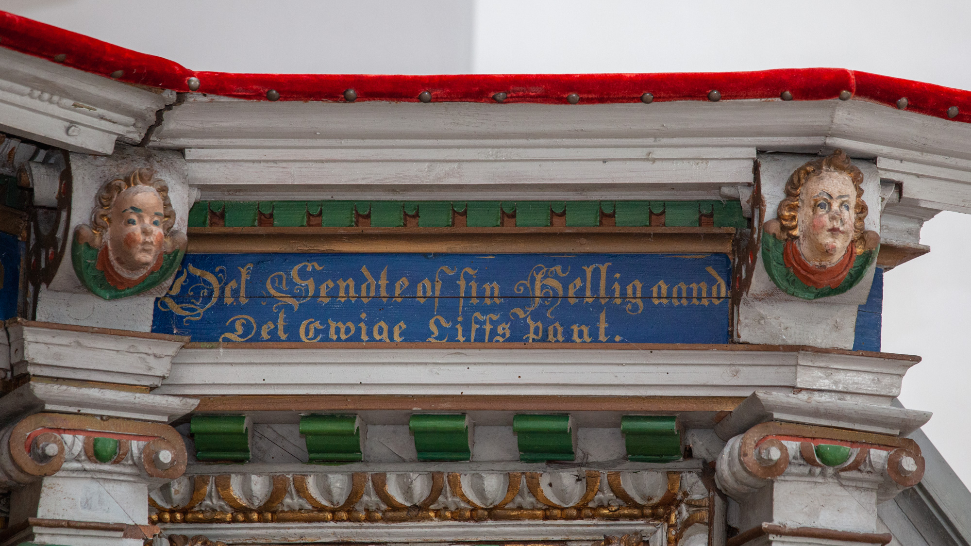 I de øverste smalfelter står der: ”Hand blef Menneske af waar natur, Hand Døde for vaaer Synd, Opstod for vaar Retferdighed, Opfoer for Vaar Salighed Ock Sendte af sin helligaand Det Ewige Liffs pant.”