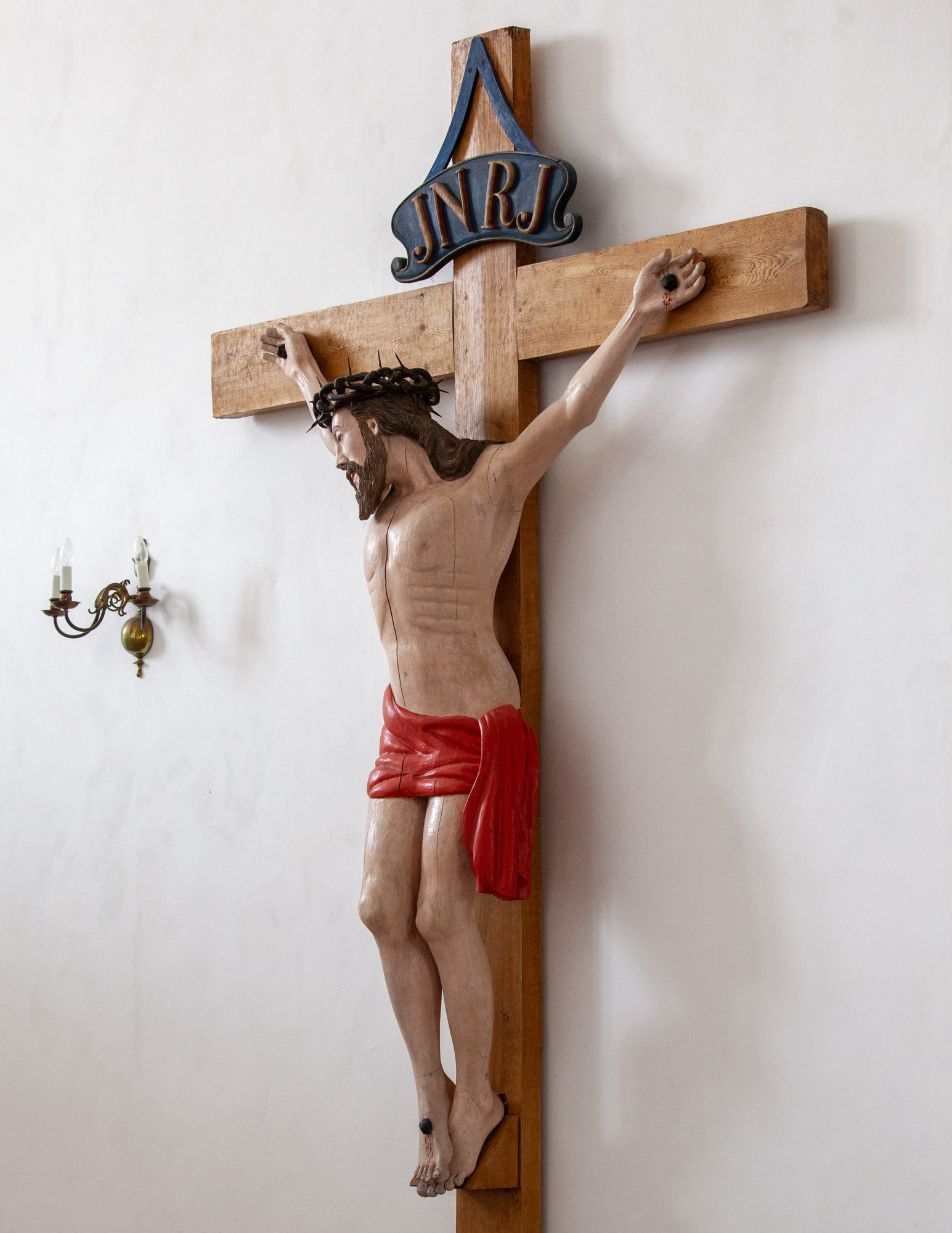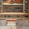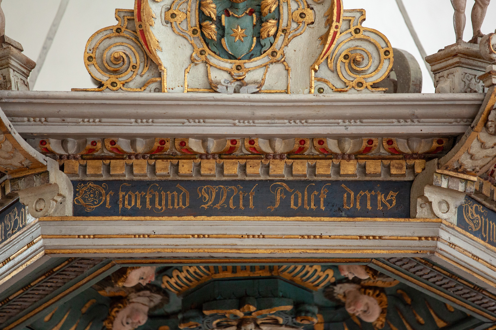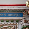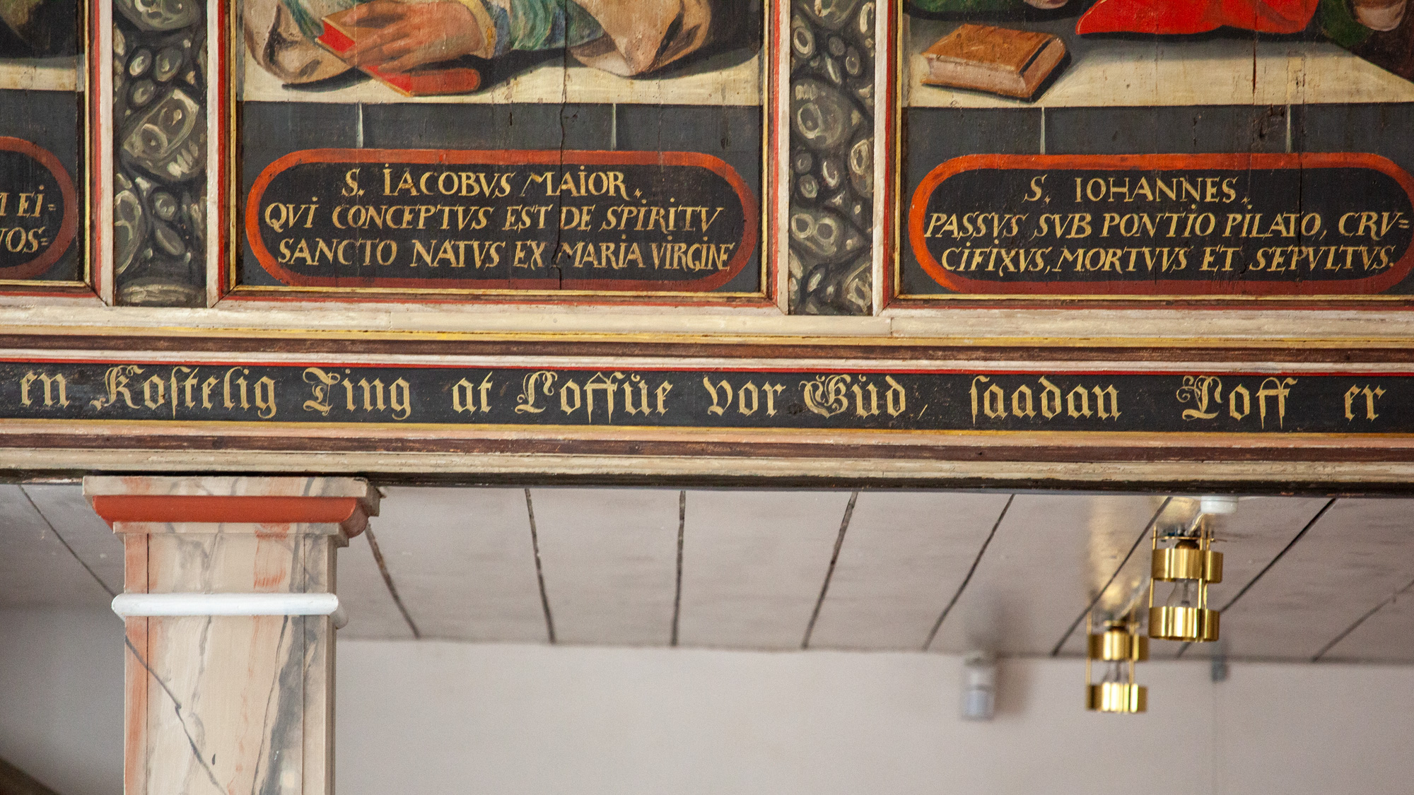 I de øverste smalfelter står der: ”Hand blef Menneske af waar natur, Hand Døde for vaaer Synd, Opstod for vaar Retferdighed, Opfoer for Vaar Salighed Ock Sendte af sin helligaand Det Ewige Liffs pant.”