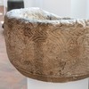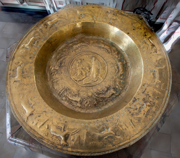 Motivet i dåbsfadet er Mariæ Bebudelse. Det omgives af springende hjorte. På fadets rand er der ligeledes hjorte foruden fugle.