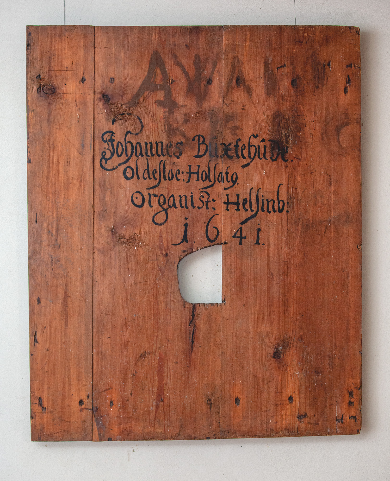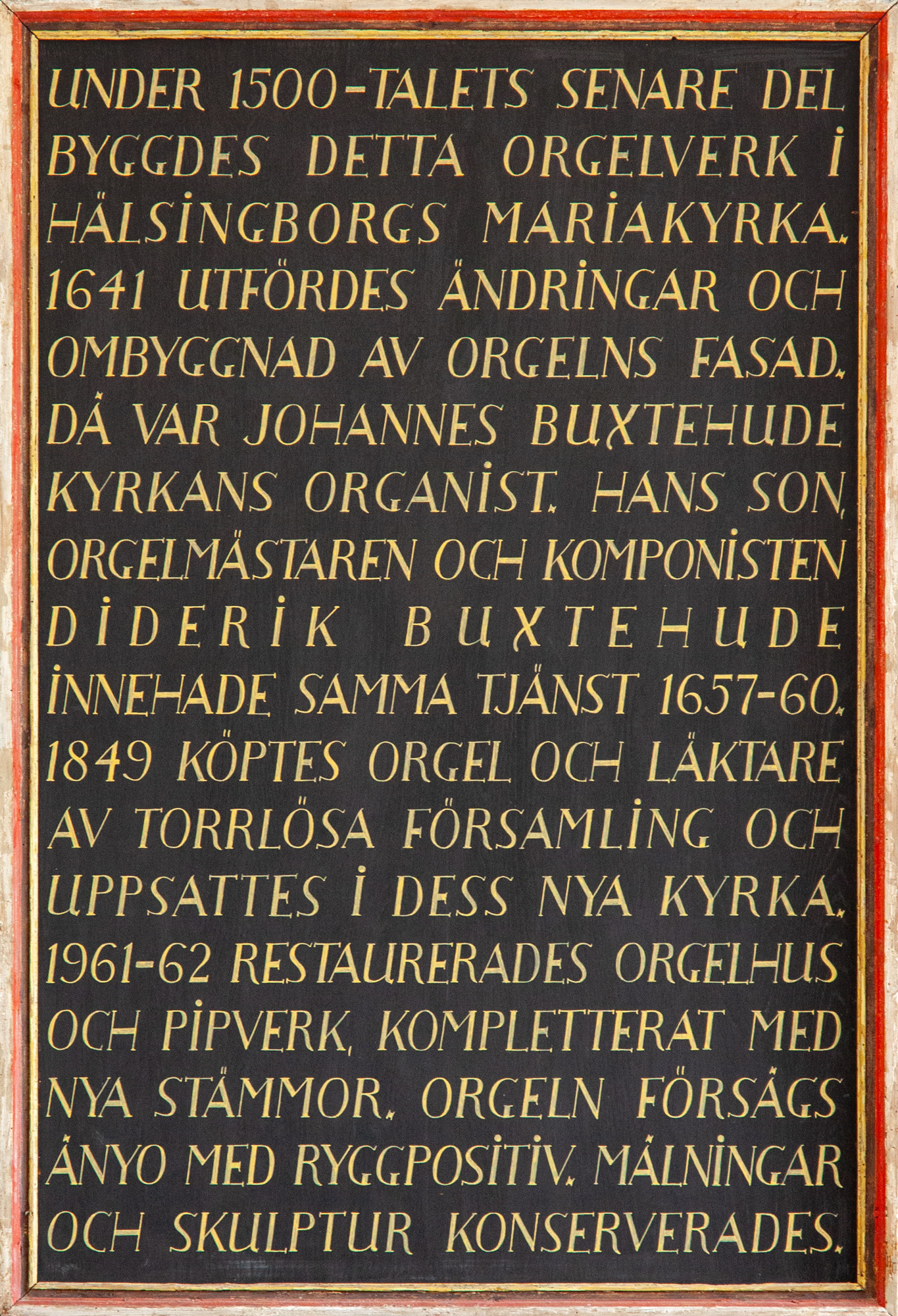 Orglet kaldes for Buxtehude-orglet, idet Johannes Buxtehude var organist i Helsingborg. Han har signeret en trælem i orgelværkets nordvæg. I årene 1657-1660 var sønnen Dietrich Buxtehude organist i kirken. Han blev herefter organist og komponist i Lübeck.