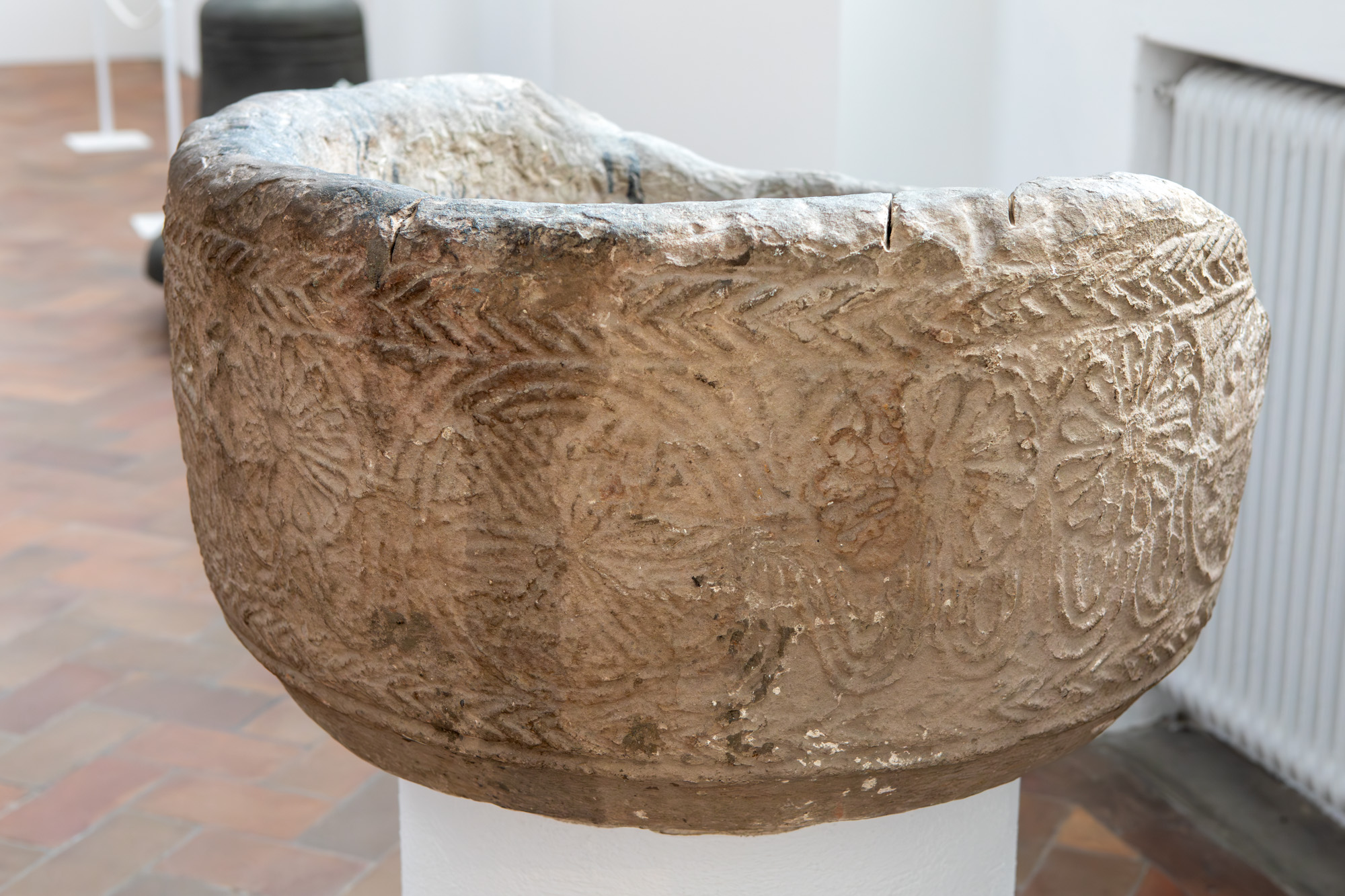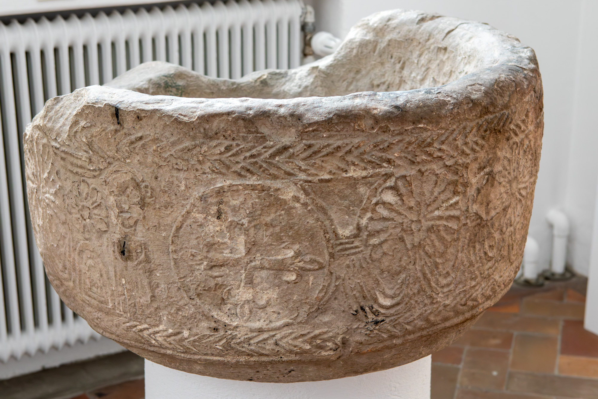 Den middelalderlige døbefont findes på LUHM. Kun kummen er bevaret. Den tilhører Torløsegruppen. Mellem to tovstave har den en udsmykning i lavt relief bestående af mange varianter af palmetter og ringe med forskellige former for kors.