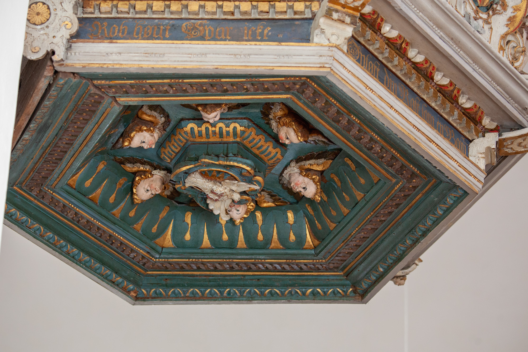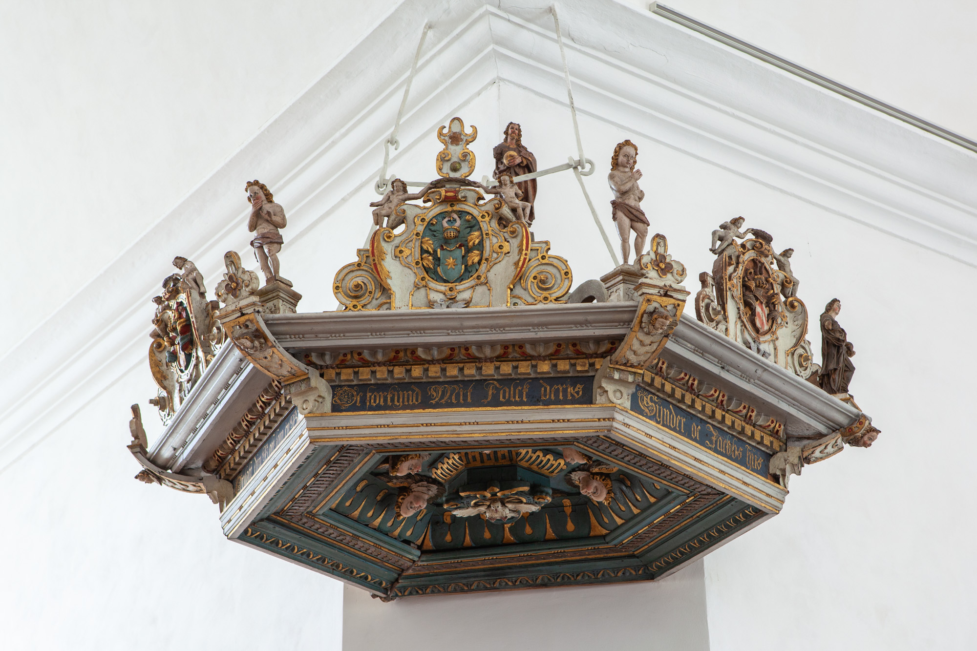 Lydhimlen har våbenkartoucher for Tage Ottesen Thott og hans hustruer og mors våben. Mellem våbenskjoldene står putti og en dyd. Teksten på lydhimlen er: ”Rob høyt Spar icke Opløft din Røst som en Basun Oc forkÿnd Mit Folck deris Sÿnder, oc Jacobs hus deris Offuertredelse.” (Es. 58,1).