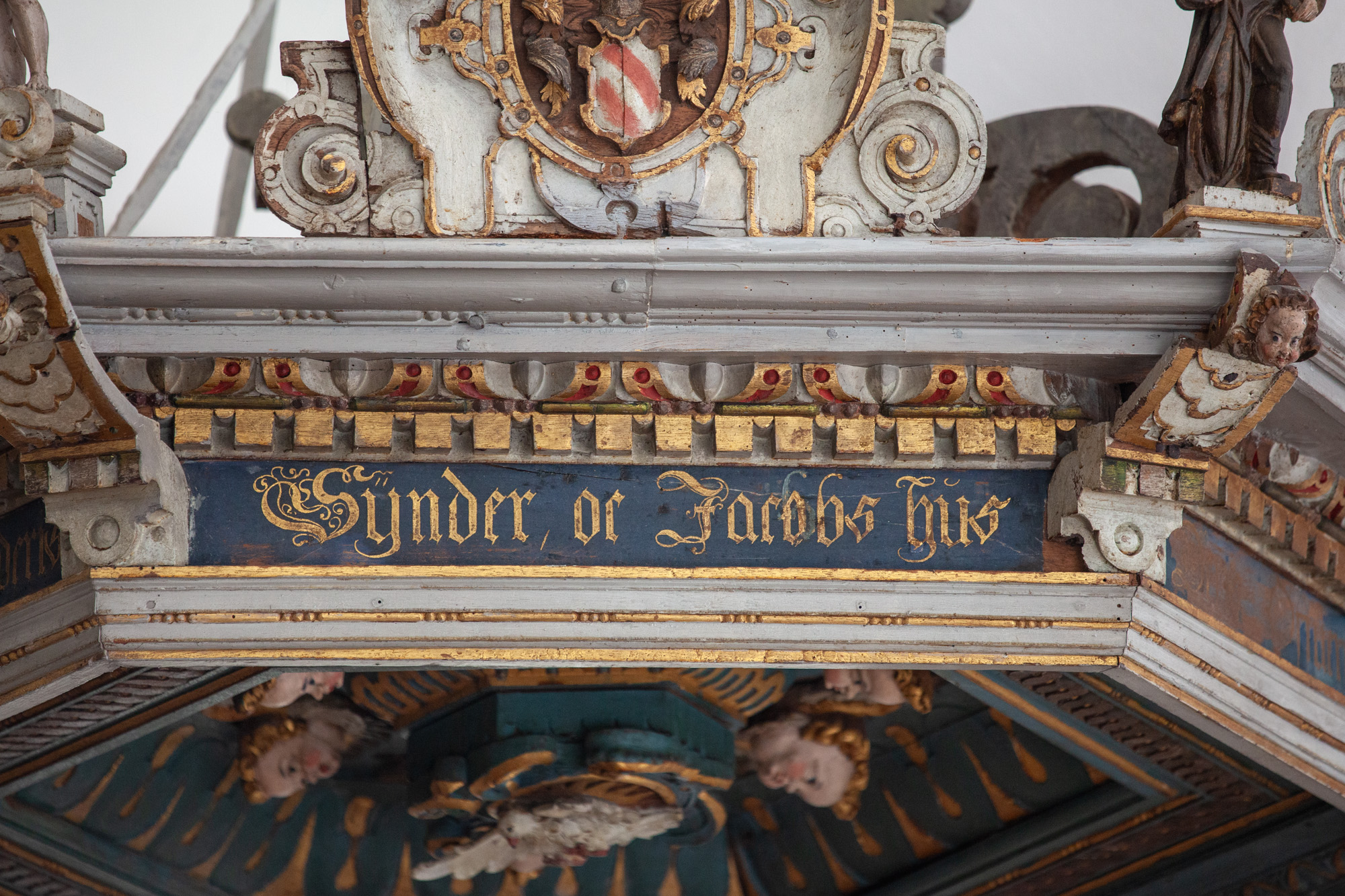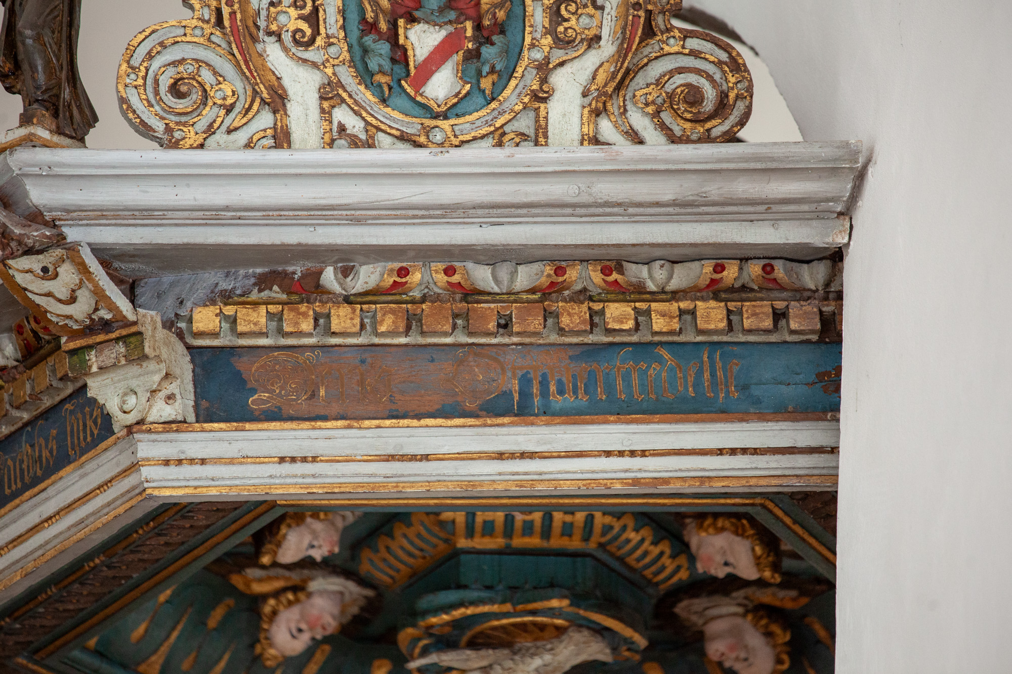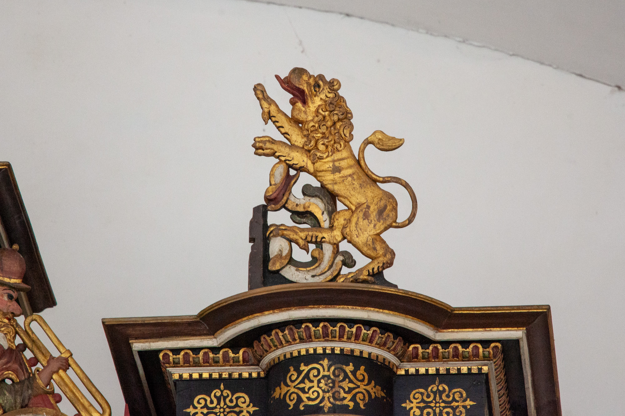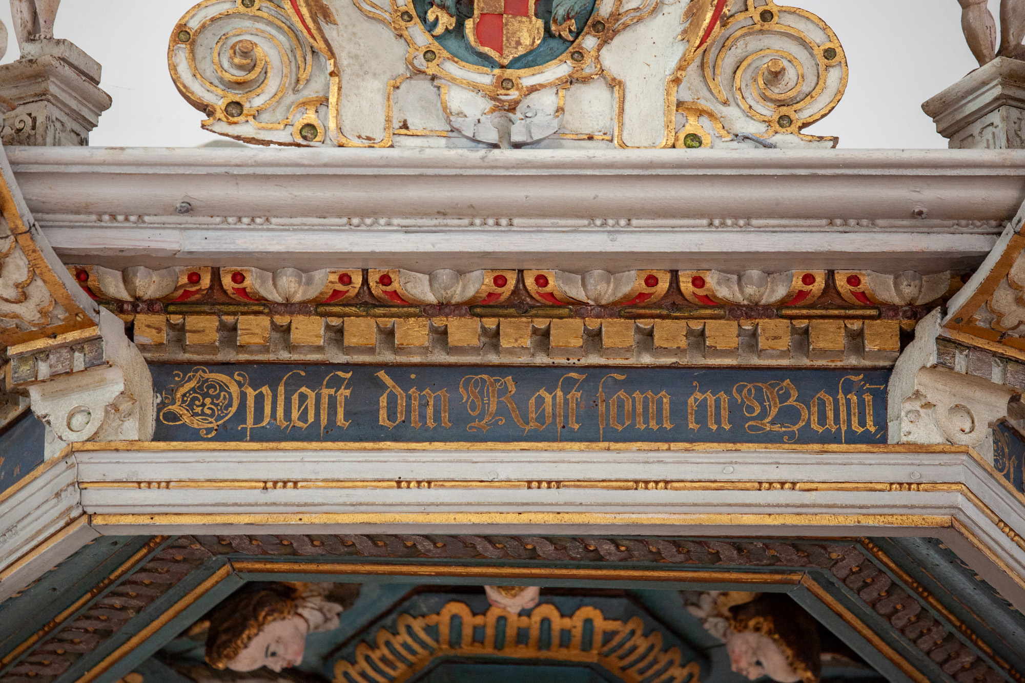 Der er ingen smalfelter forneden, men derimod en kraftig gesims med skiftevis løvehoveder og engleansigter på hjørnerne. På hængestykkerne under gesimsen er der groteske ansigtsmasker.