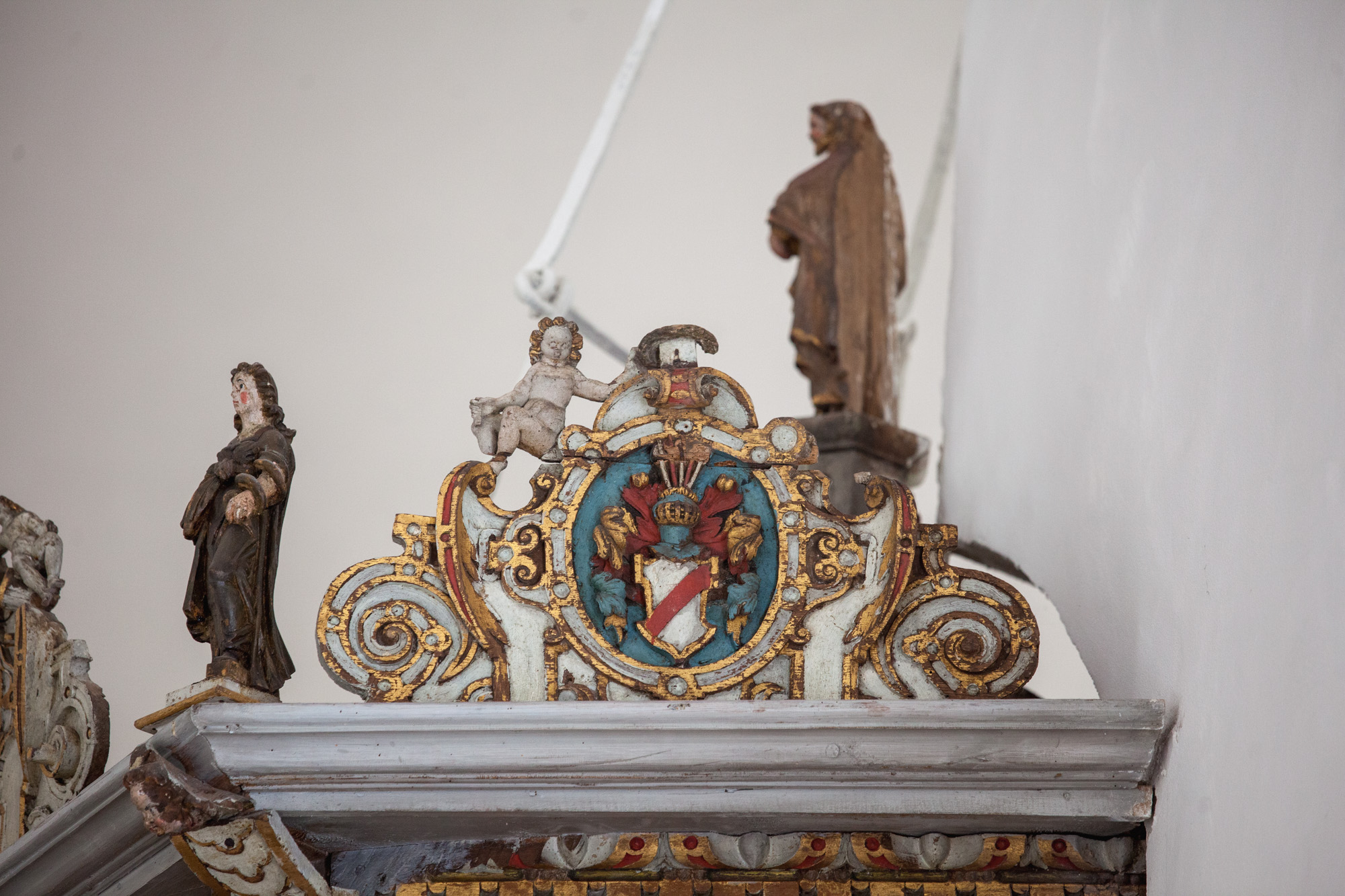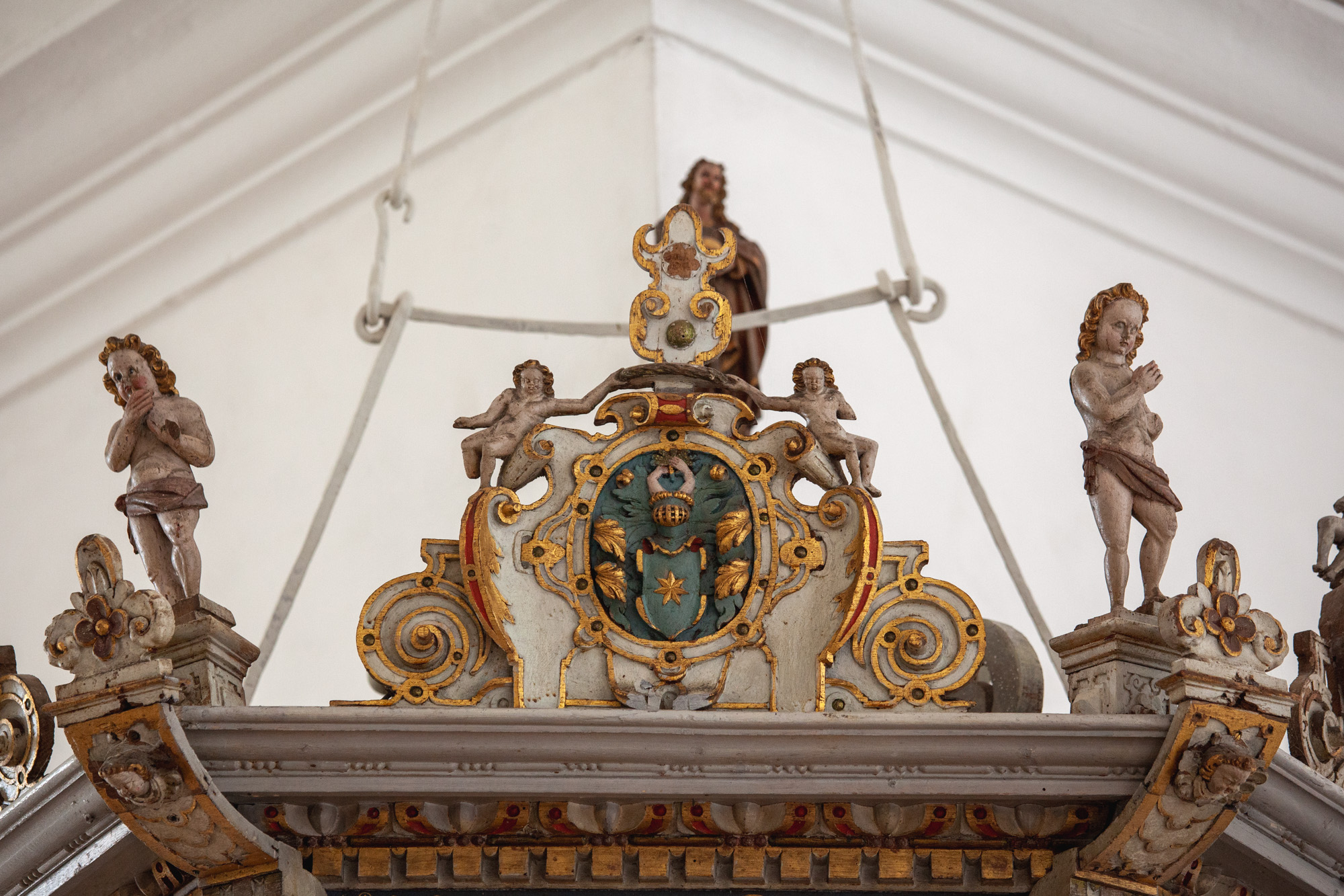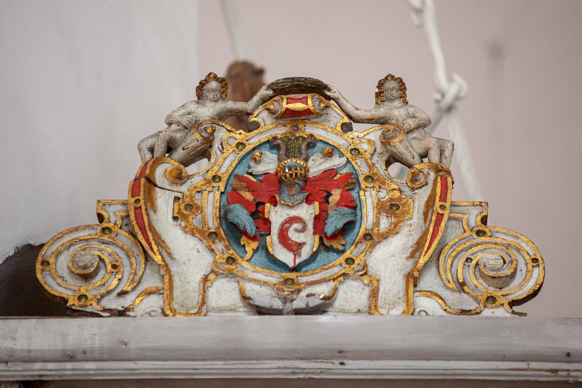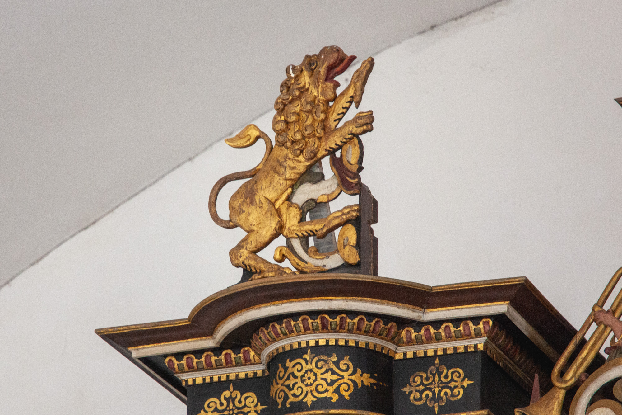 Der er ingen smalfelter forneden, men derimod en kraftig gesims med skiftevis løvehoveder og engleansigter på hjørnerne. På hængestykkerne under gesimsen er der groteske ansigtsmasker.