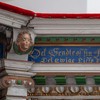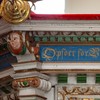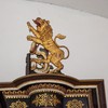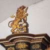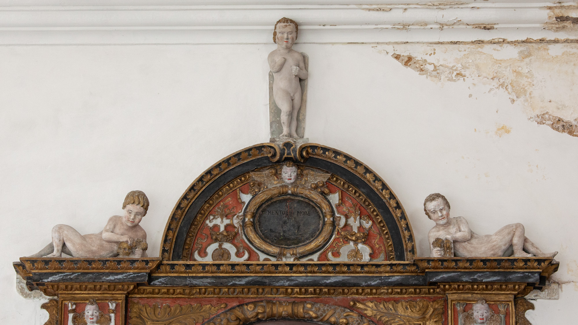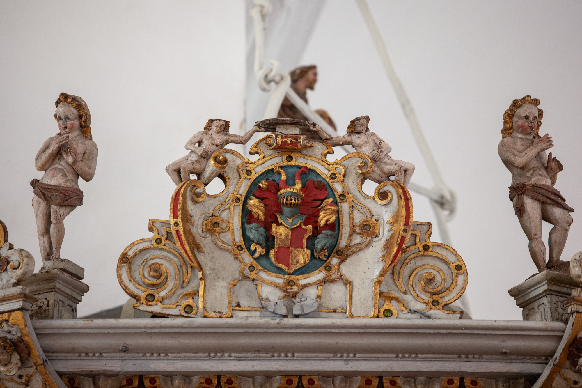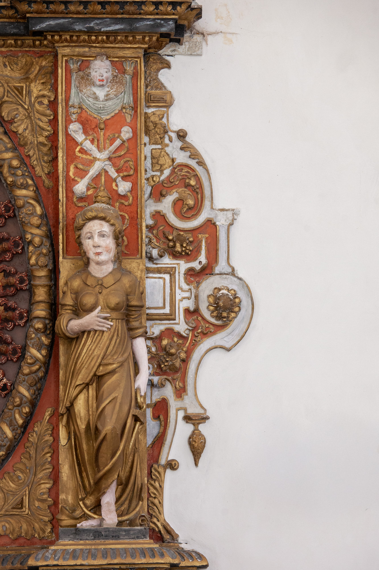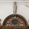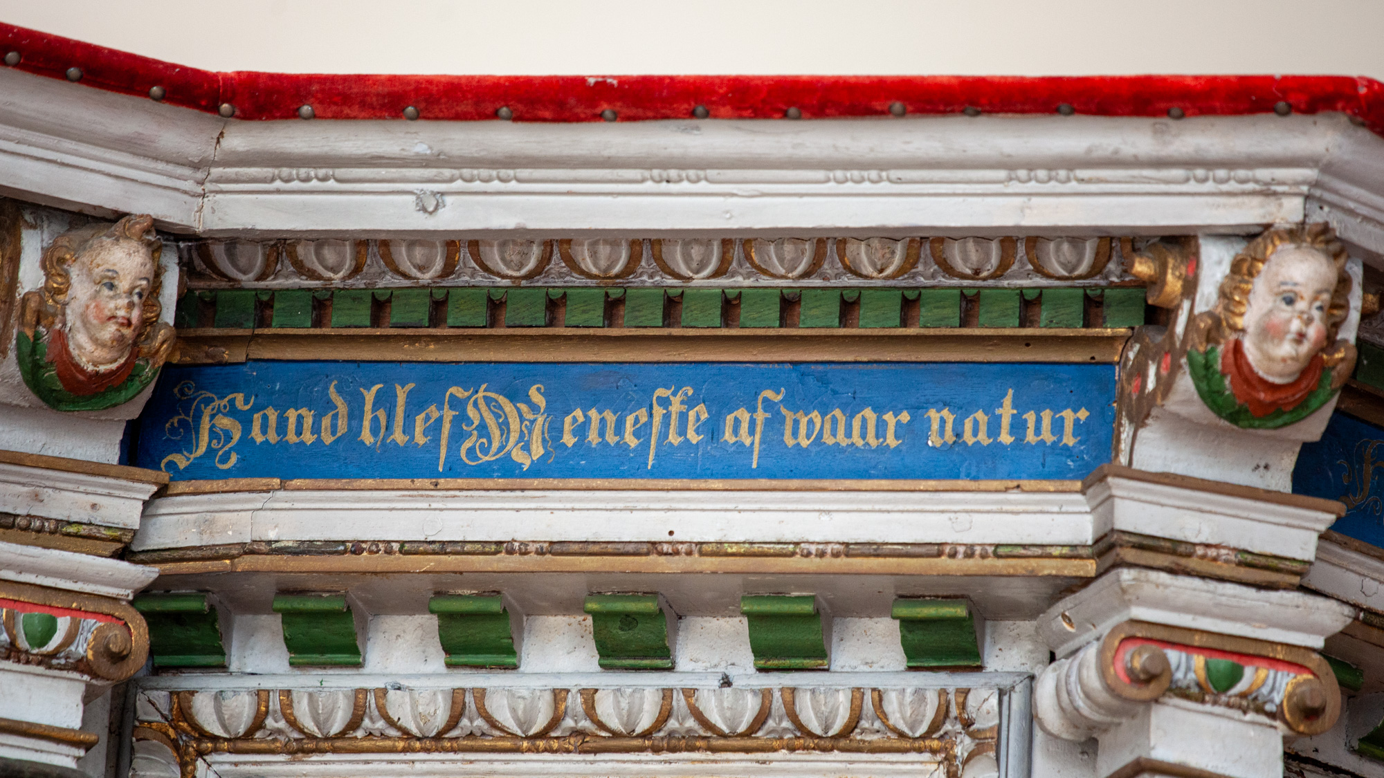Der er ingen smalfelter forneden, men derimod en kraftig gesims med skiftevis løvehoveder og engleansigter på hjørnerne. På hængestykkerne under gesimsen er der groteske ansigtsmasker.