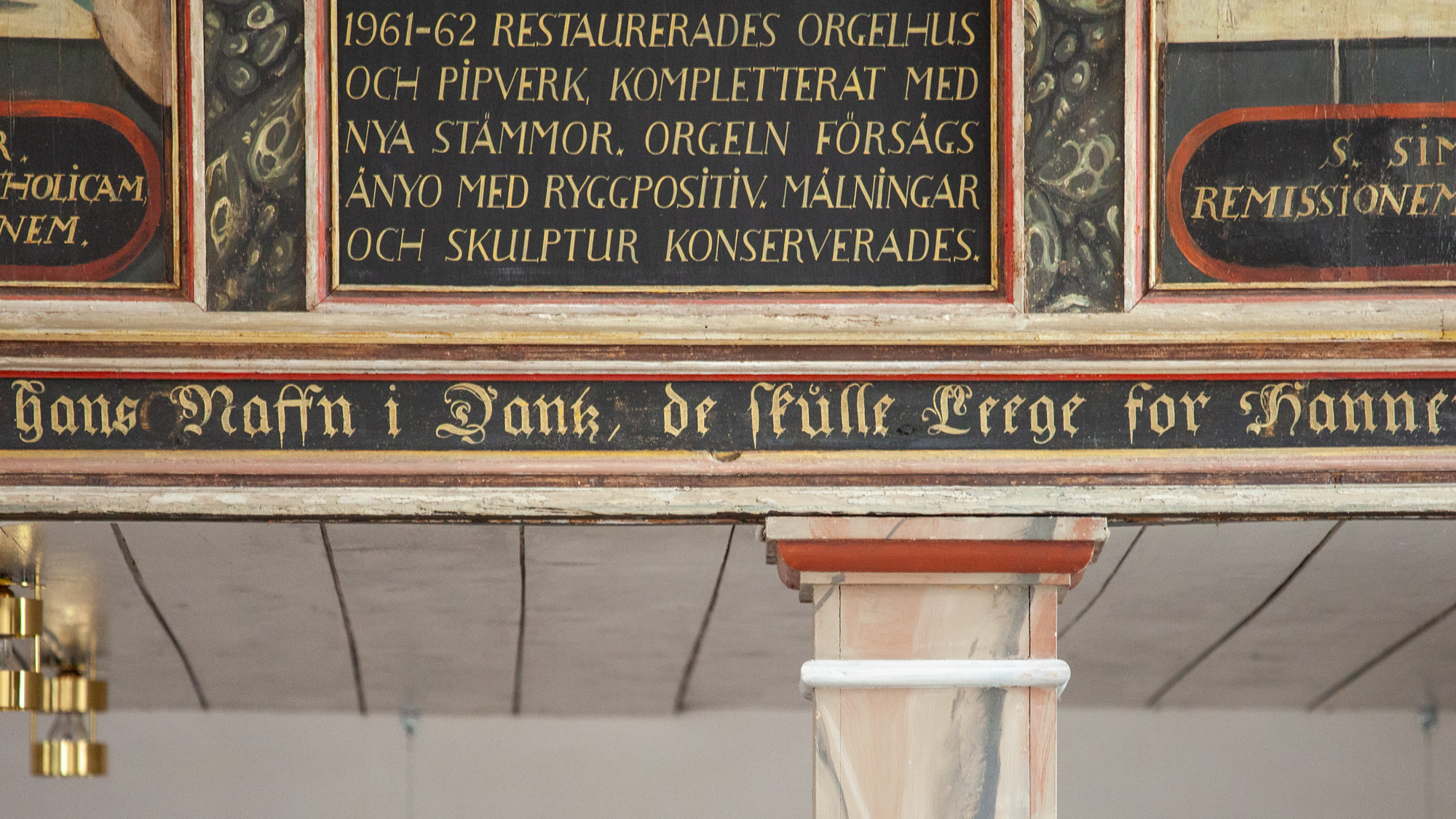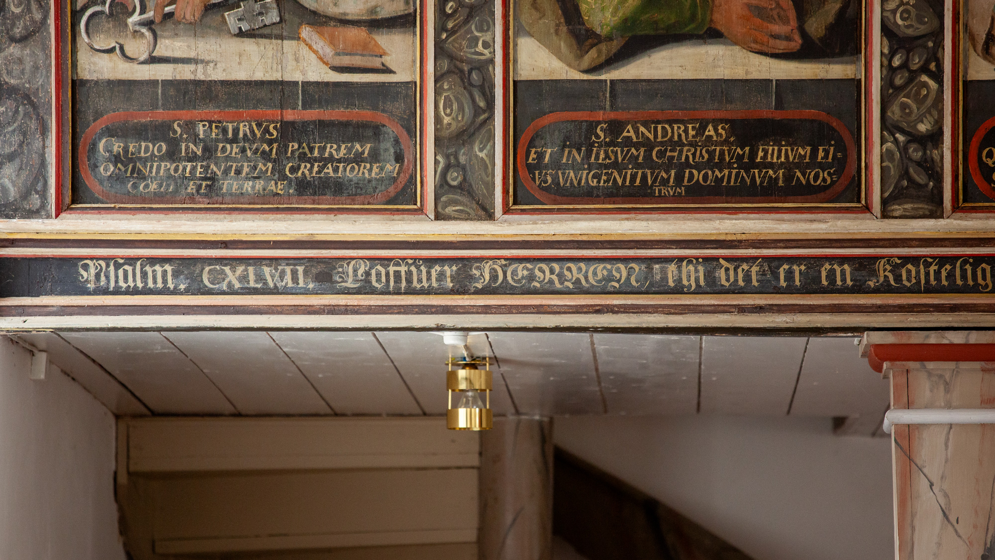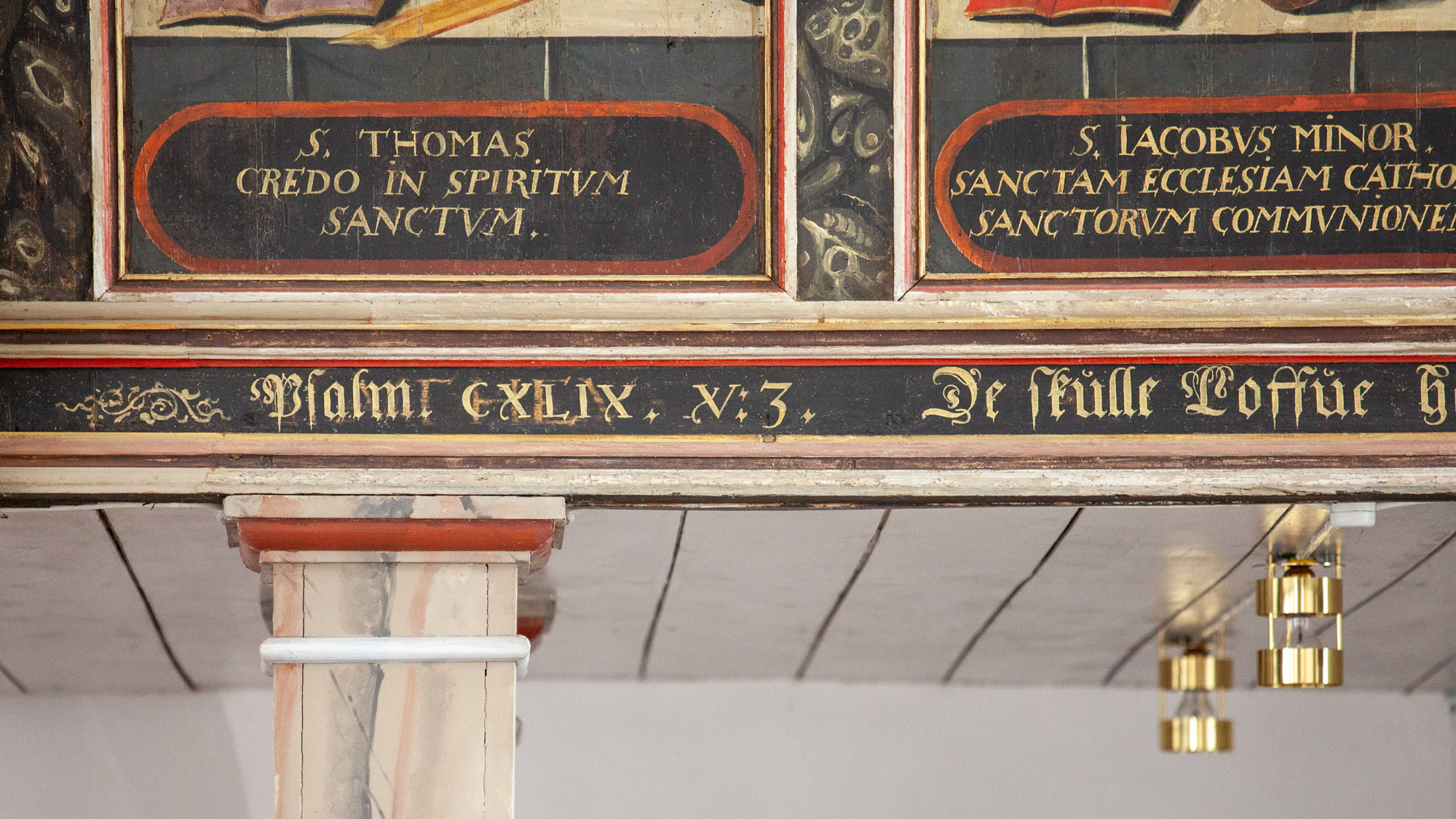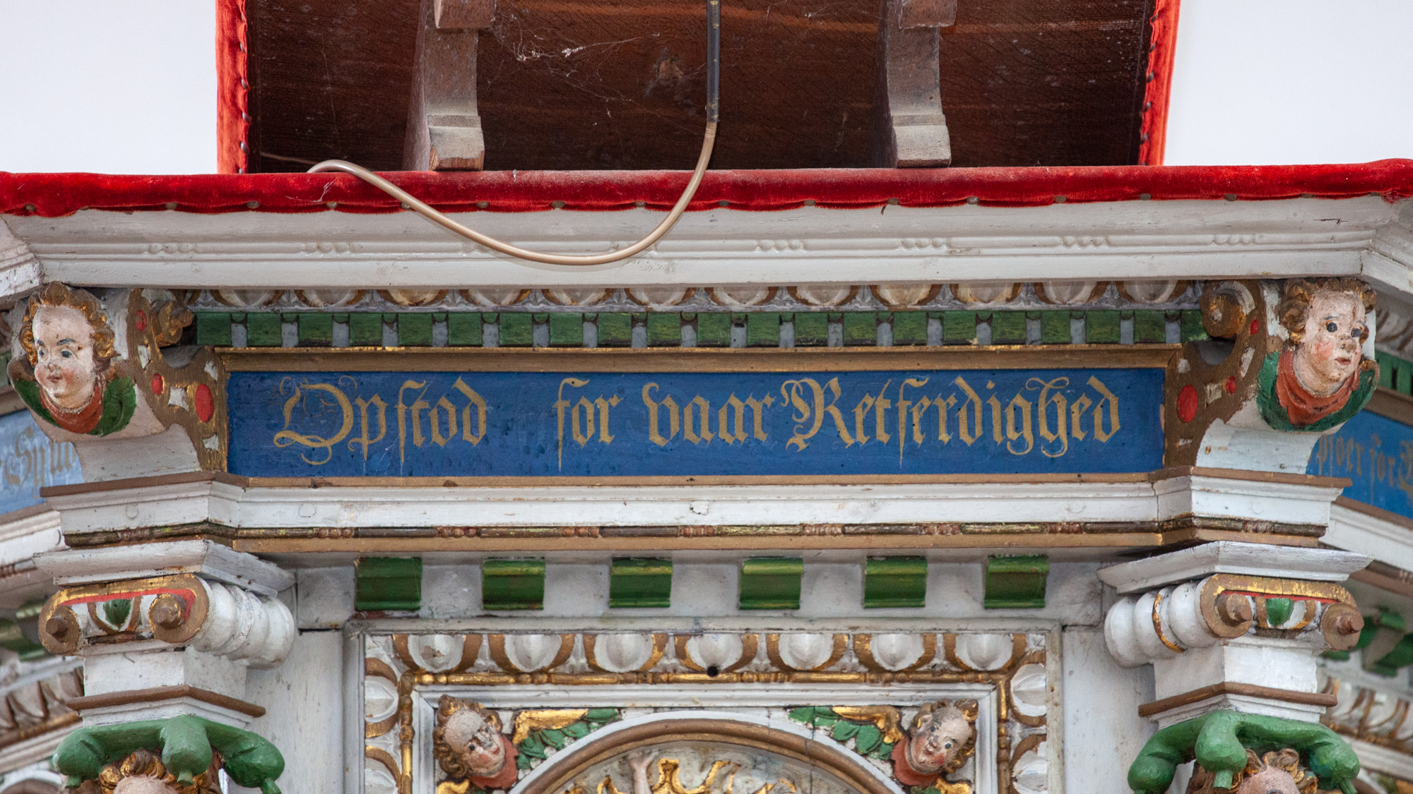 De to citater fra Salmernes Bog på pulpiturets underkant viser, at det oprindeligt er bygget som orgelpulpitur: