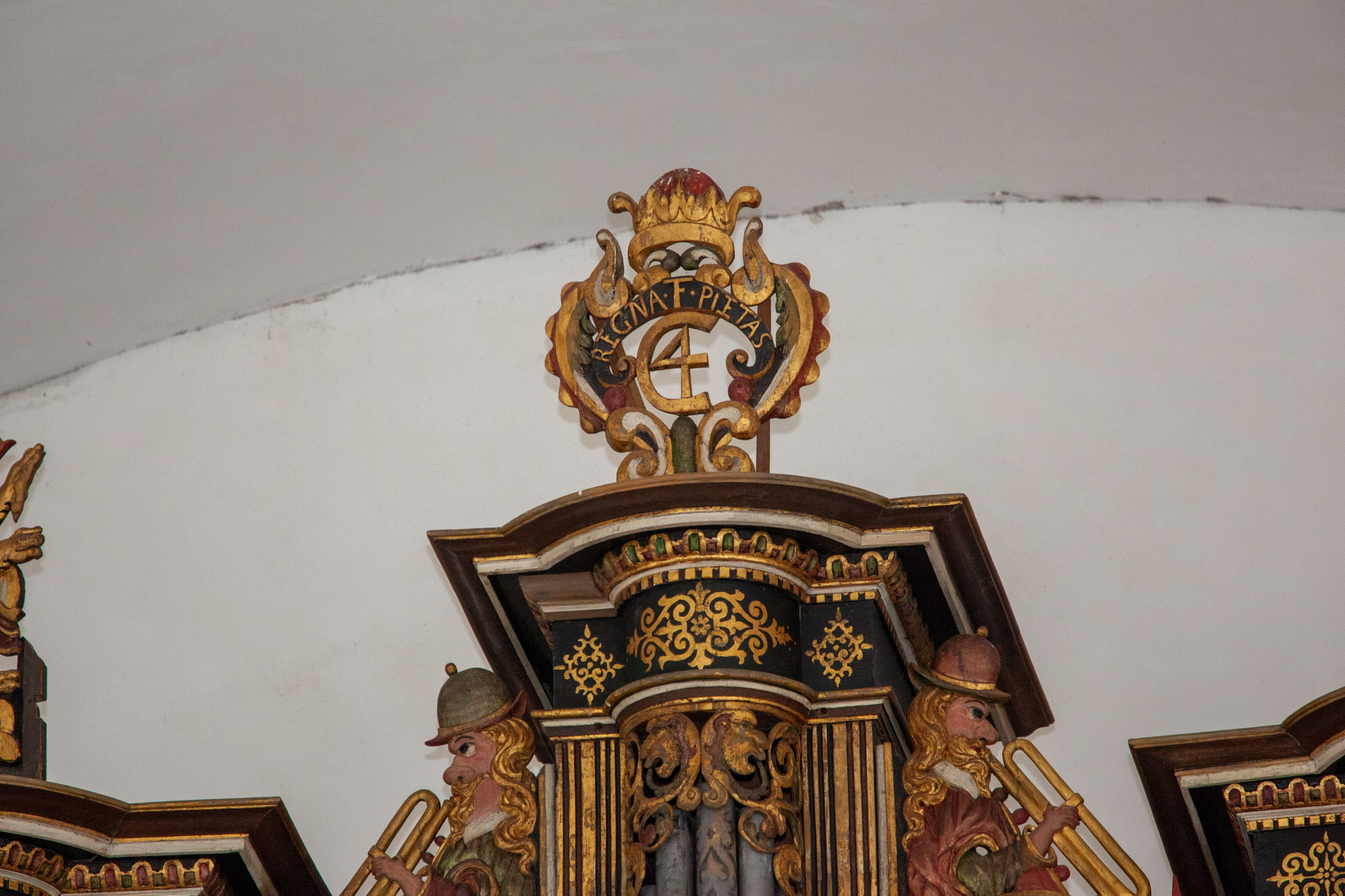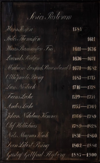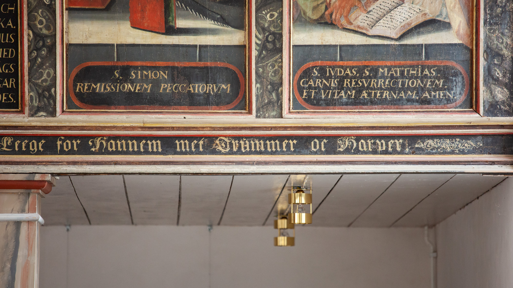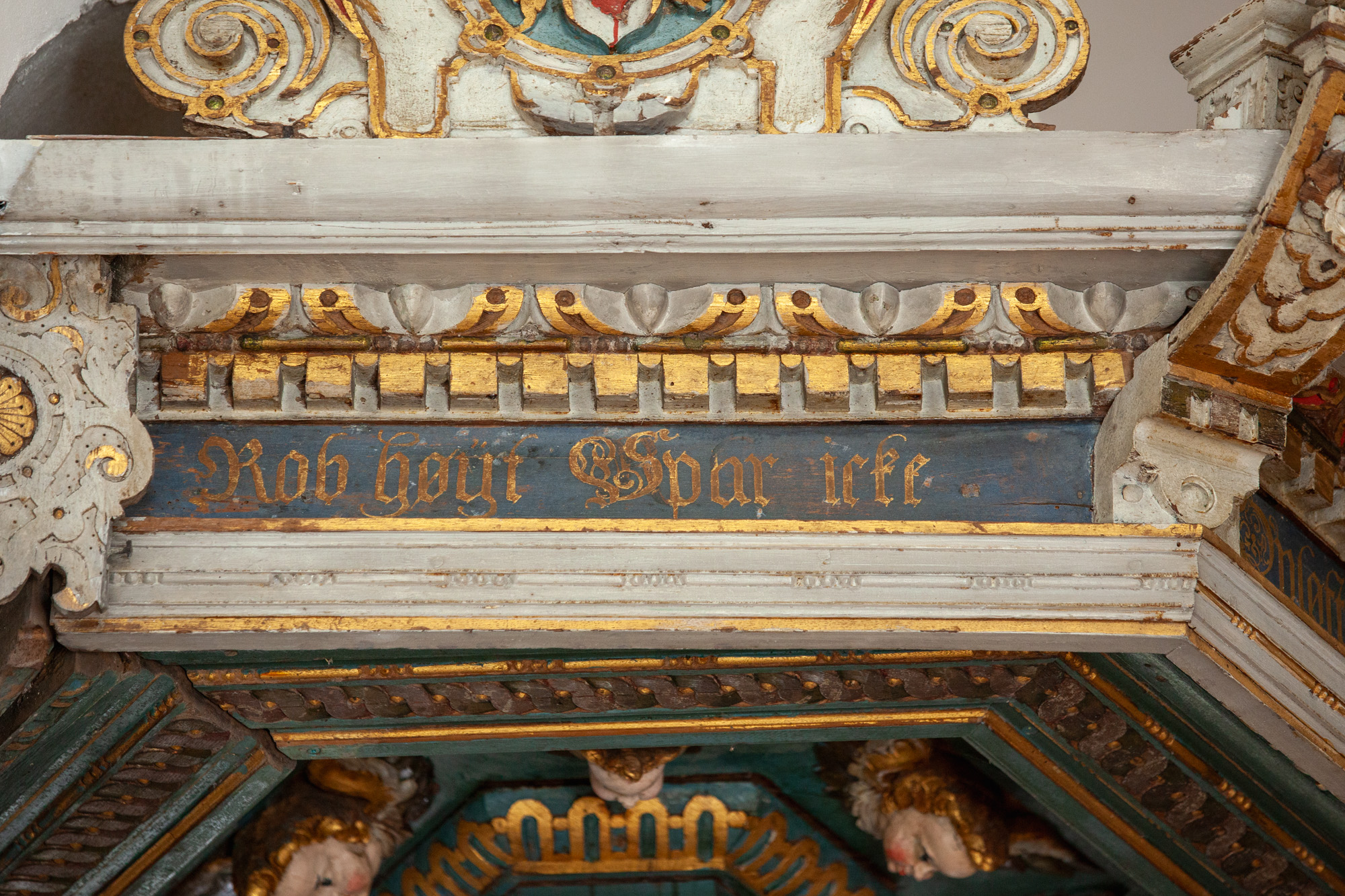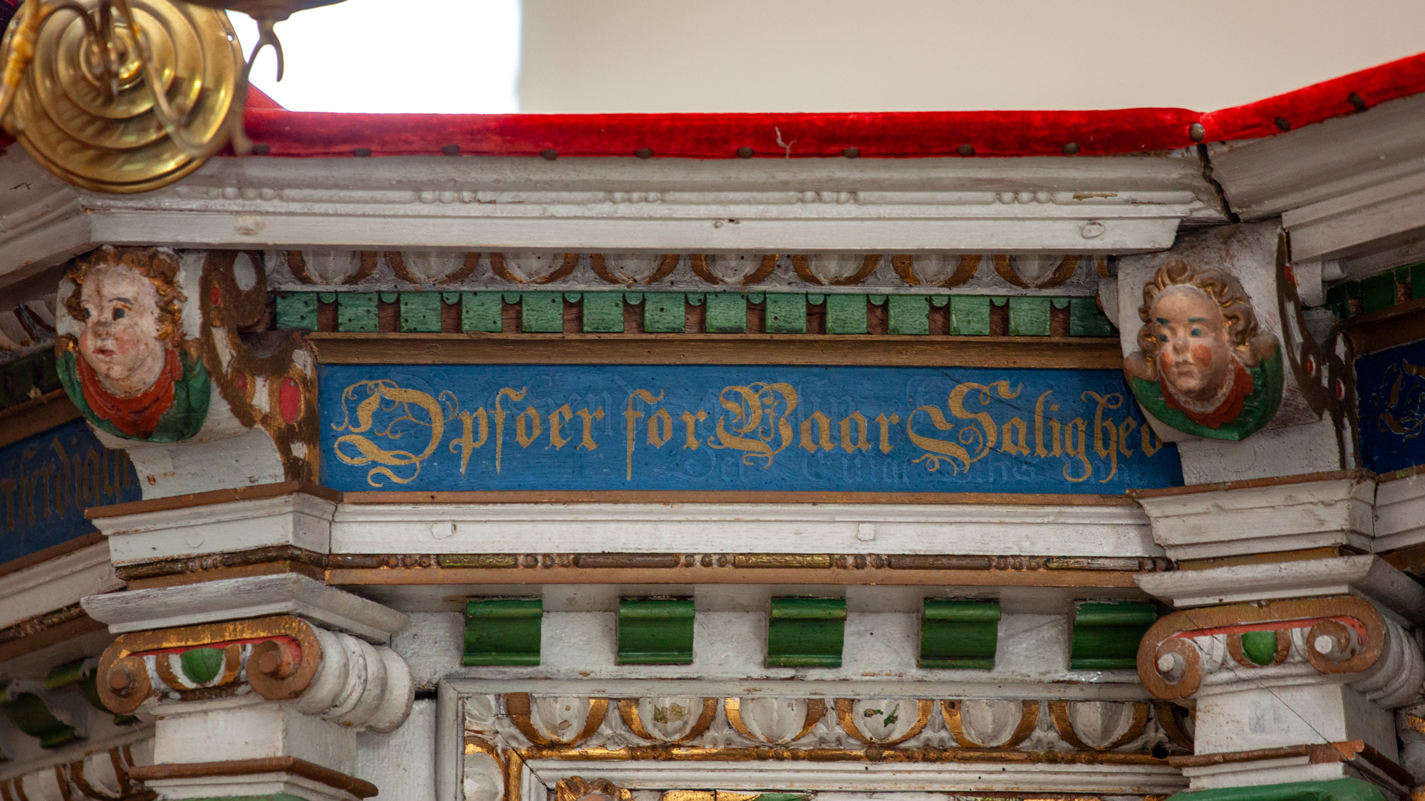 De to citater fra Salmernes Bog på pulpiturets underkant viser, at det oprindeligt er bygget som orgelpulpitur: