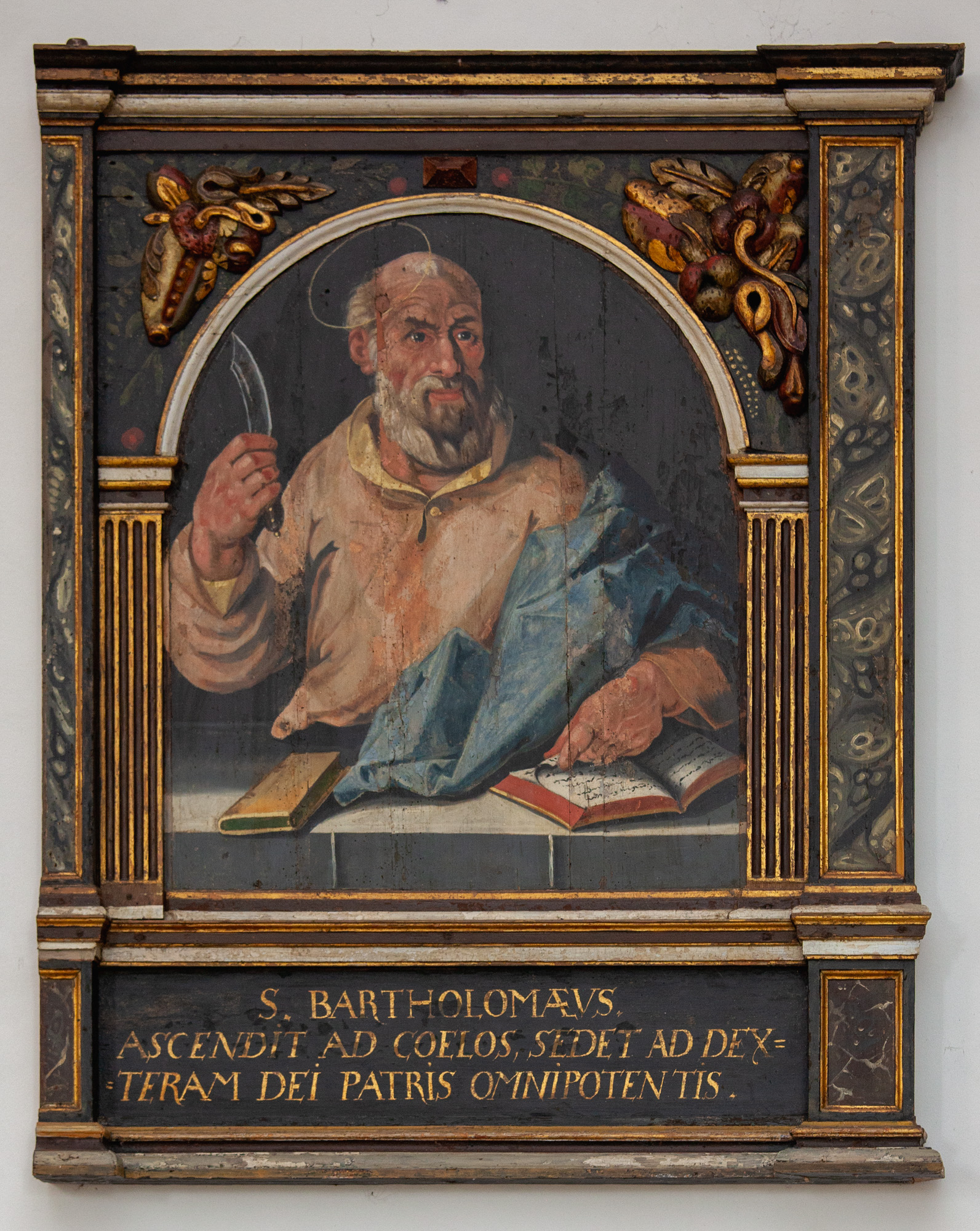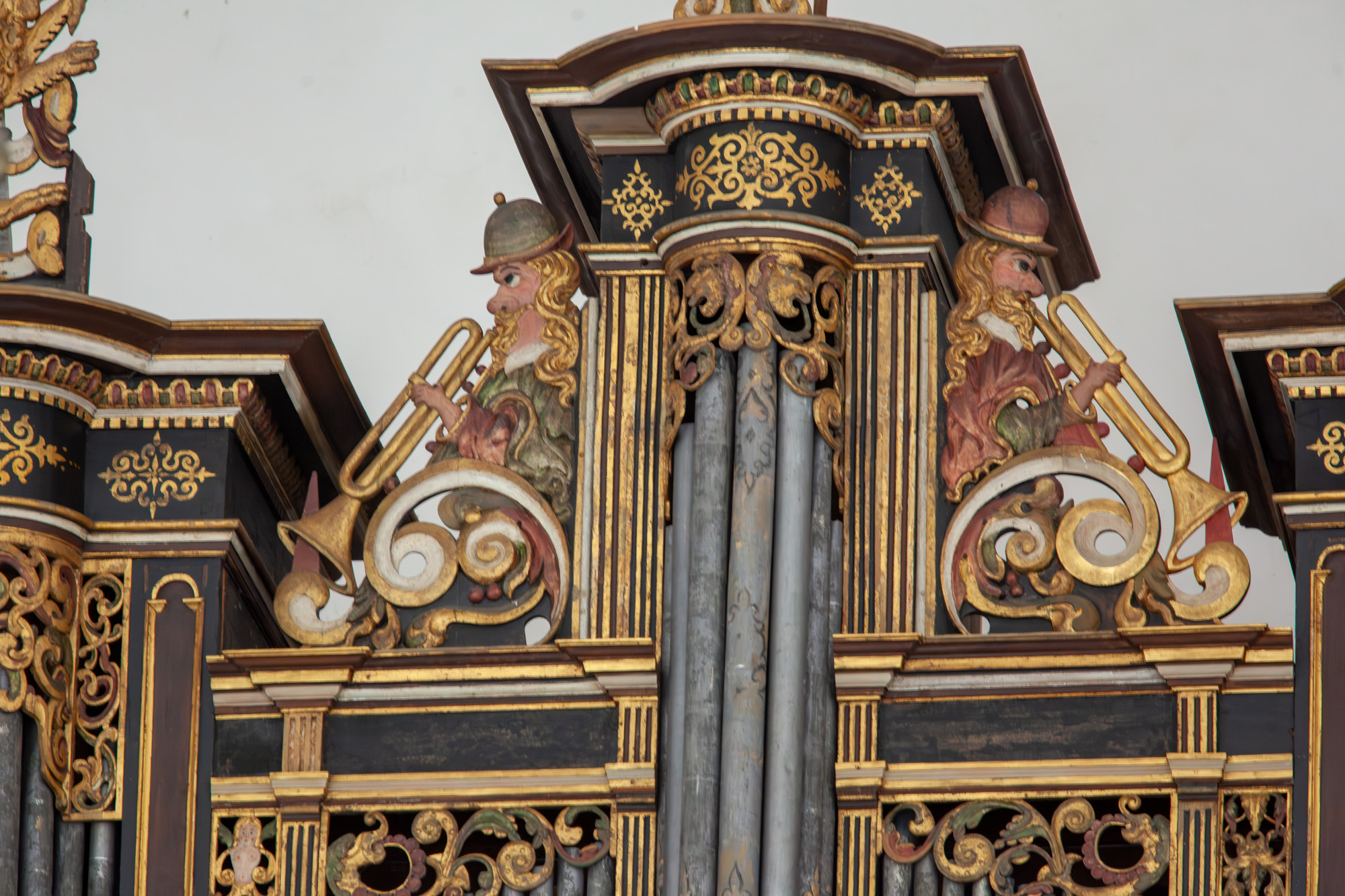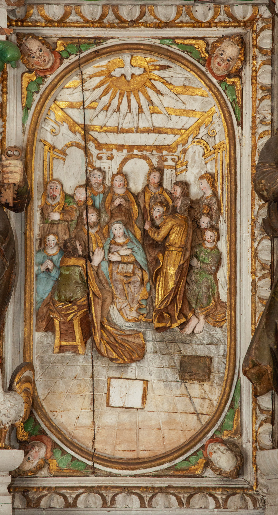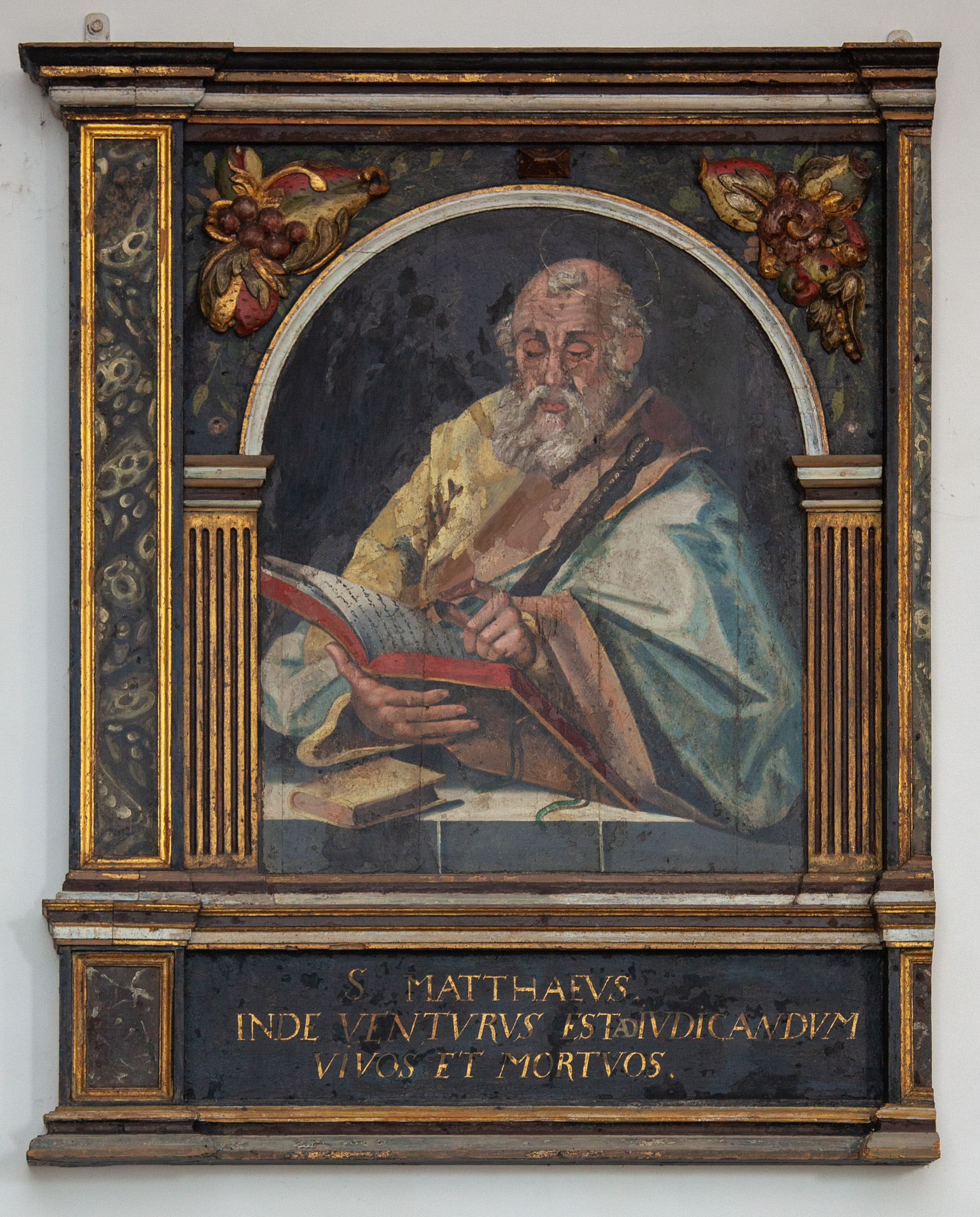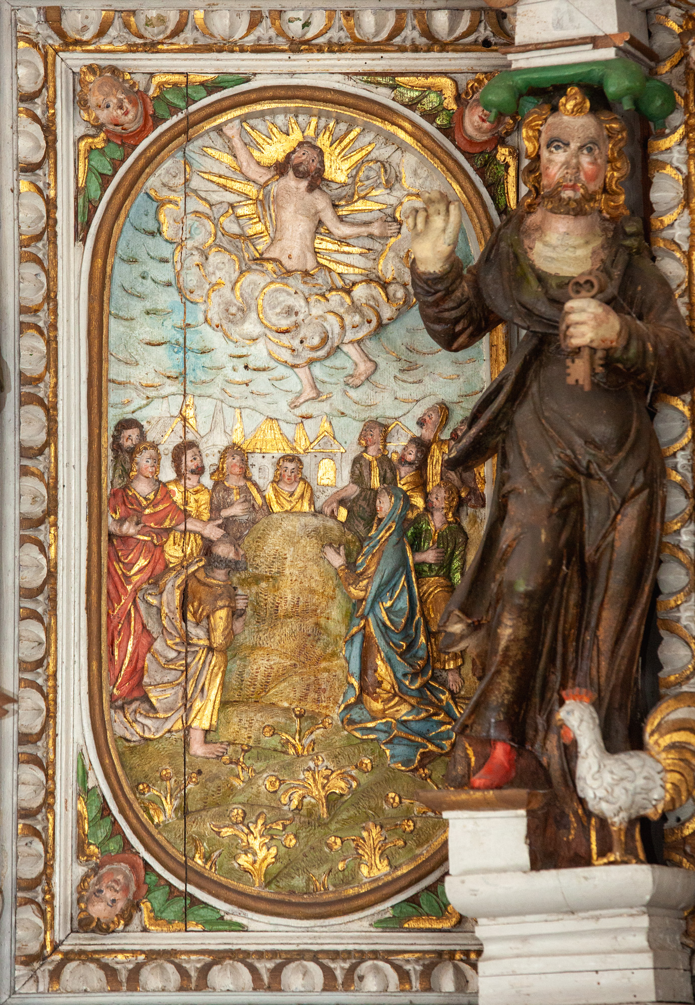 Mellem storfelterne er der frifigurer, der forestiller evangelisterne samt Peter og Paulus. Lukas holder en bog i venstre hånd og en fjerpen i højre. Peter står med den sædvanlige nøgle i hånden, mens hanen, der nåede at gale, inden han forrådte Jesus, står ved hans fødder.