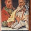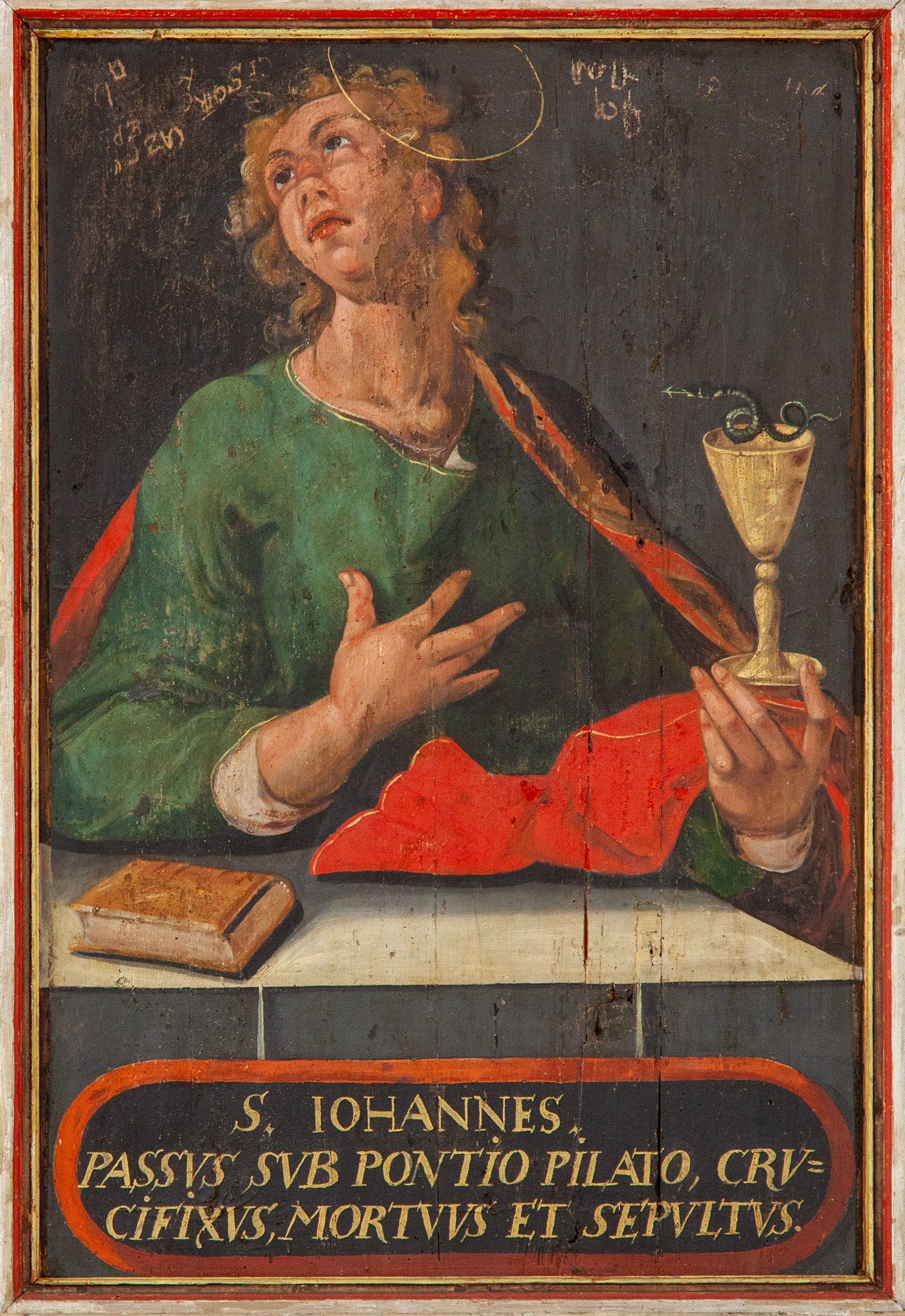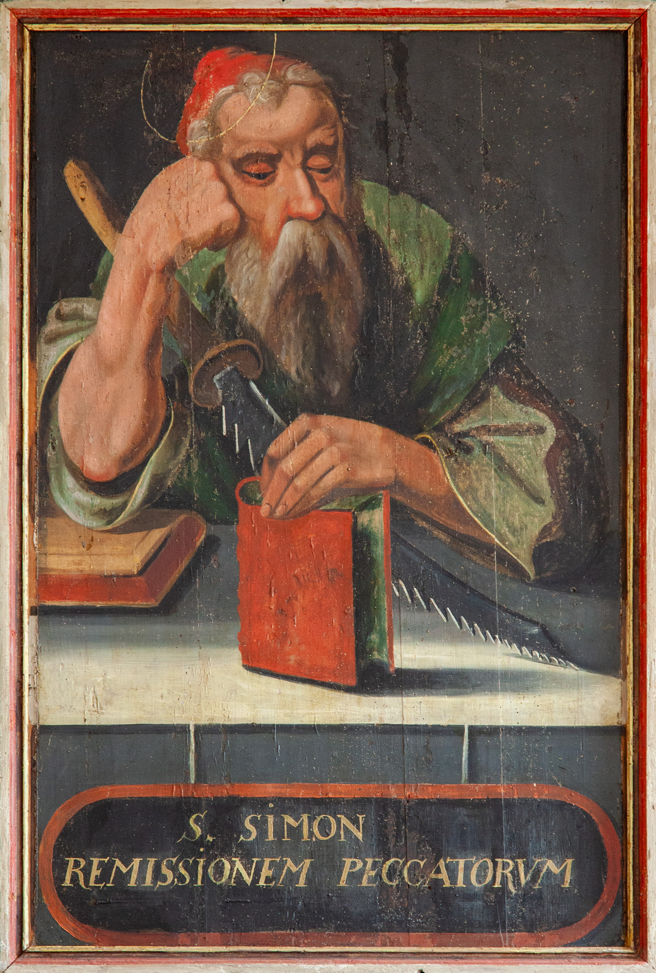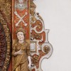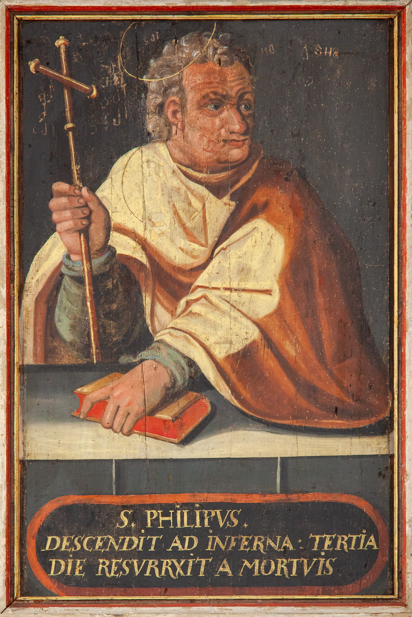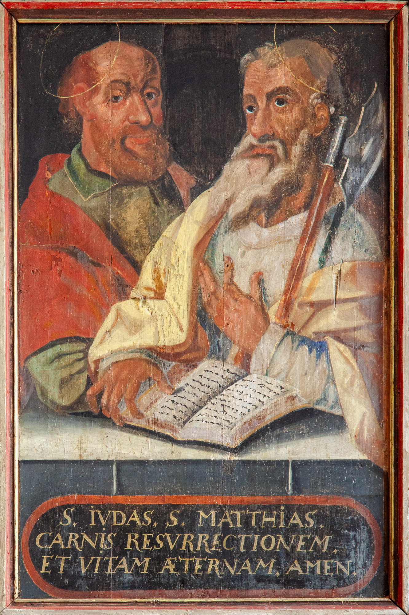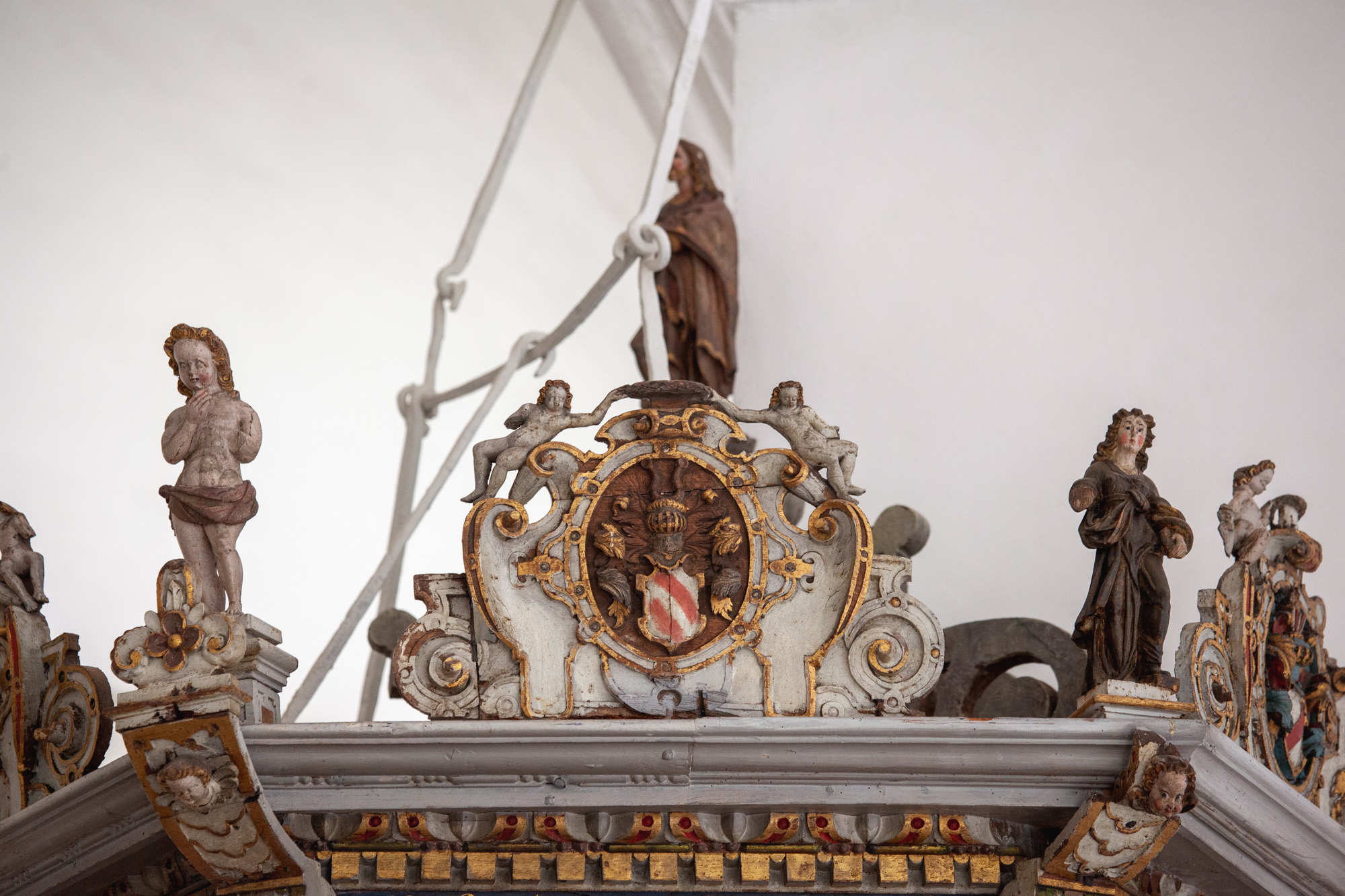 Mellem storfelterne er der frifigurer, der forestiller evangelisterne samt Peter og Paulus. Lukas holder en bog i venstre hånd og en fjerpen i højre. Peter står med den sædvanlige nøgle i hånden, mens hanen, der nåede at gale, inden han forrådte Jesus, står ved hans fødder.