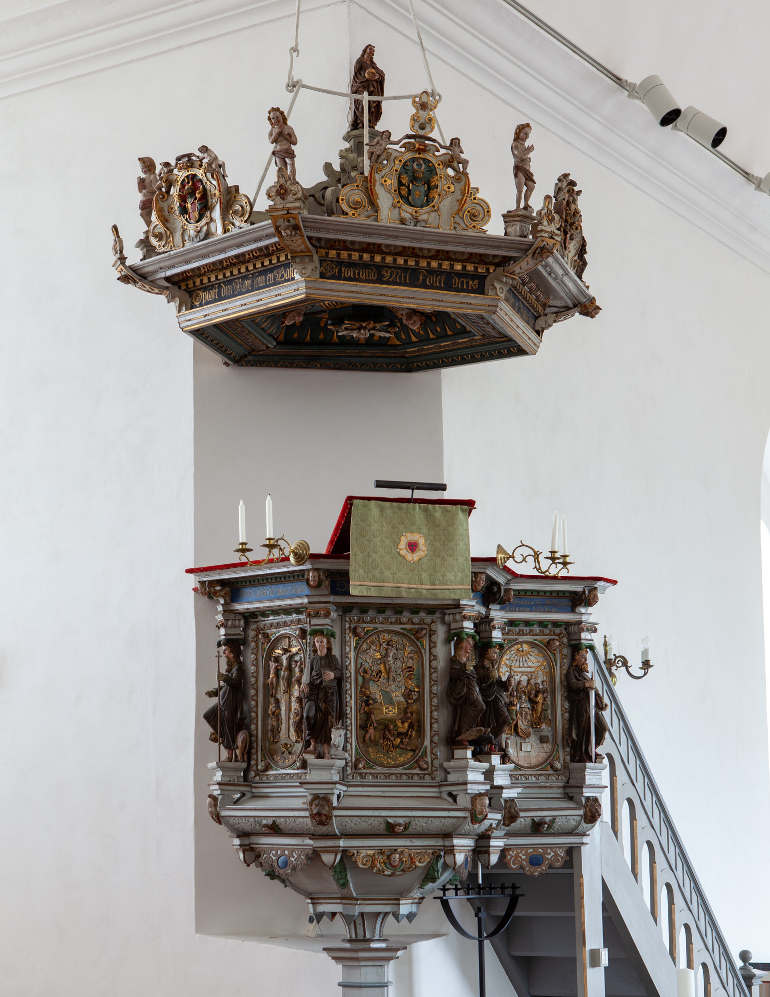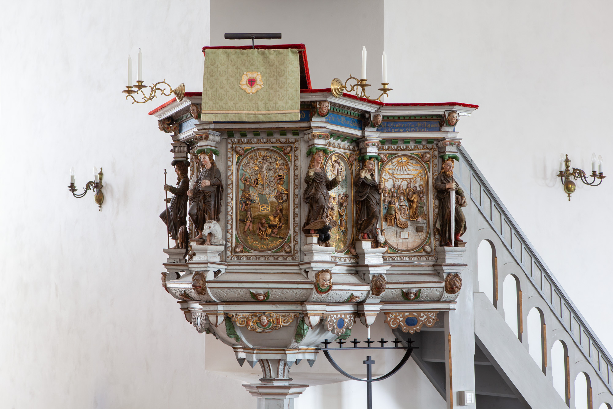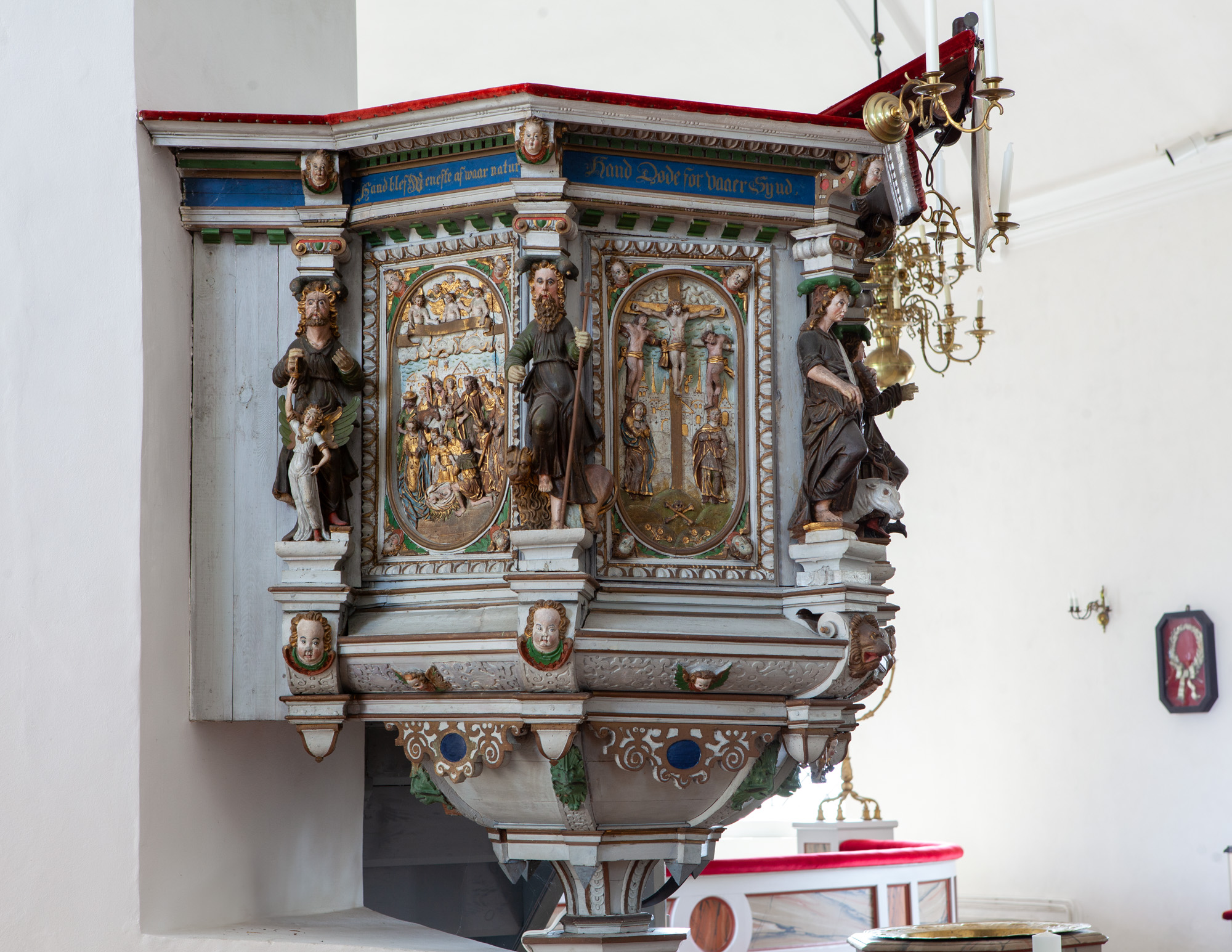 Prædikestolen er fra omkring 1628 og er udført enten af Jacob Kremberg eller hans værksted. Bemalingen er fra 1632.