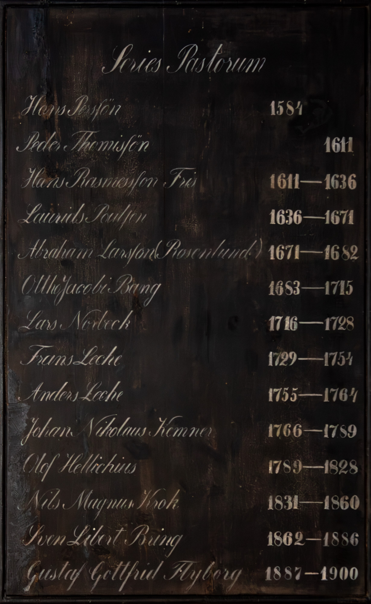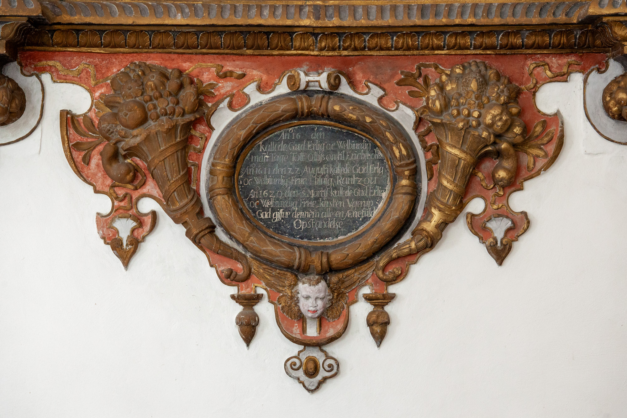 Anno 16.. den … kallede Gud Erlig oc Welbiurdig mand Tage Tott Ottissøn til Erichsholm Anno 1611 den 22 Augusti kallede Gud Erlig oc Welbiurdig Frue Hilvig Rantzou. Anno 1620 den 5. Martii kallede Gud Erlig oc Welbiurdig Frue kirsten Vgerup. Gud giffue dennem alle en Ærrefuld opstandelse.