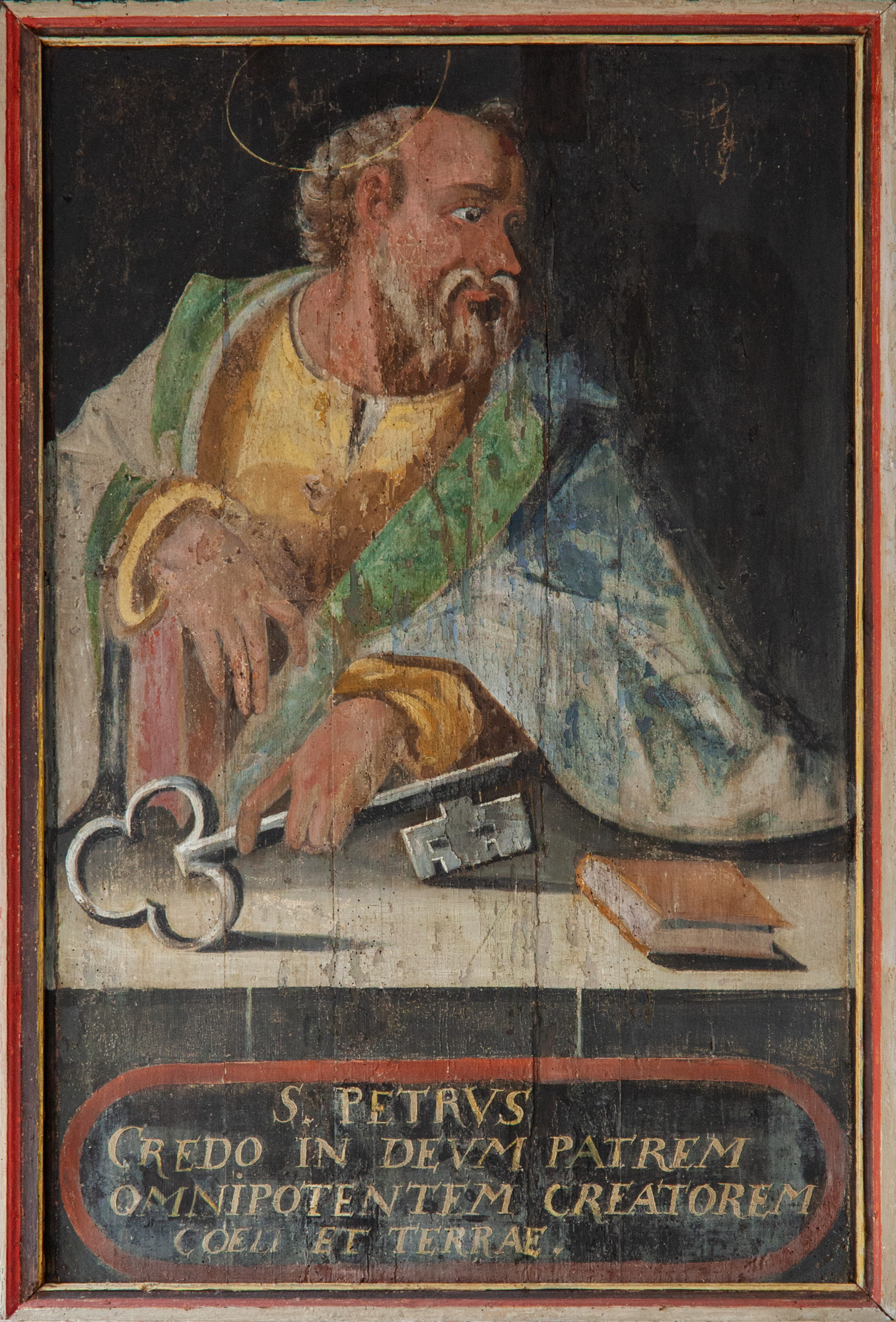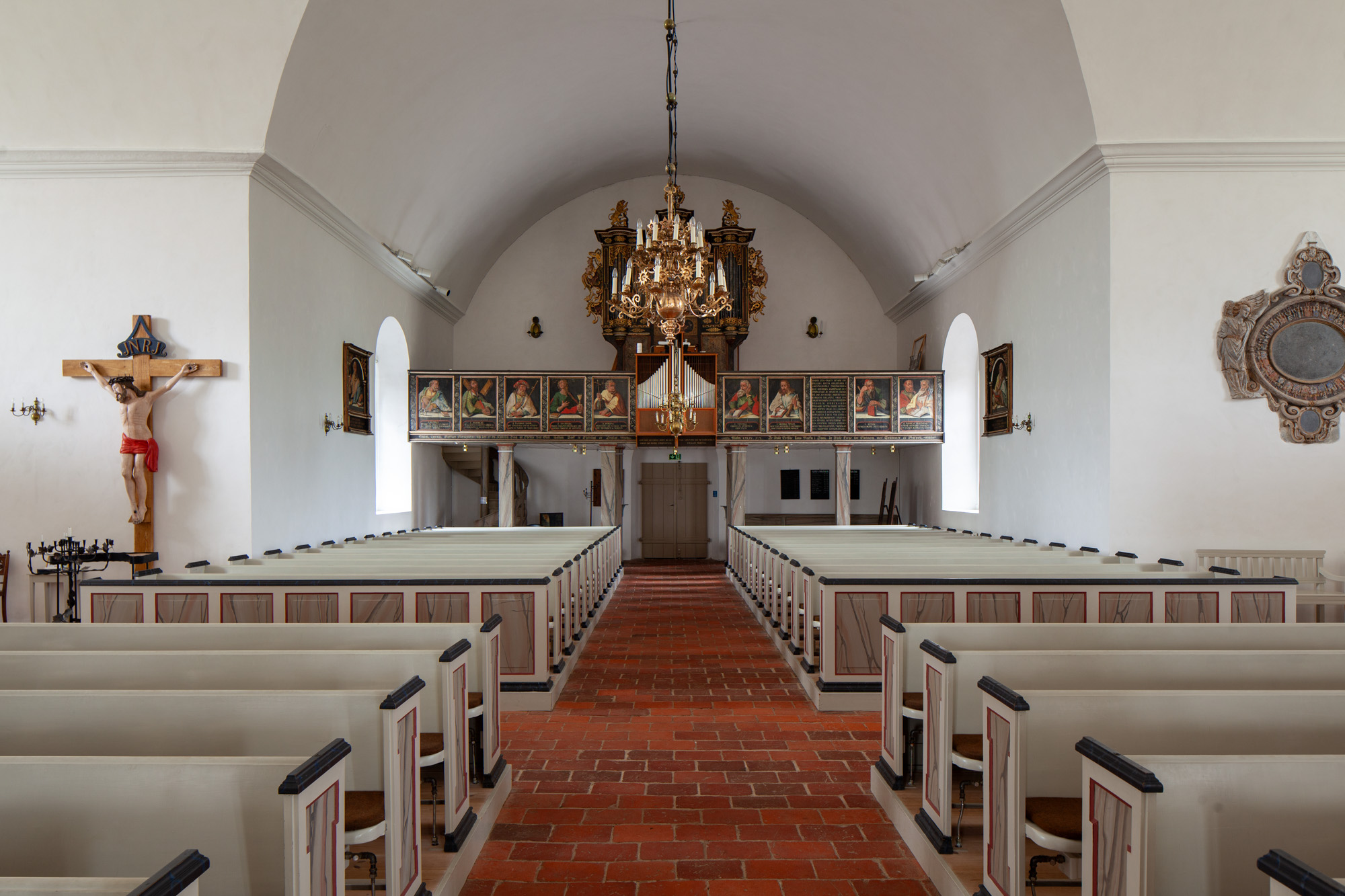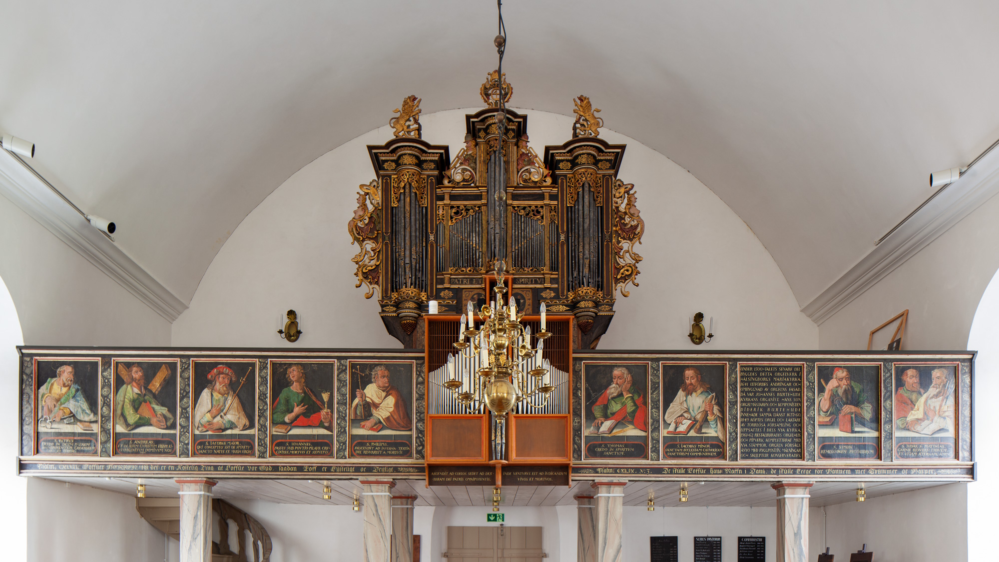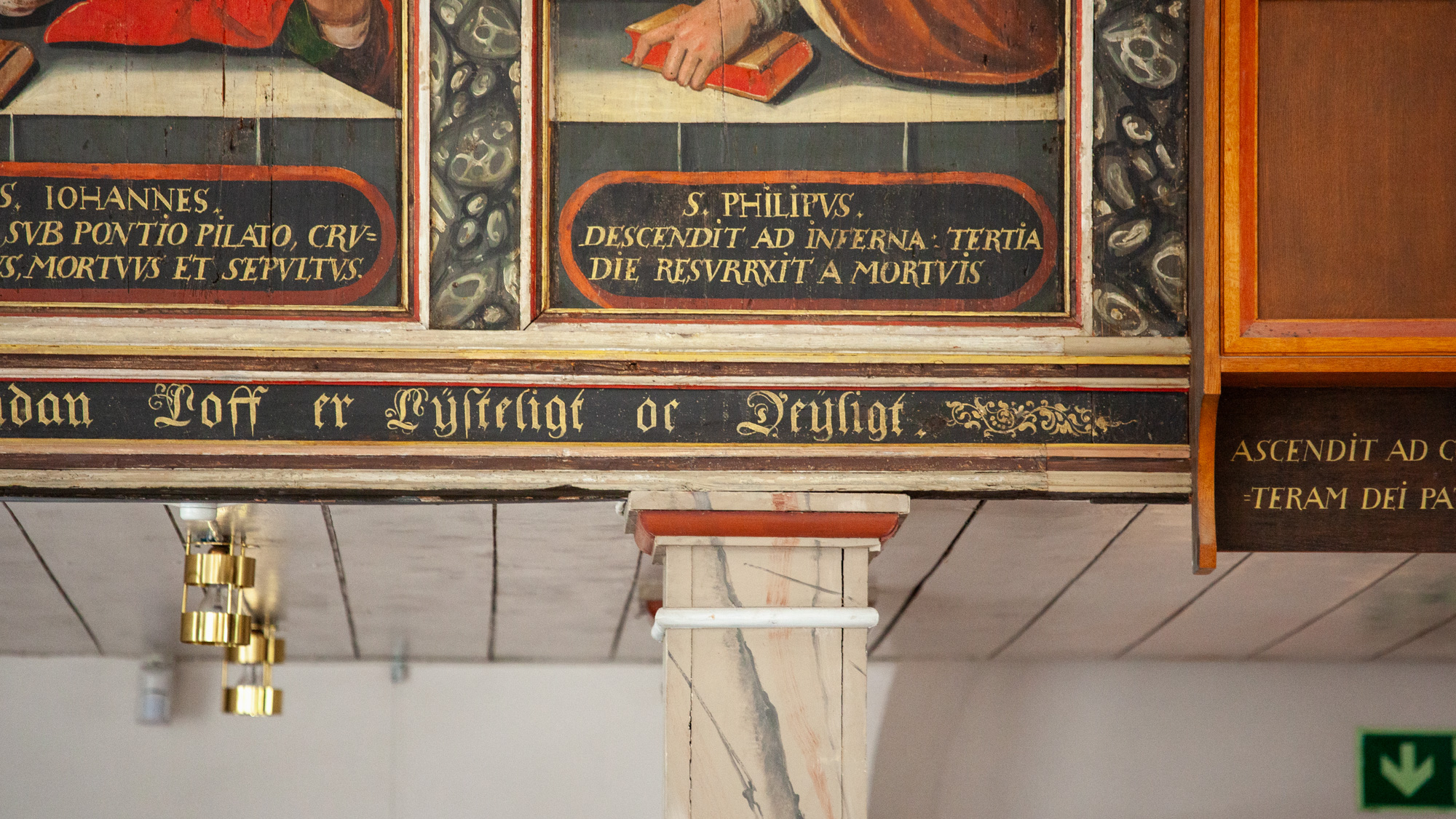 Orgelpulpituret har billeder af apostlene. Deres navn står under hvert billede sammen med et stykke af trosbekendelsen. To felter hænger på væggen. De sad tidligere der, hvor rygpositivet nu er. Teksten fra de to billeder på væggen er anført på rygpositivet.