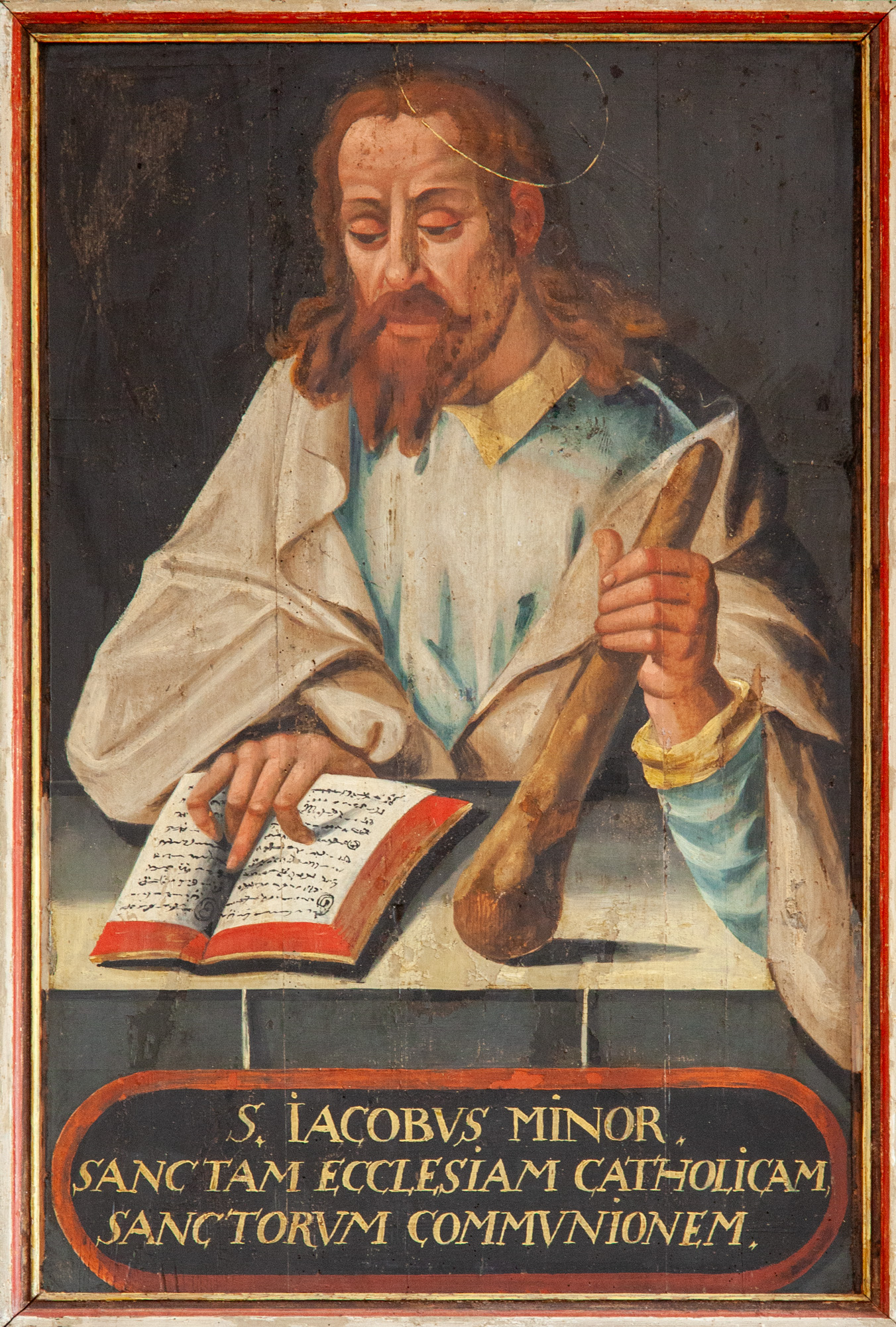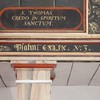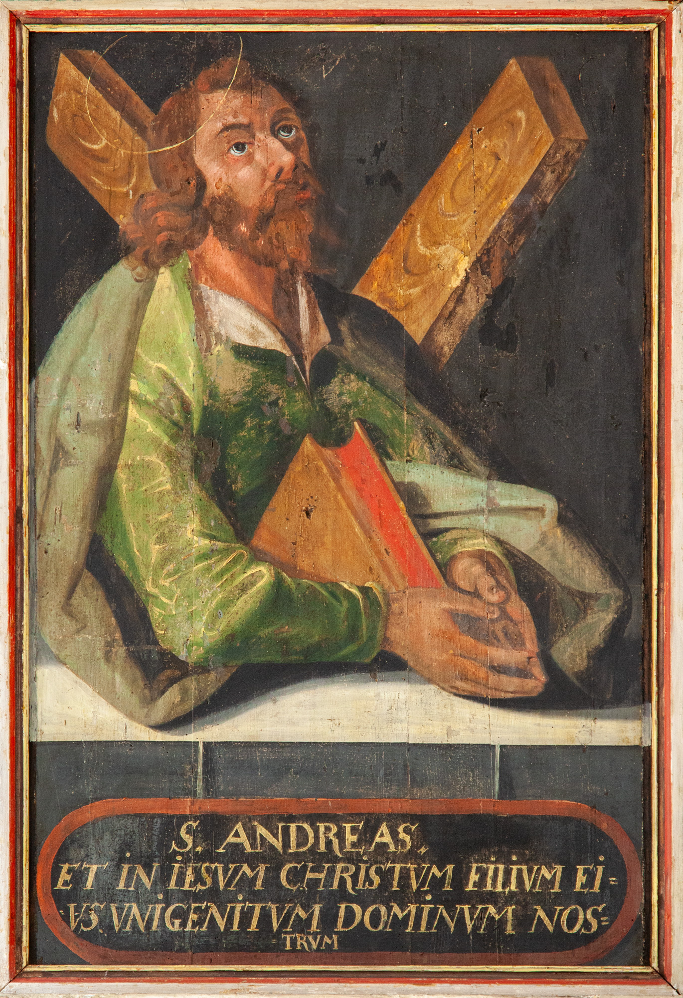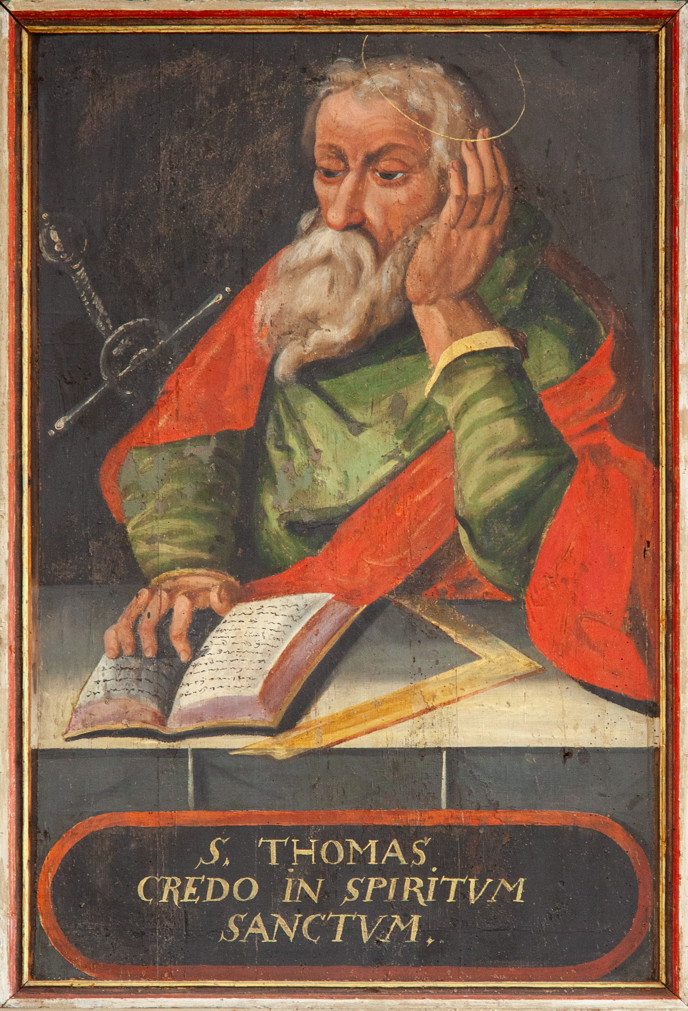 Orgelpulpituret har billeder af apostlene. Deres navn står under hvert billede sammen med et stykke af trosbekendelsen. To felter hænger på væggen. De sad tidligere der, hvor rygpositivet nu er. Teksten fra de to billeder på væggen er anført på rygpositivet.