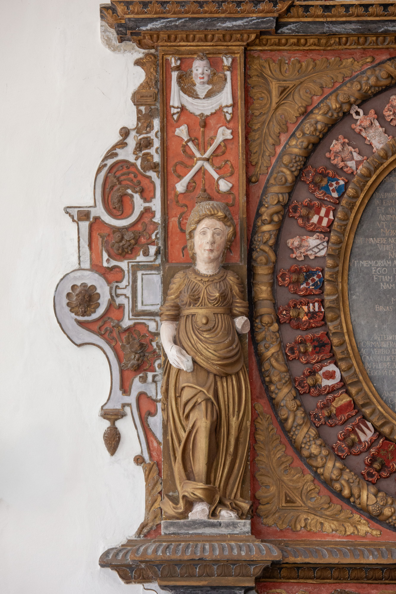 Epitafium over Tage Thott og hans to første hustruer Hedvig Ranzau og Christina Urup. Teksten på epitafiet er på latin: