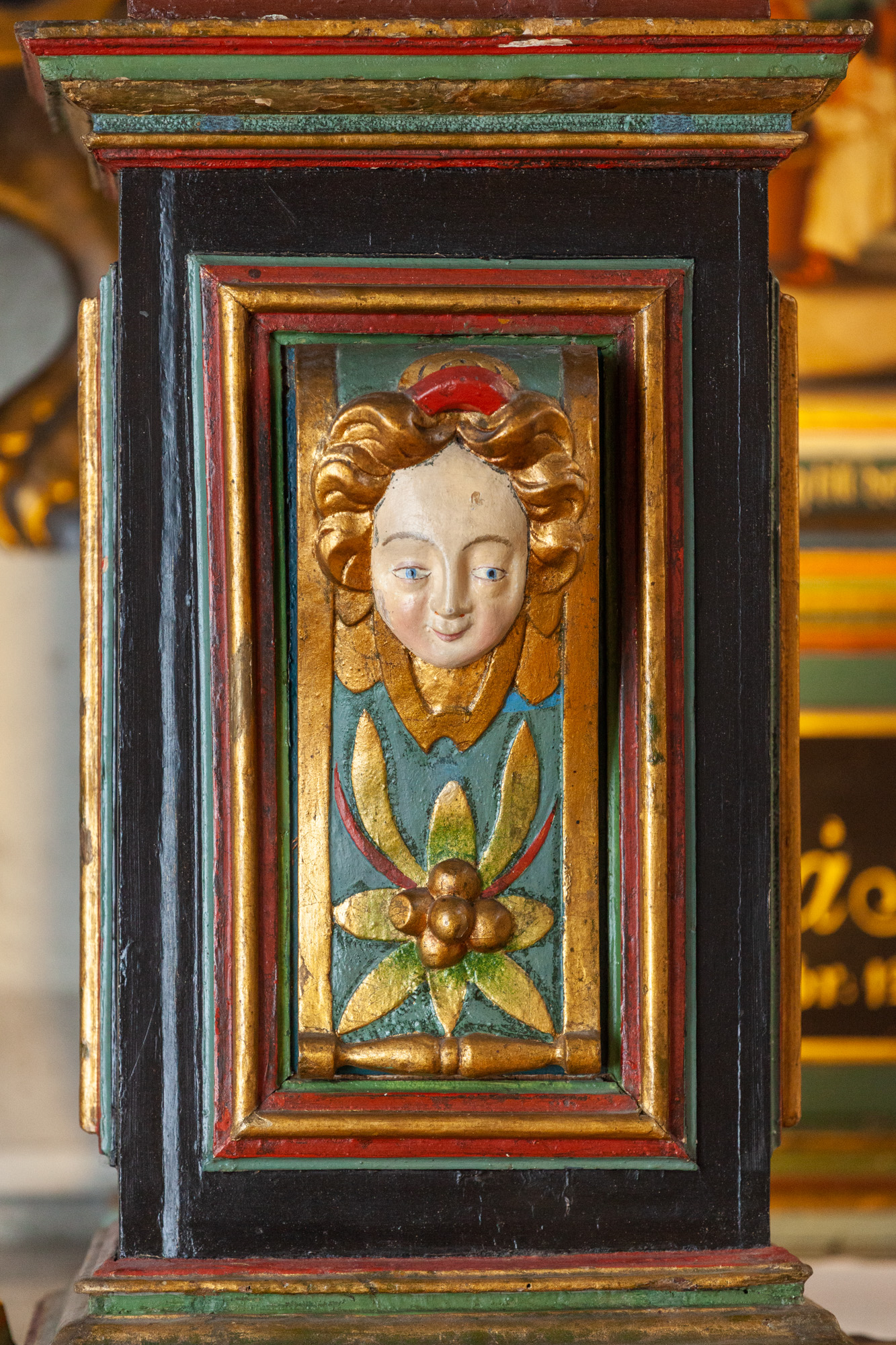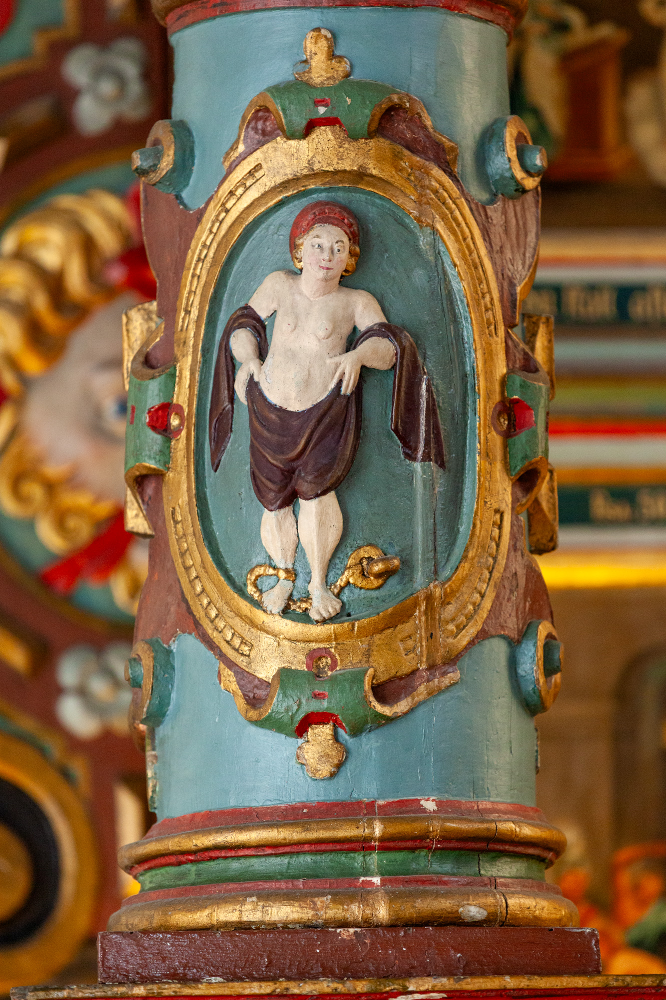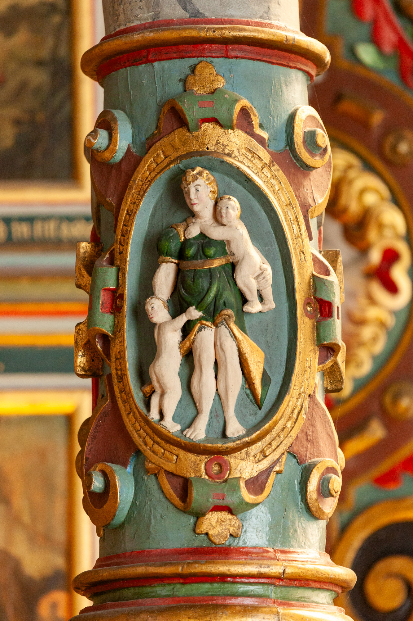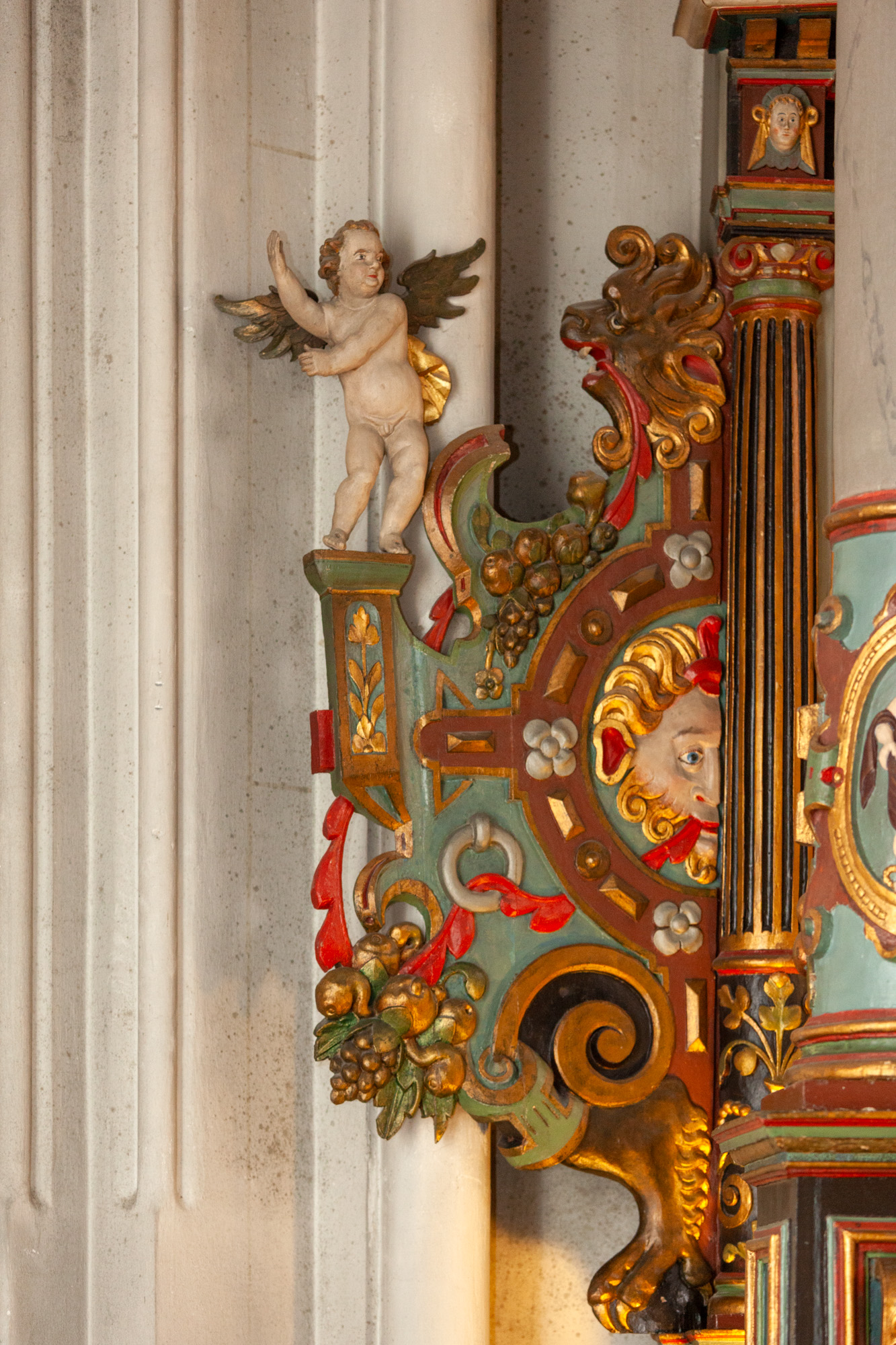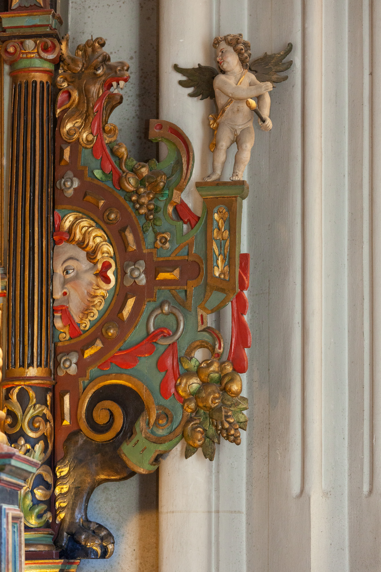 Vingerne er rigt udsmykket i renæssancestil med frugtklaser, putti, løvehoved og –klo. På søjlernes prydbælter er en kvinde, hvis fod er bundet, og på den anden Caritas.