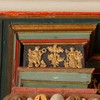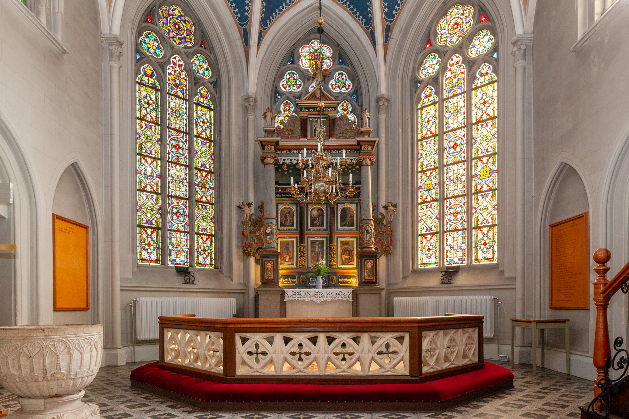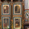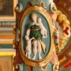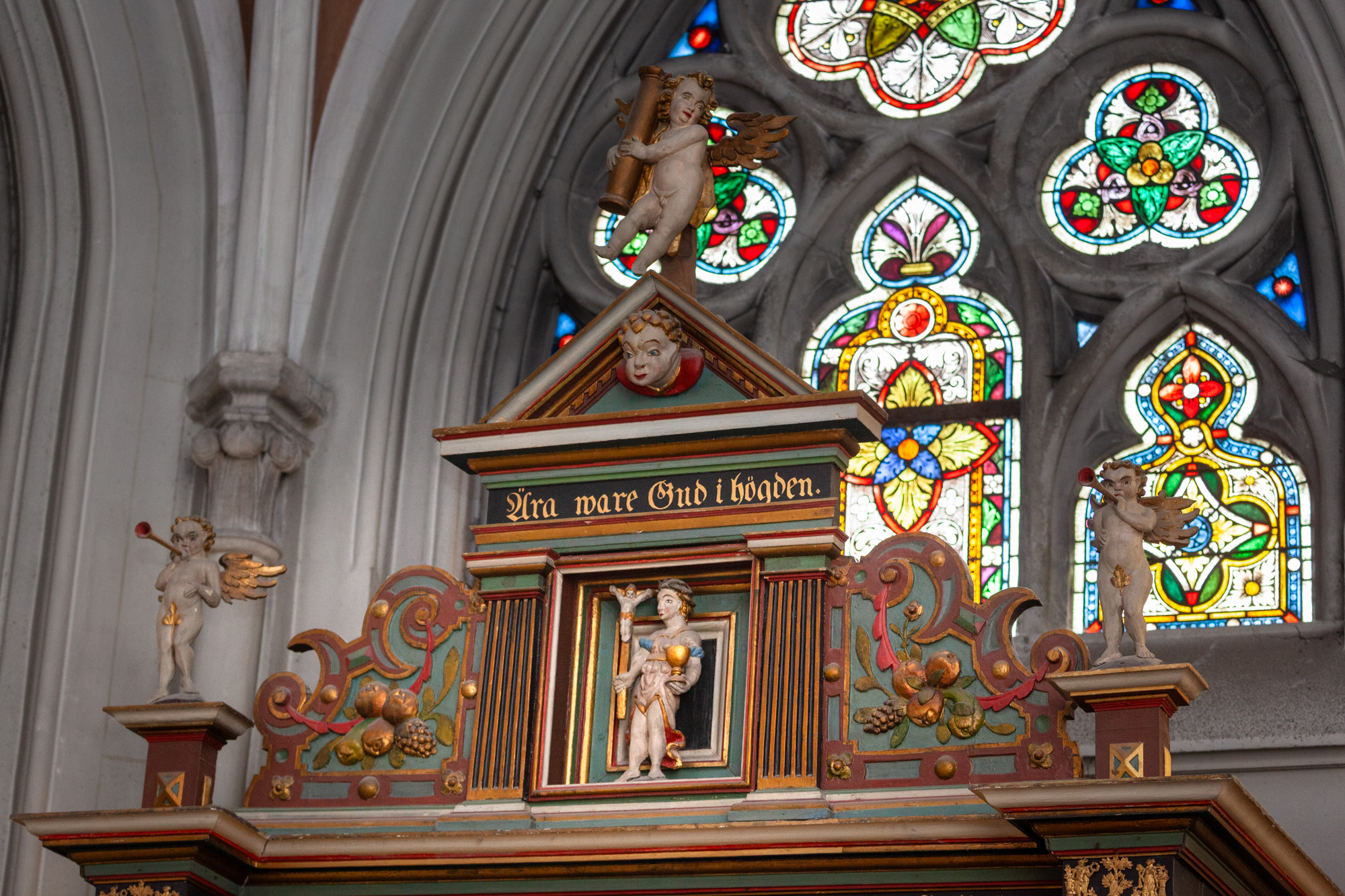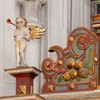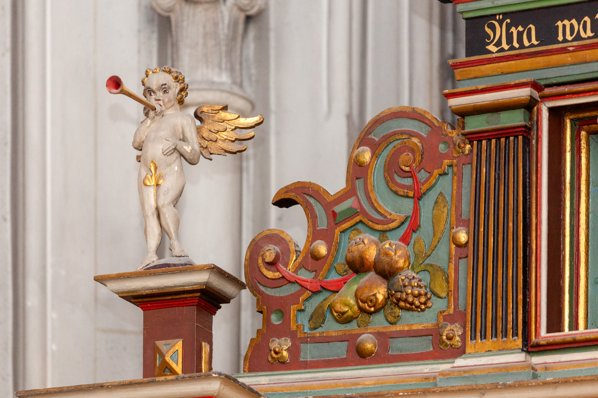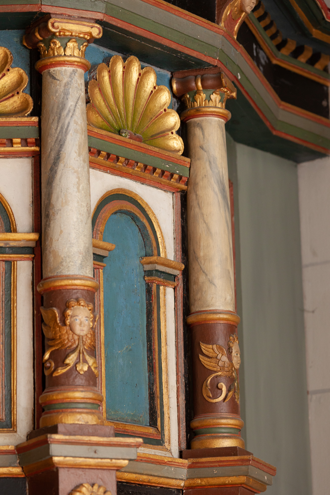 Vingerne er rigt udsmykket i renæssancestil med frugtklaser, putti, løvehoved og –klo. På søjlernes prydbælter er en kvinde, hvis fod er bundet, og på den anden Caritas.