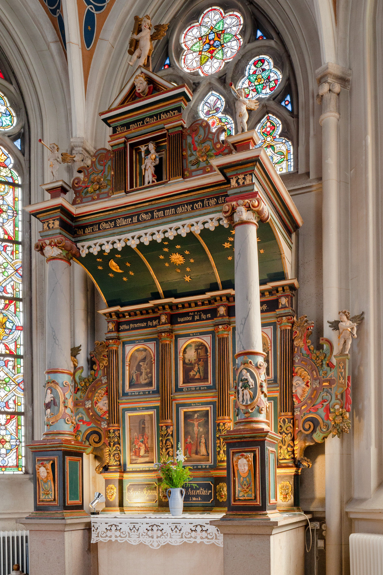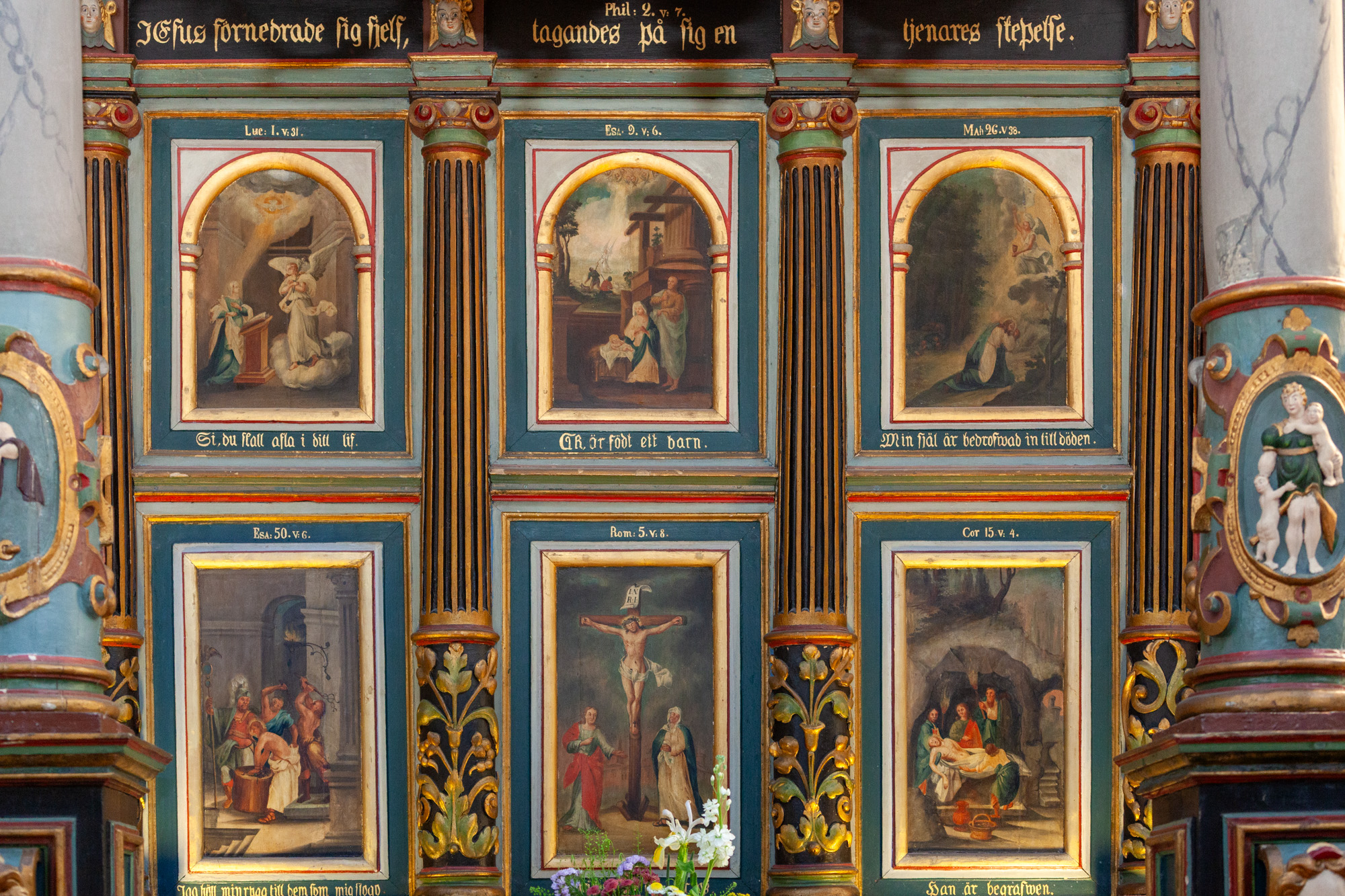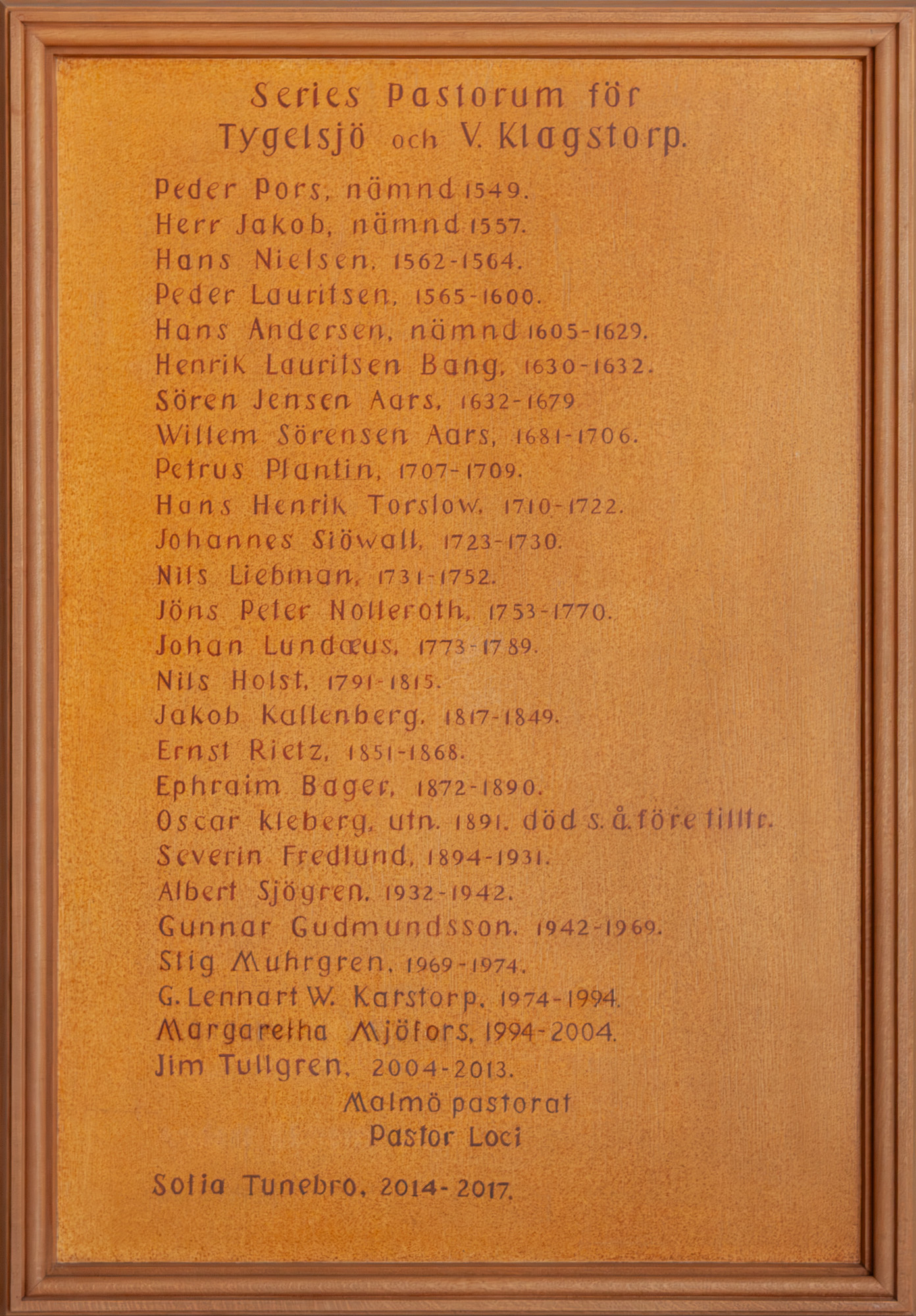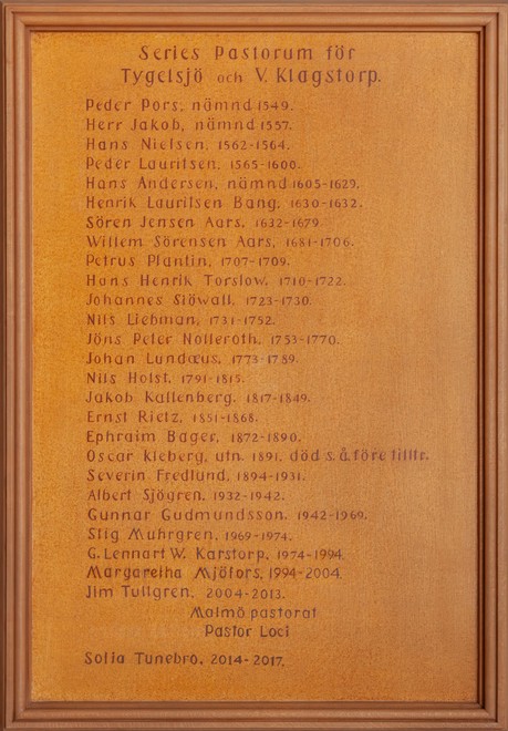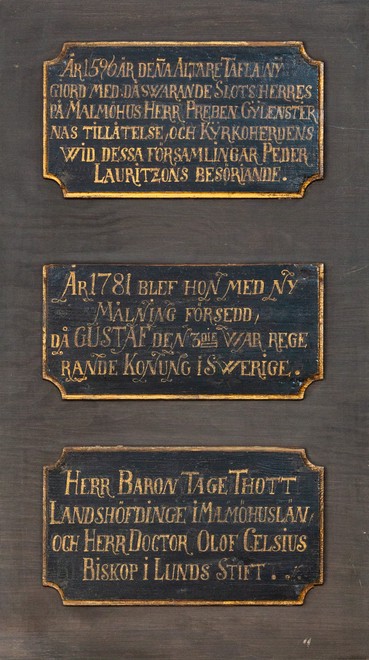 År 1596 är denna altaretafla nygiord med dåvarande Slots Herres på Malmöhus Herr Preben Gyllenstjernas tillåtelse och kyrkoherdens wid desse församlingar Peder Lauritzons besörjande.