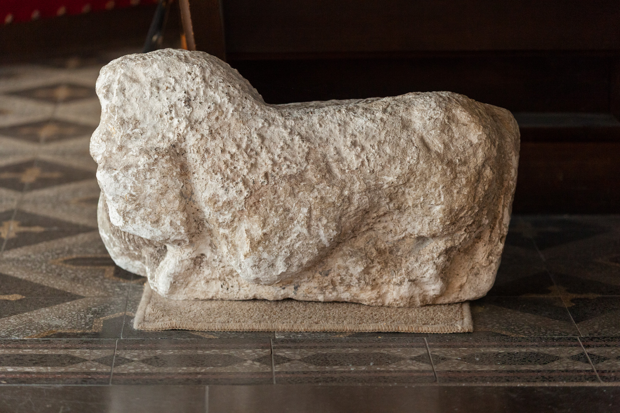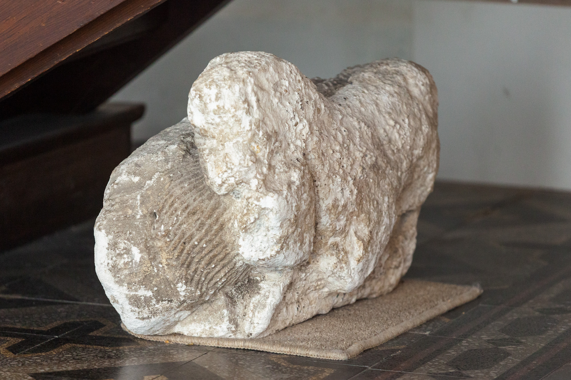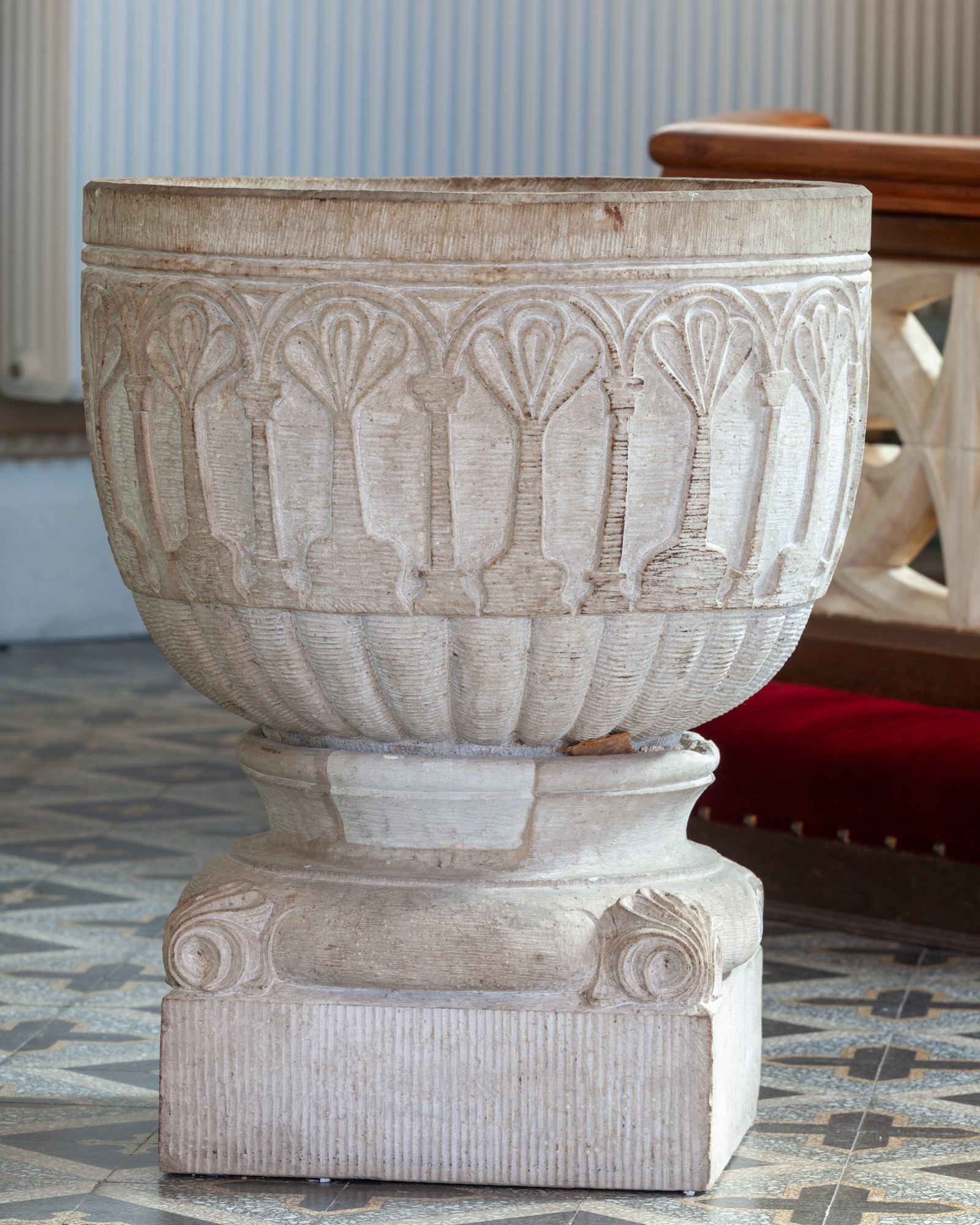 Døbefont af sandsten med fals og udtømningshul. Langs den øverste kant er en rundstav og derunder en rundbuearkade med træer i rundbuefelterne. Kummens bund har stående rundstave. Fodens hjørner har palmetter.