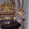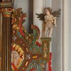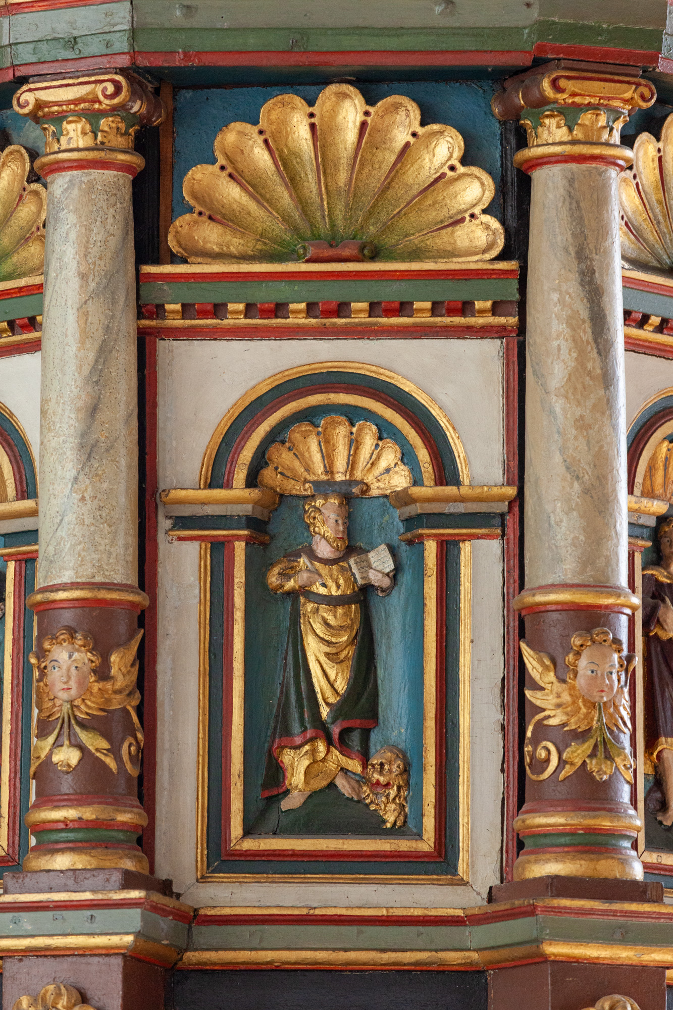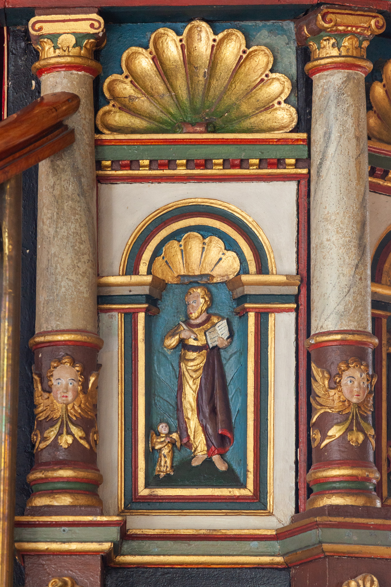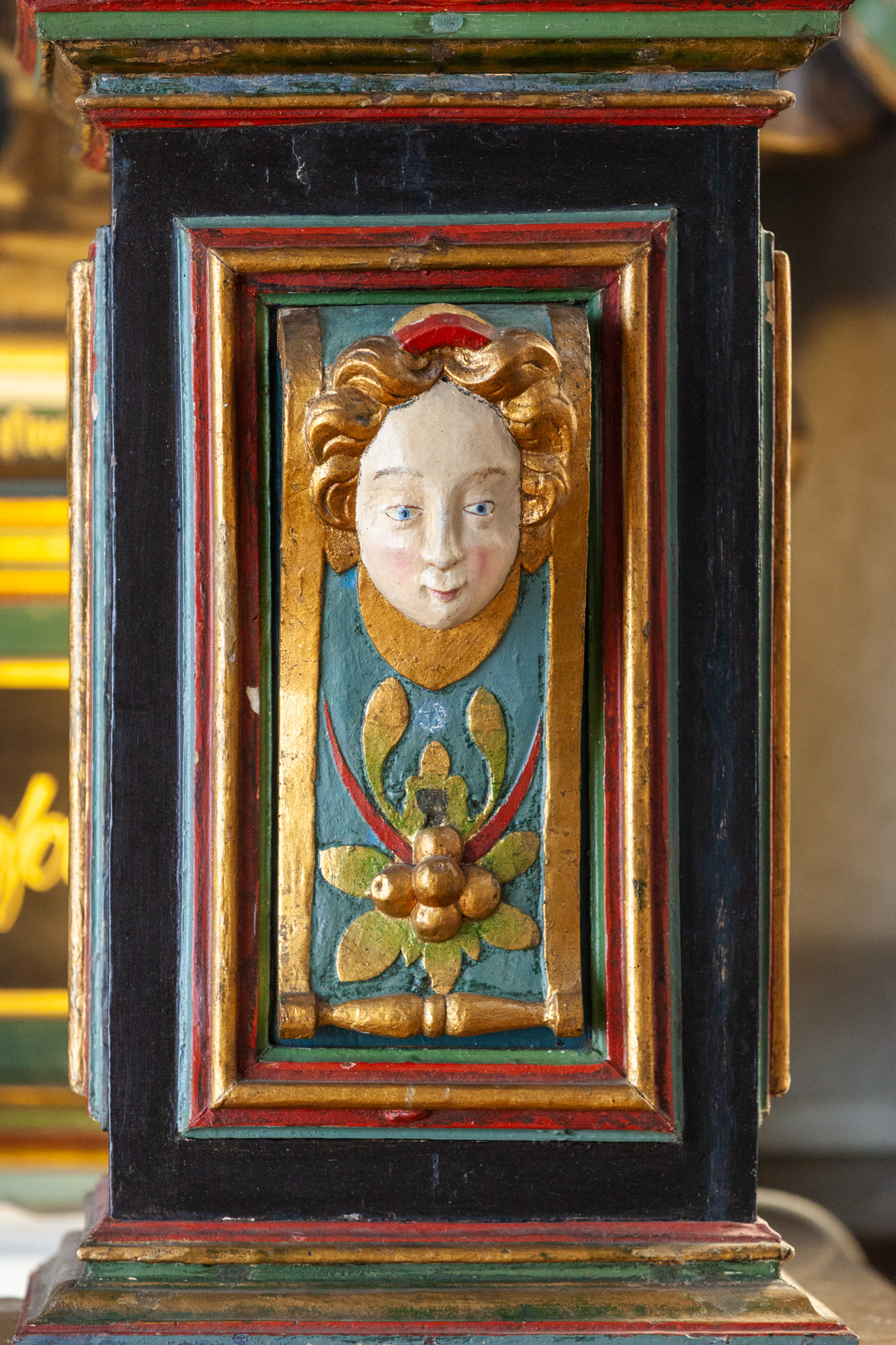Topstykket, som sidder på baldakinens forkant bærer figur af en person med en kalk og et kors. Yderst på bjælkelaget stor basunblæsende putti, og øverst på gavlstykket står en putto med en martersøjle.