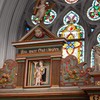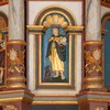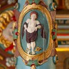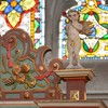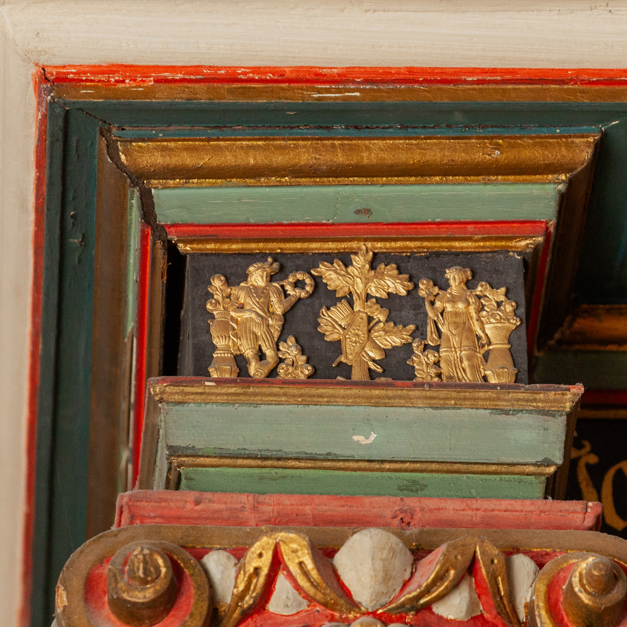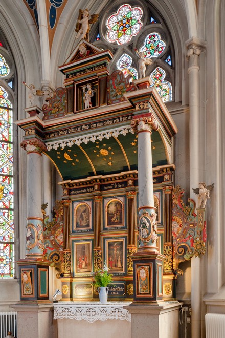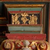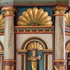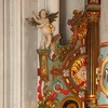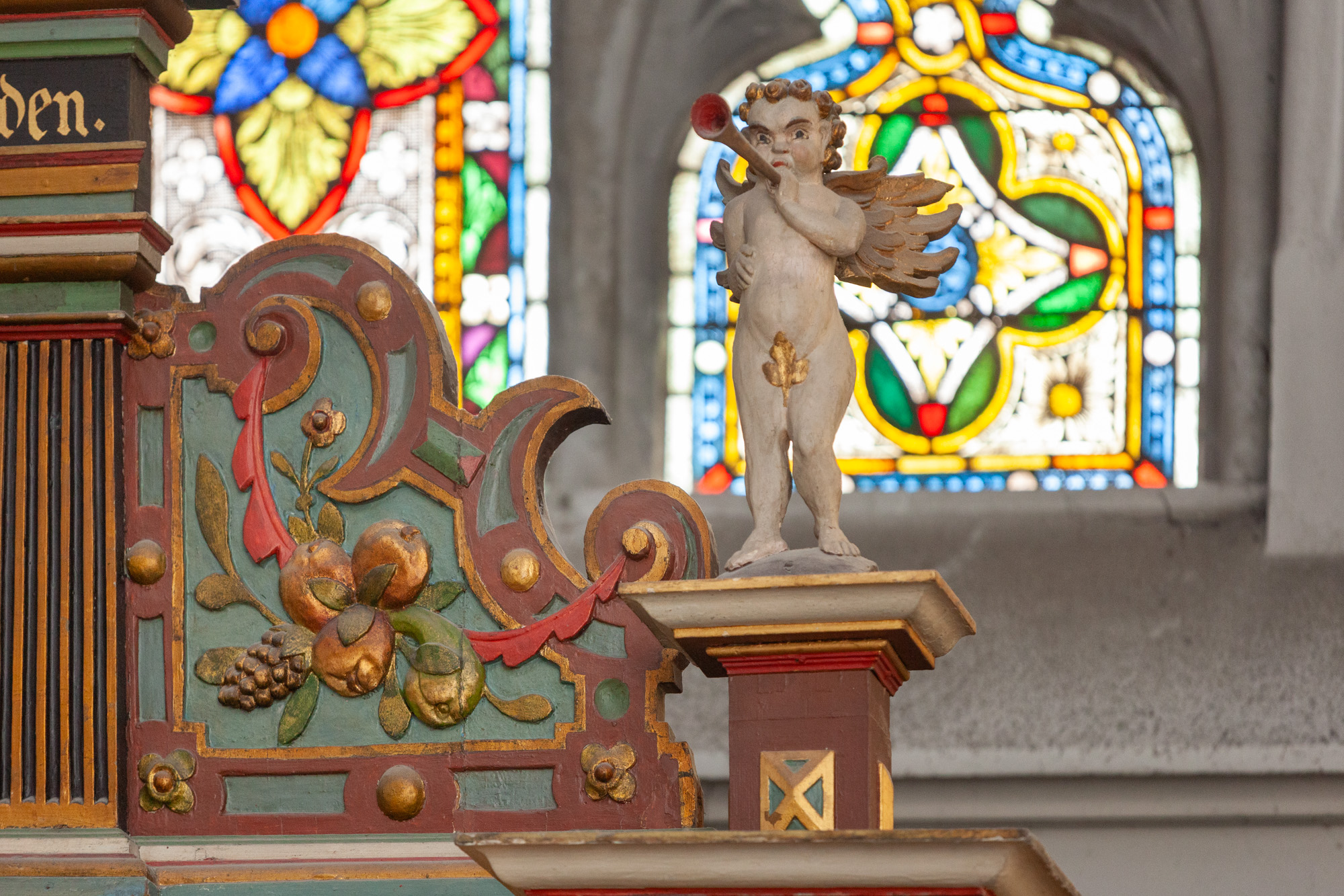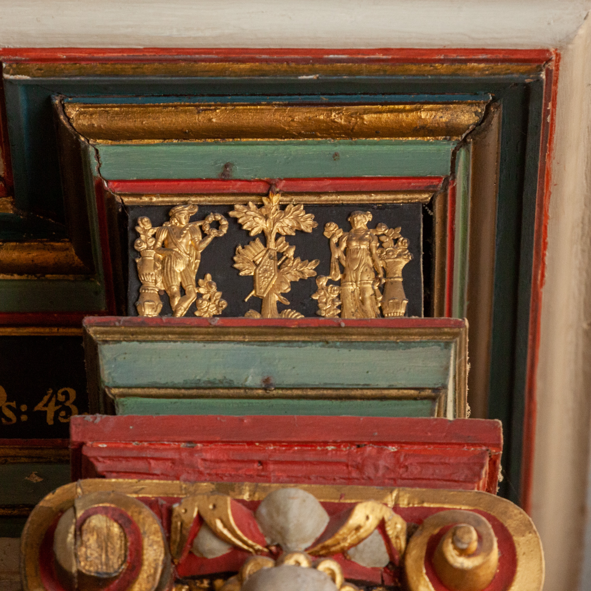 Topstykket, som sidder på baldakinens forkant bærer figur af en person med en kalk og et kors. Yderst på bjælkelaget stor basunblæsende putti, og øverst på gavlstykket står en putto med en martersøjle.