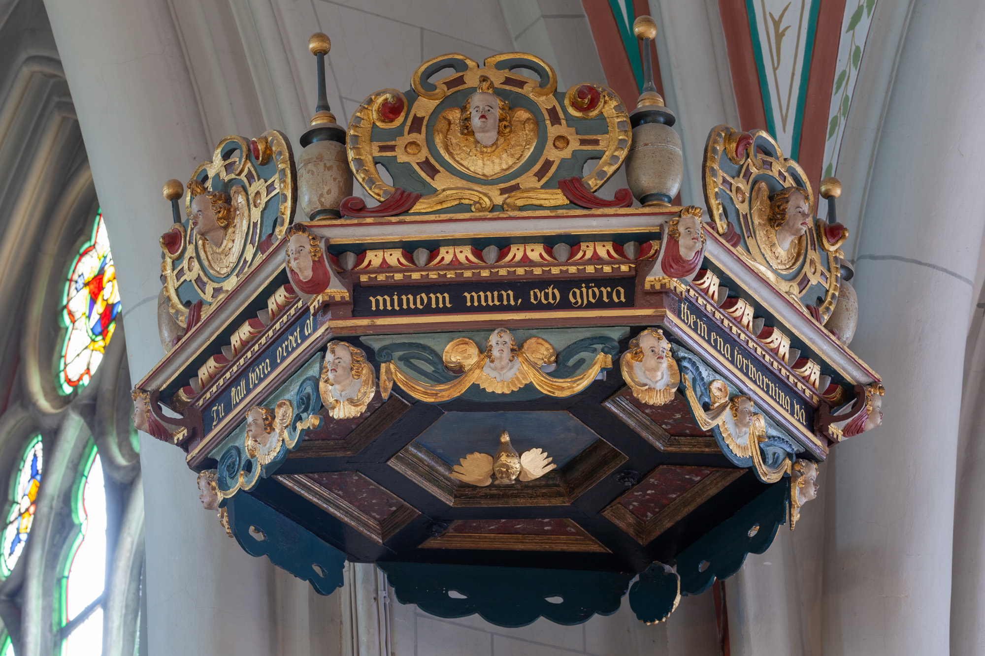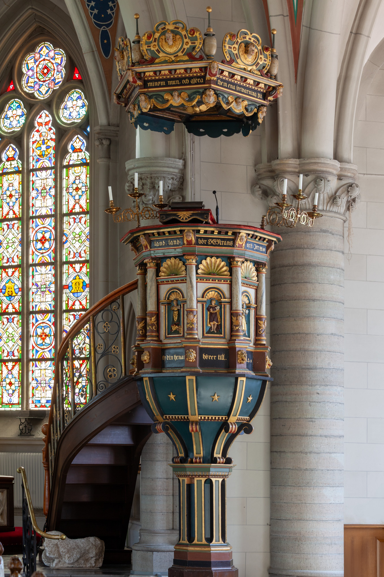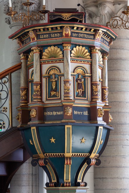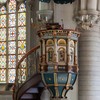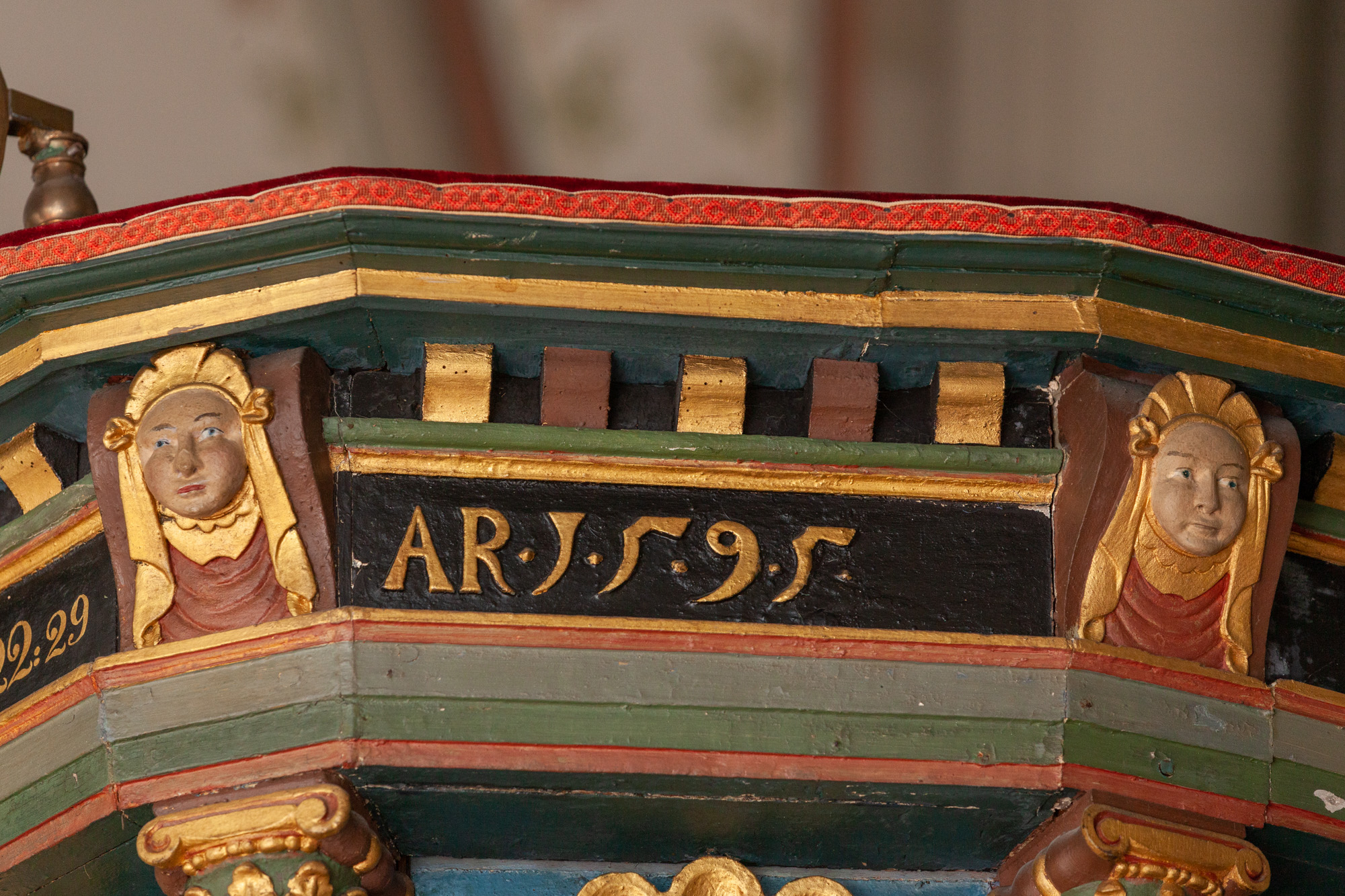Prædikestolen menes ligesom altertavlen at være et værk af Daniel Tommisen. Den bærer årstallet 1595.