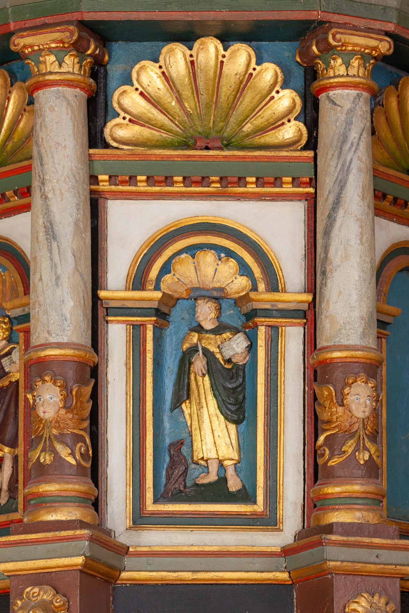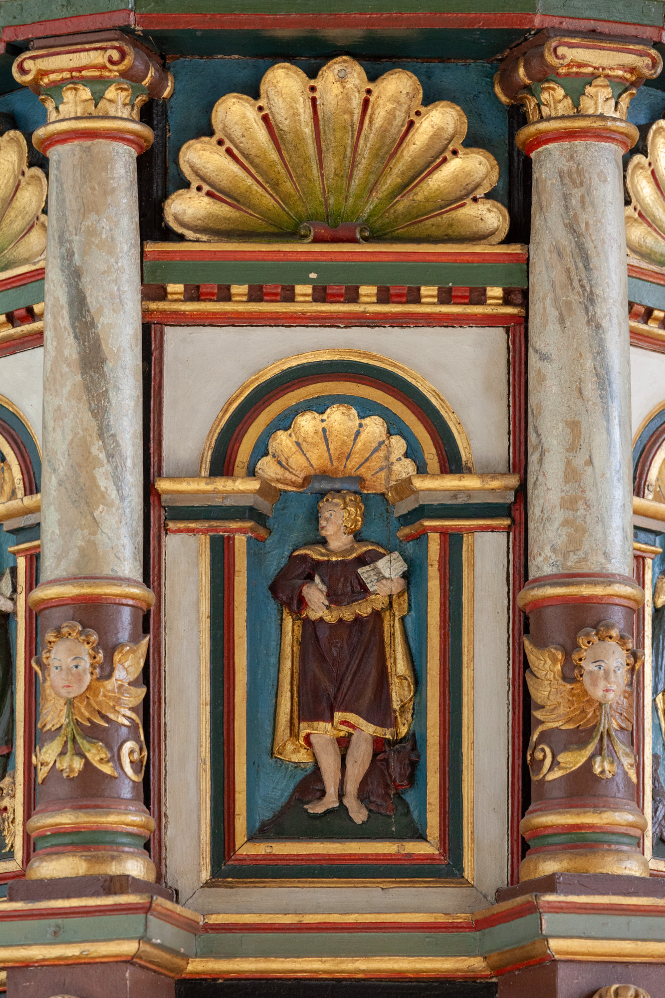 Kurven består af fem sider, hvor de fire fremstillinger af evangelisterne i højt relief. Det femte storfelt er tomt. Over storfelterne sidder en muslingeskal. Søjlerne, som er fritstående, har glatte søjler og prydbælter og små løvehoveder på konsollerne.