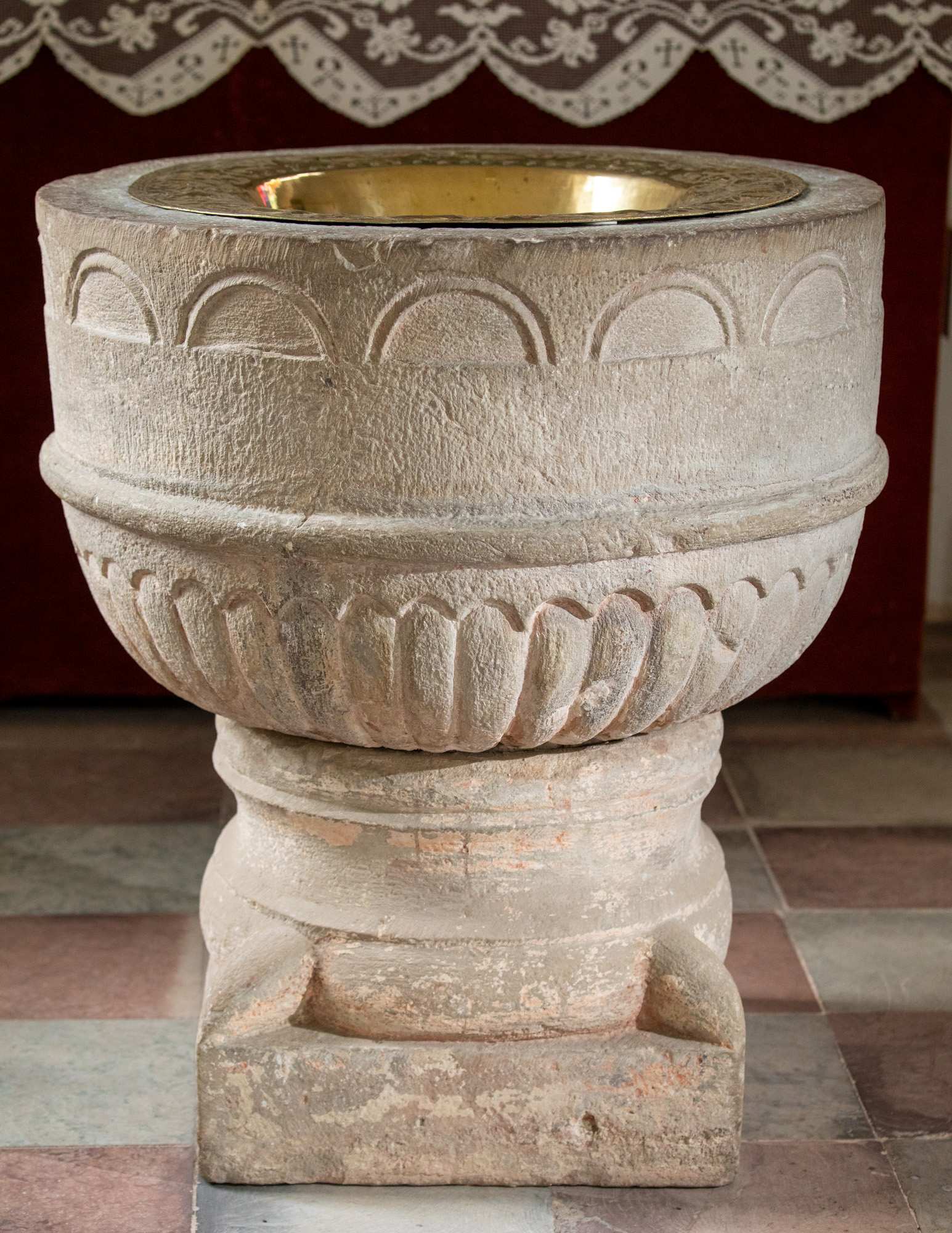 Døbefonten er af sandsten eller kalksten. Den tilhører Bollerupgruppen. I stedet for den tovstav, der er karakteristisk for gruppen, har den en rundstav. Den har ingen fals, men udtømningshul.