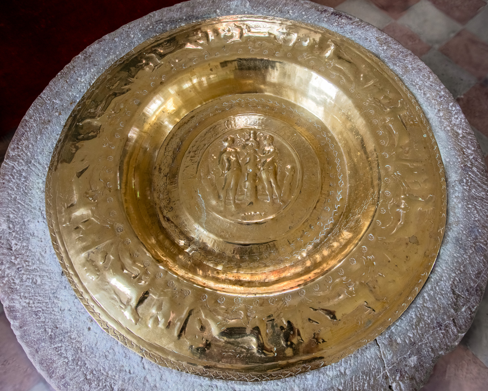 Dåbsfad med Syndefaldet i bunden og springende hjorte på randen.