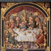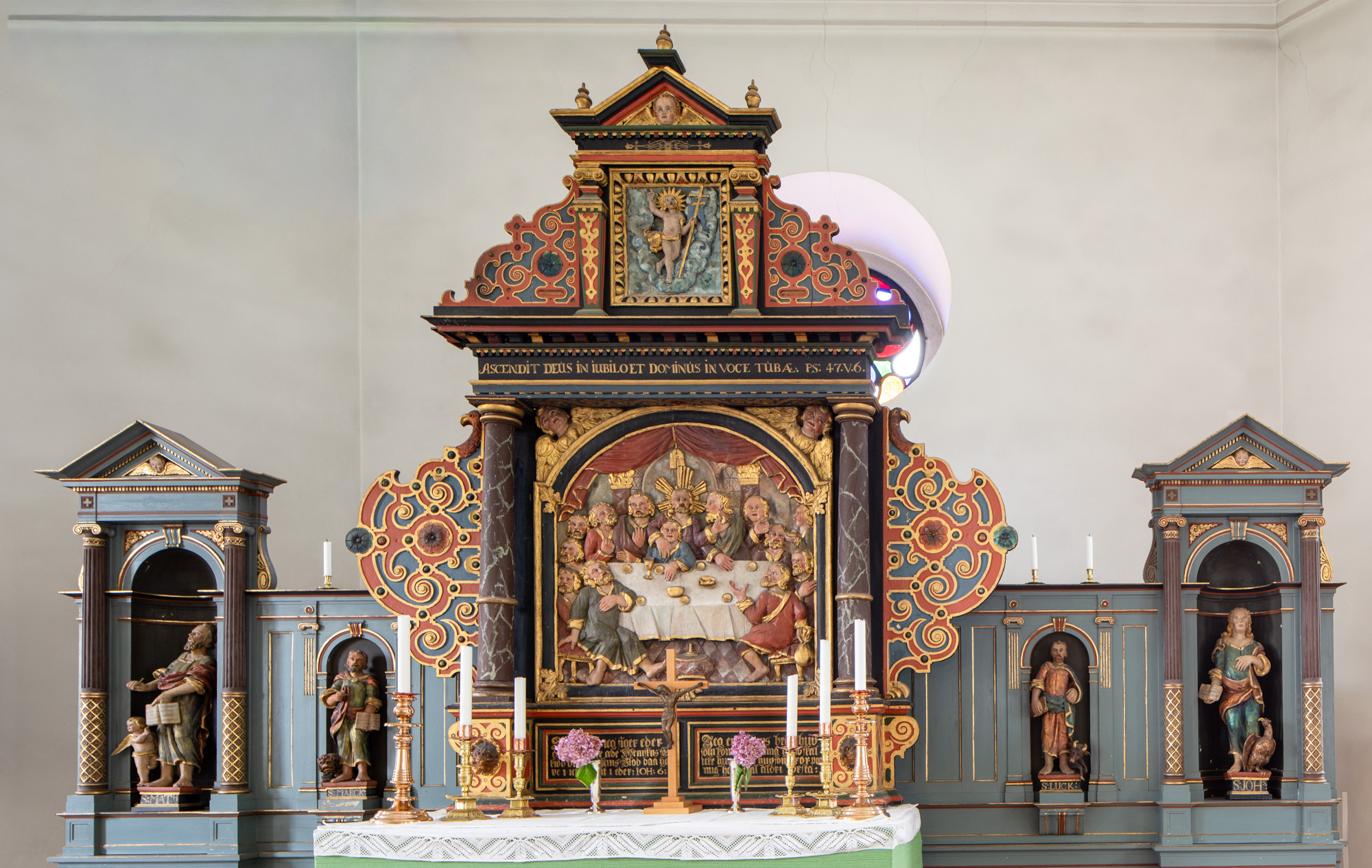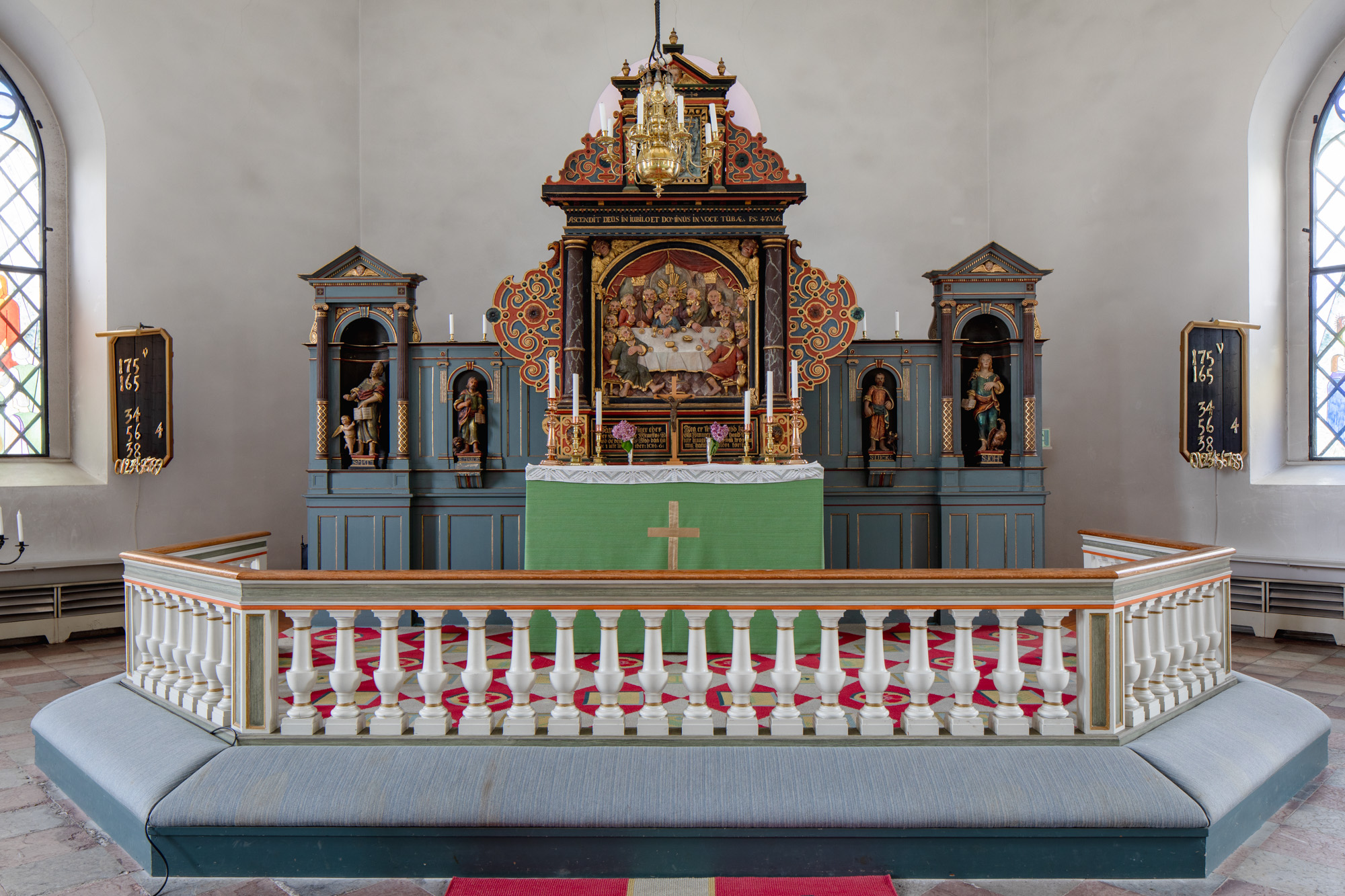 Altertavlen, der er fra begyndelsen af 1600-tallet består af et storstykke med vinger. Det har et relief af Nadverens Indstiftelse indrammet af en flad bue med engle i sviklerne. Det flankeres af to glatte marmorerede søjler, som står på to konsoller med løvemasker og beslagornamentik. Predellaen har to tekstfelter med et citat fra Joh. 6,35 og 53: