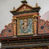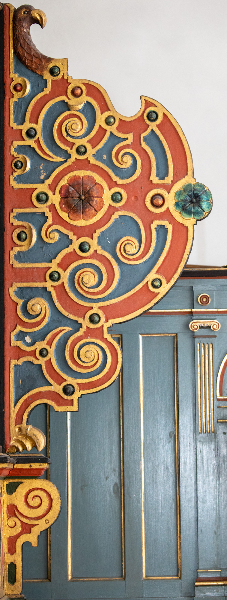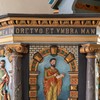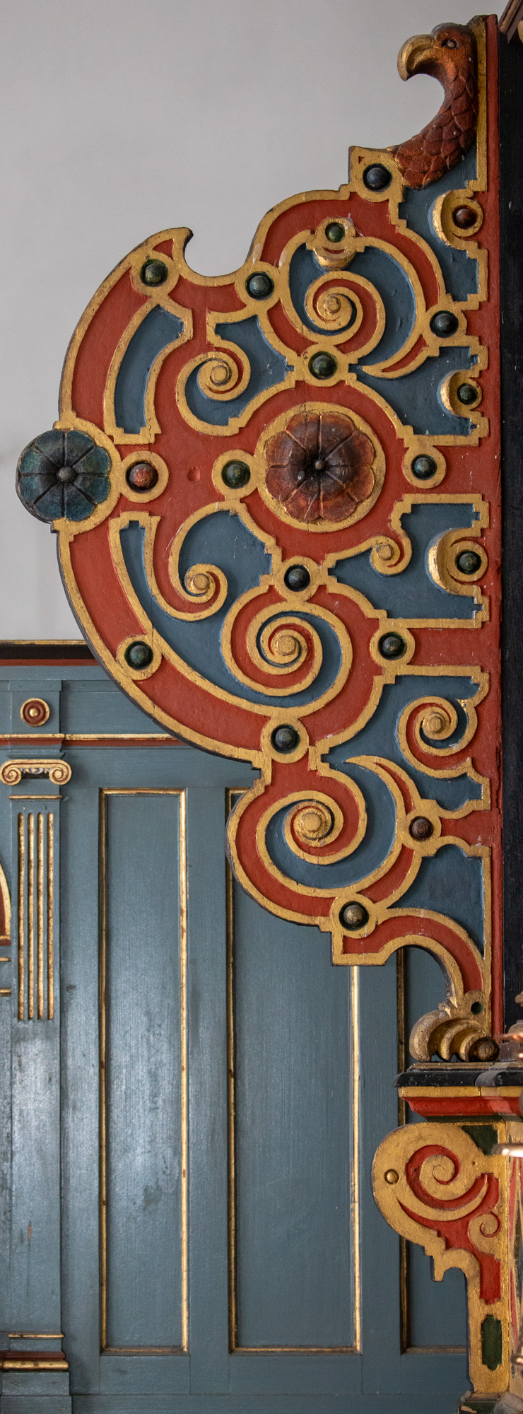 Topstykket består af et midterfelt med en fremstilling af den Opstandne med glorie, sejrsfane og højre hånd løftet til velsignelse. Det har små sidevinger og øverst et lavt gavlstykke med en engel og urner.