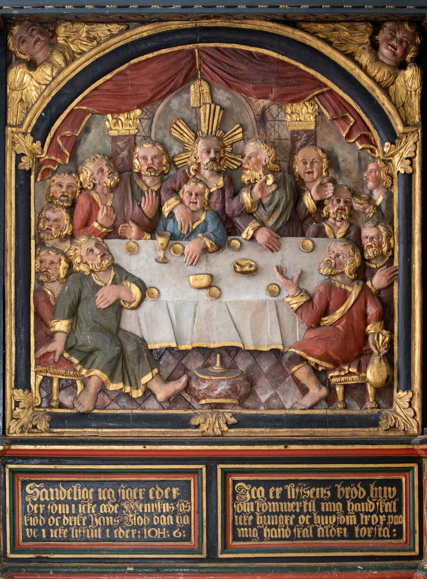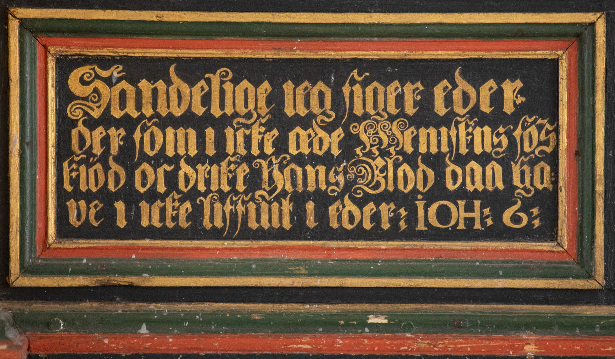 Sandelige ieg siger eder der som i icke æde Meniskns søns kiød oc drike Hans Blod daa have i icke liffuit i eder. IOH 6. (”Sandelig siger jeg jer: Hvis ikke I spiser Menneskesønnens kød og drikker hans blod, har I ikke liv i jer.”)