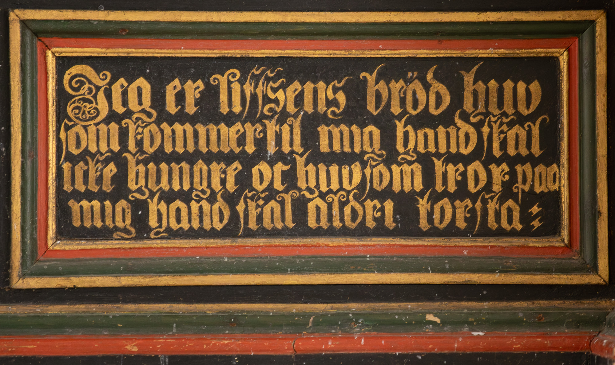 Jeg er liffsens brød huo som kommer til mig hand skal icke hungre oc huo som tror paa mig hand skal aldri torsta. (”Jeg er livets brød. Den, der kommer til mig, skal ikke sulte, og den, der tror på mig, skal aldrig tørste.”)