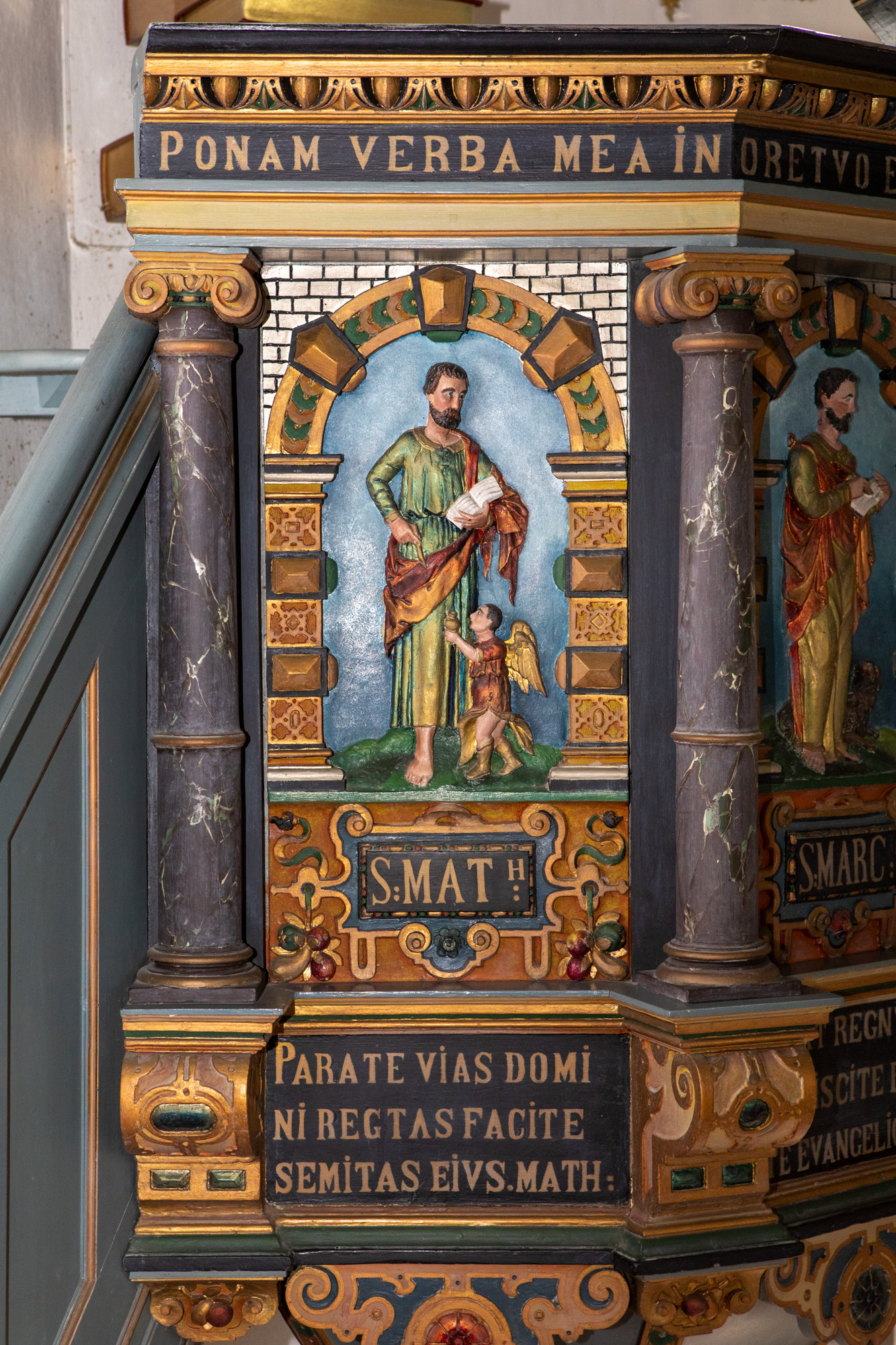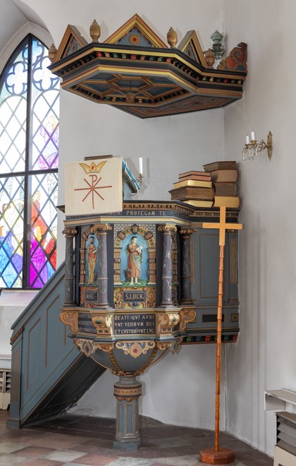 Prædikestolen er fra 1601. Storfelterne har relieffer af evangelisterne indrammet af en rundbue. Søjlerne på hjørnerne har glatte marmorerede skafter med joniske kapitæler. Bemalingens alder er ukendt.