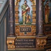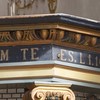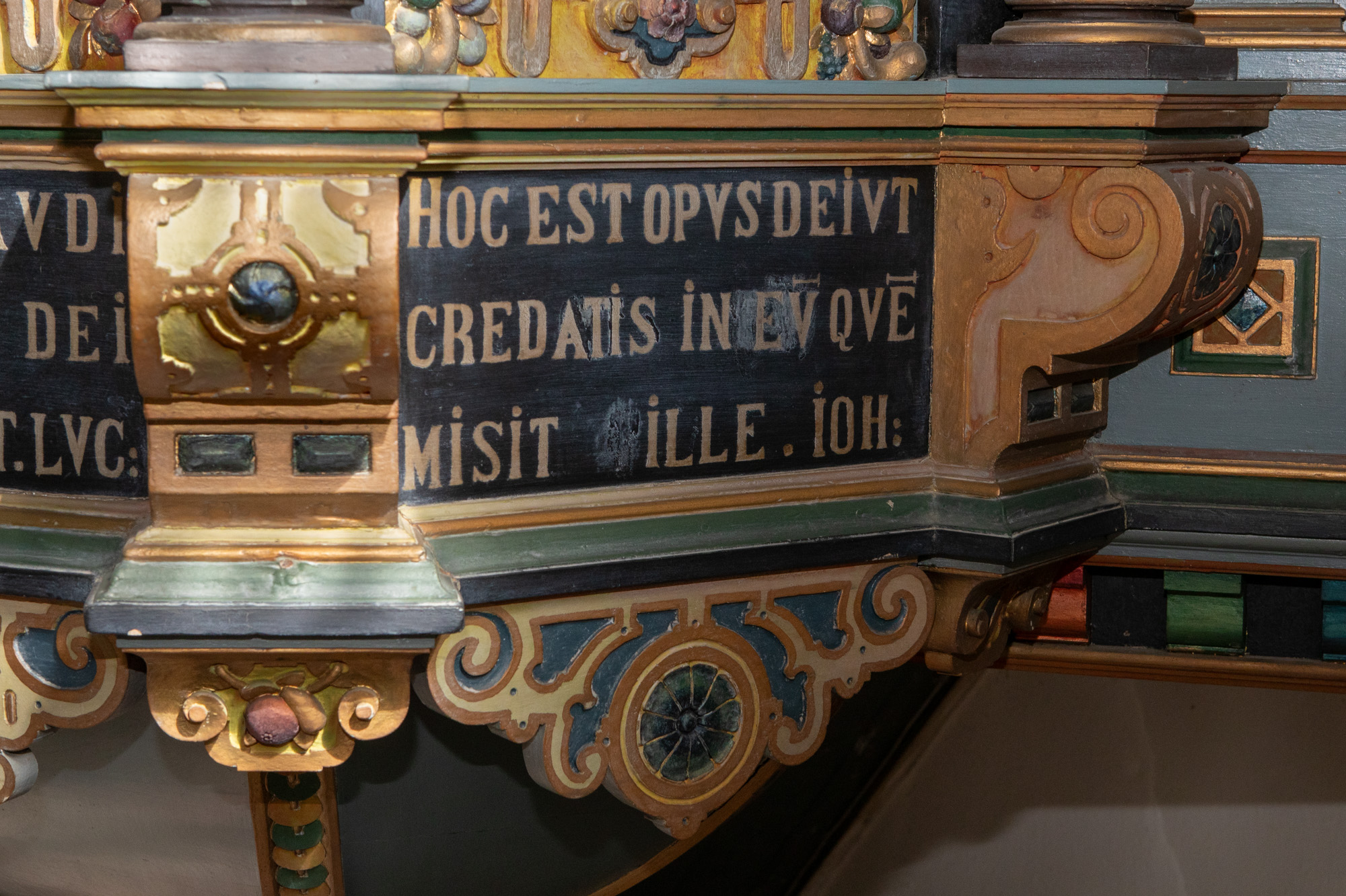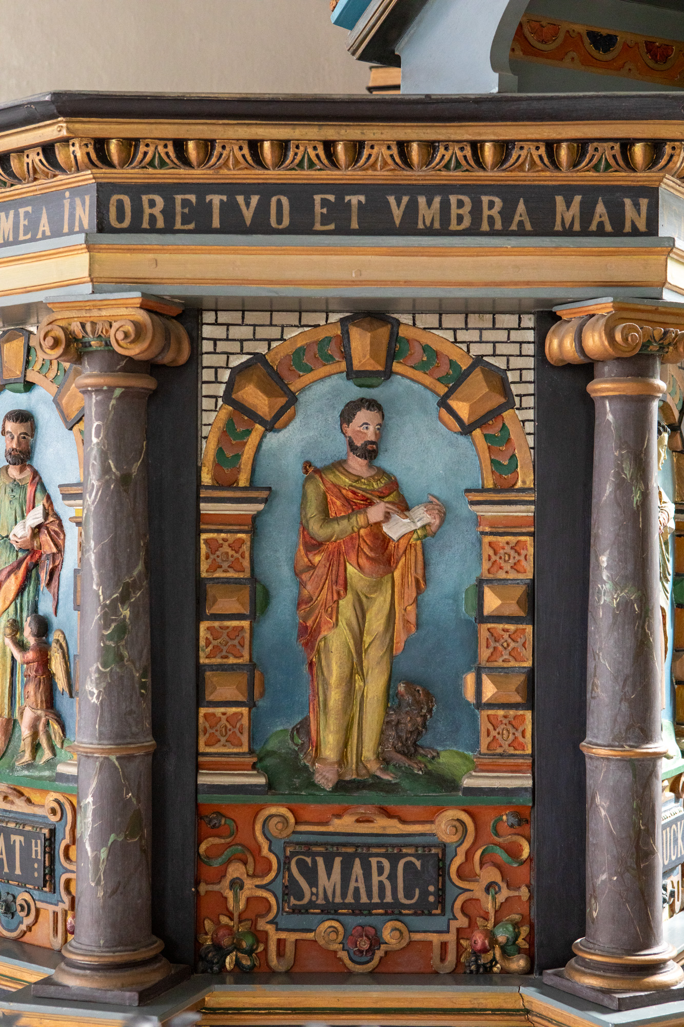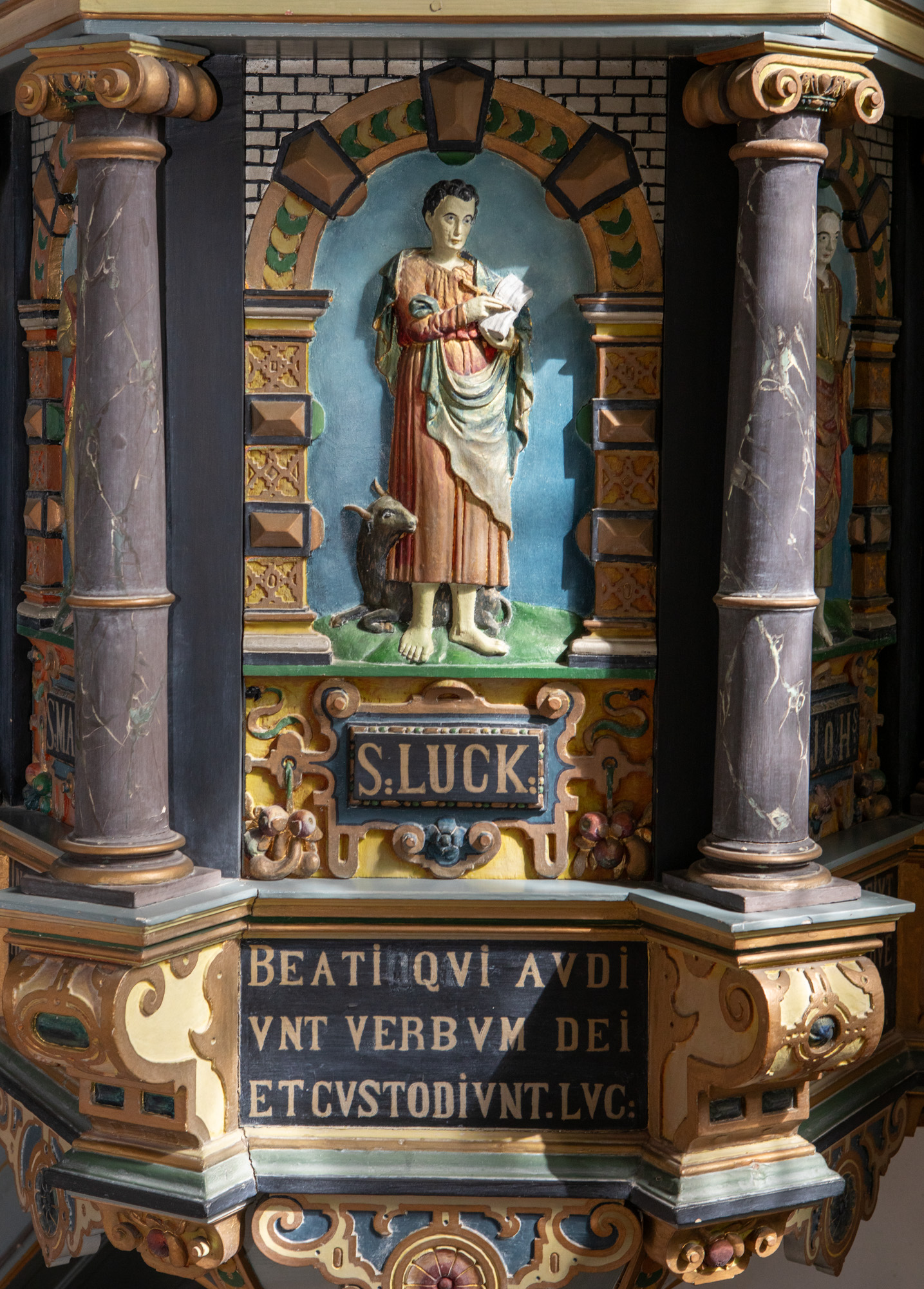 Storfelterne har som nævnt fremstillinger af evangelisterne i relief. De er indrammet af rundbuefelter med kraftige bosser. På pilastrene er der mellem bosserne beslagornamentik, mens de tilsvarende felter på buen har dukater på snor. Sviklerne er udsmykket med ”mursten”. Under billedet ses evangelistens navn forkorket i en kartouche. I smalfelterne ses et citat fra det pågældende evangelium: