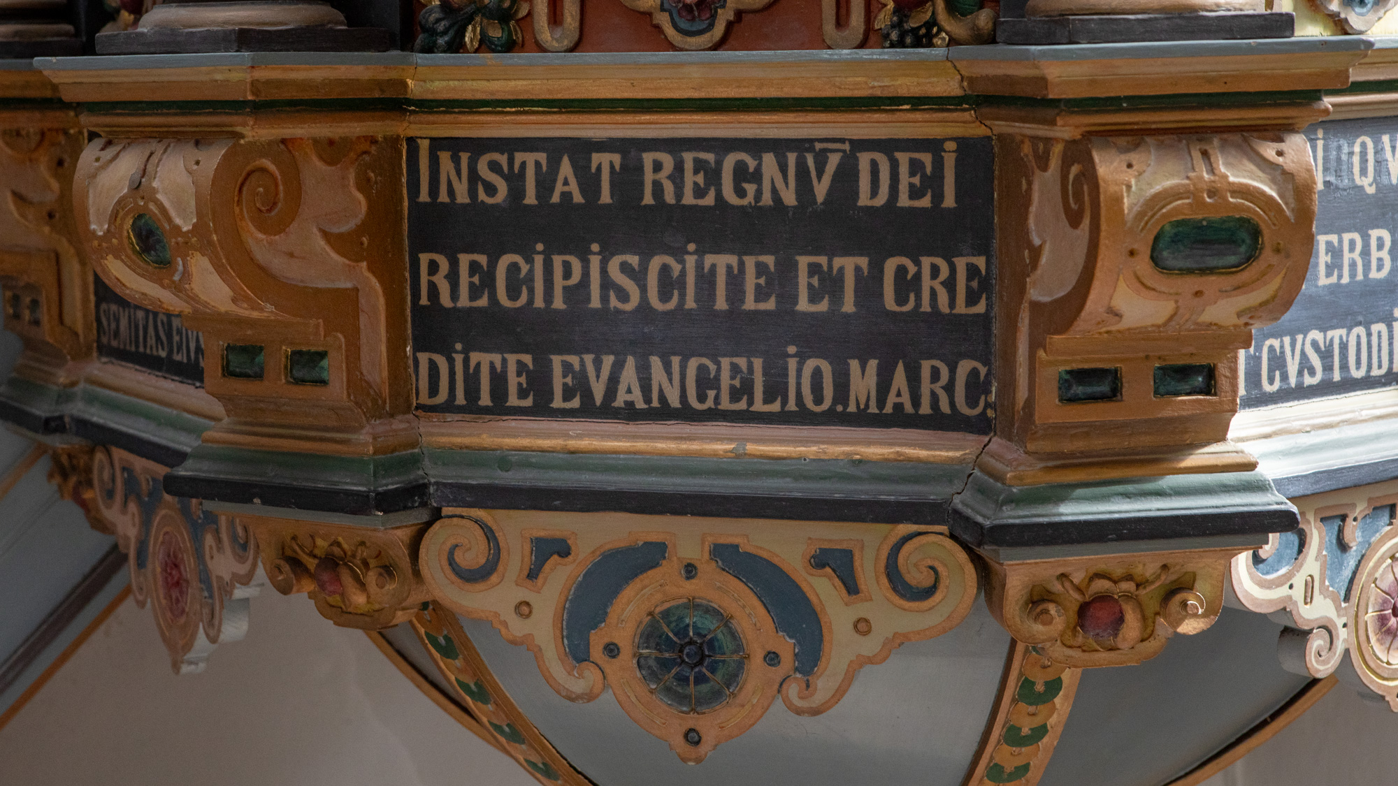 Instat regnum dei recipiscite et credite evangelio. Marc. (“Guds rige er kommet nær; omvend jer og tro på evangeliet.” Mk. 1,15).