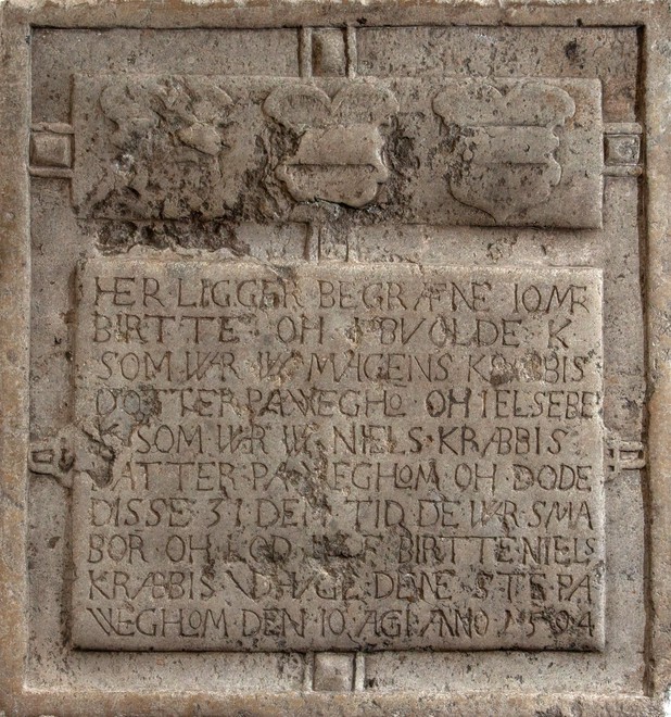 Her ligger begrafne Iomf. Birtte oh I. Buolde K., som war w. Magens Krabbis Dotter pa Wegholm, oh I. Elsebe K., som war w. Niels Krabbis Datter pa Vegholm oh døde disse 3 I. den Tid de war sma Børn oh lod W.F. Birtte Niels Krabbis udhuge denne Sten pa Wegholm den 10. Agi. Anno 1594.
