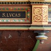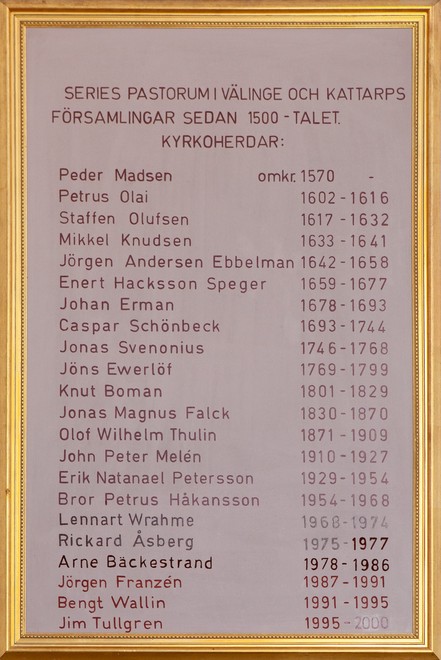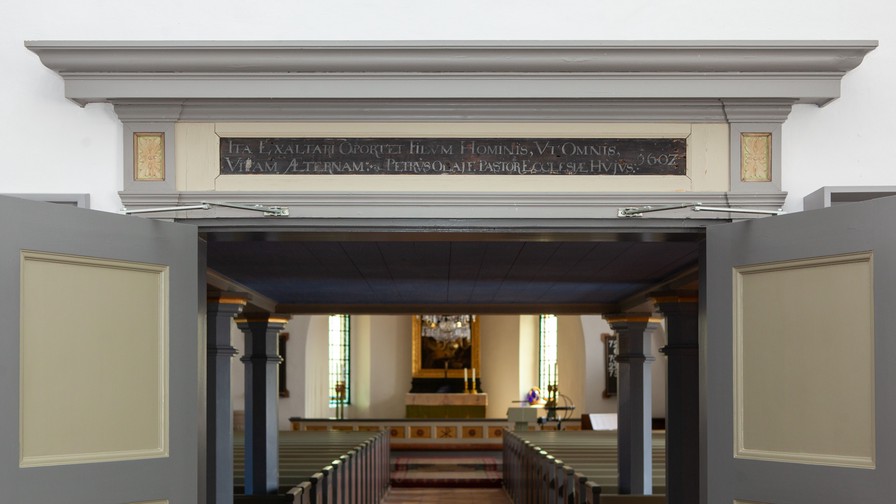 Over indgangsdøren i våbenhuset er anbragt et felt, som skal stamme fra trappeopgangen til prædikestolen. På den står der: