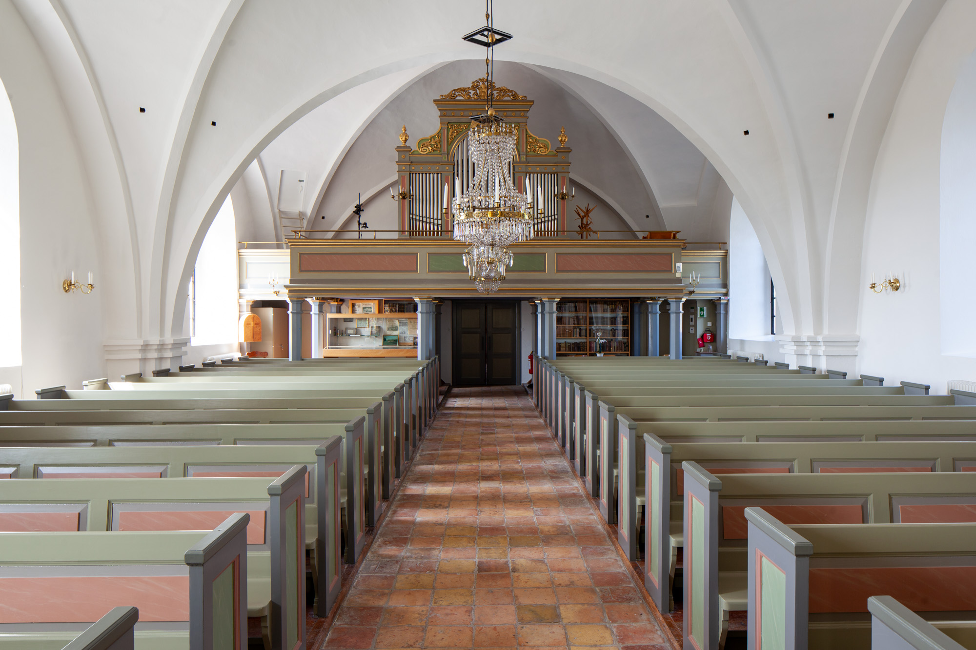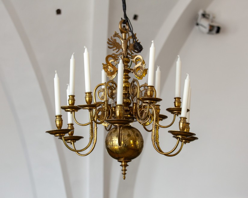 I skibet nærmest koret hænger en lysekrone af malm med indskriften: