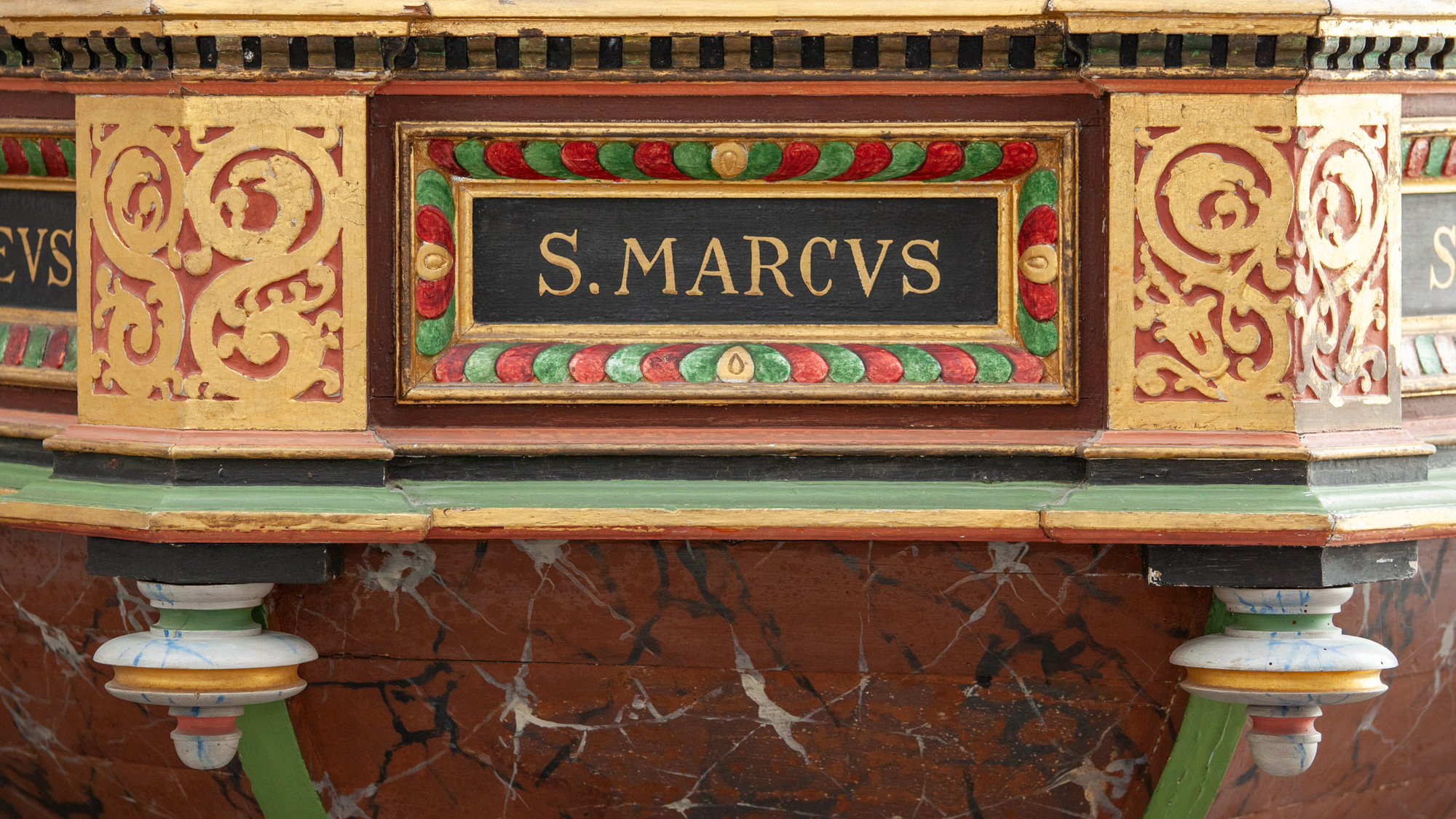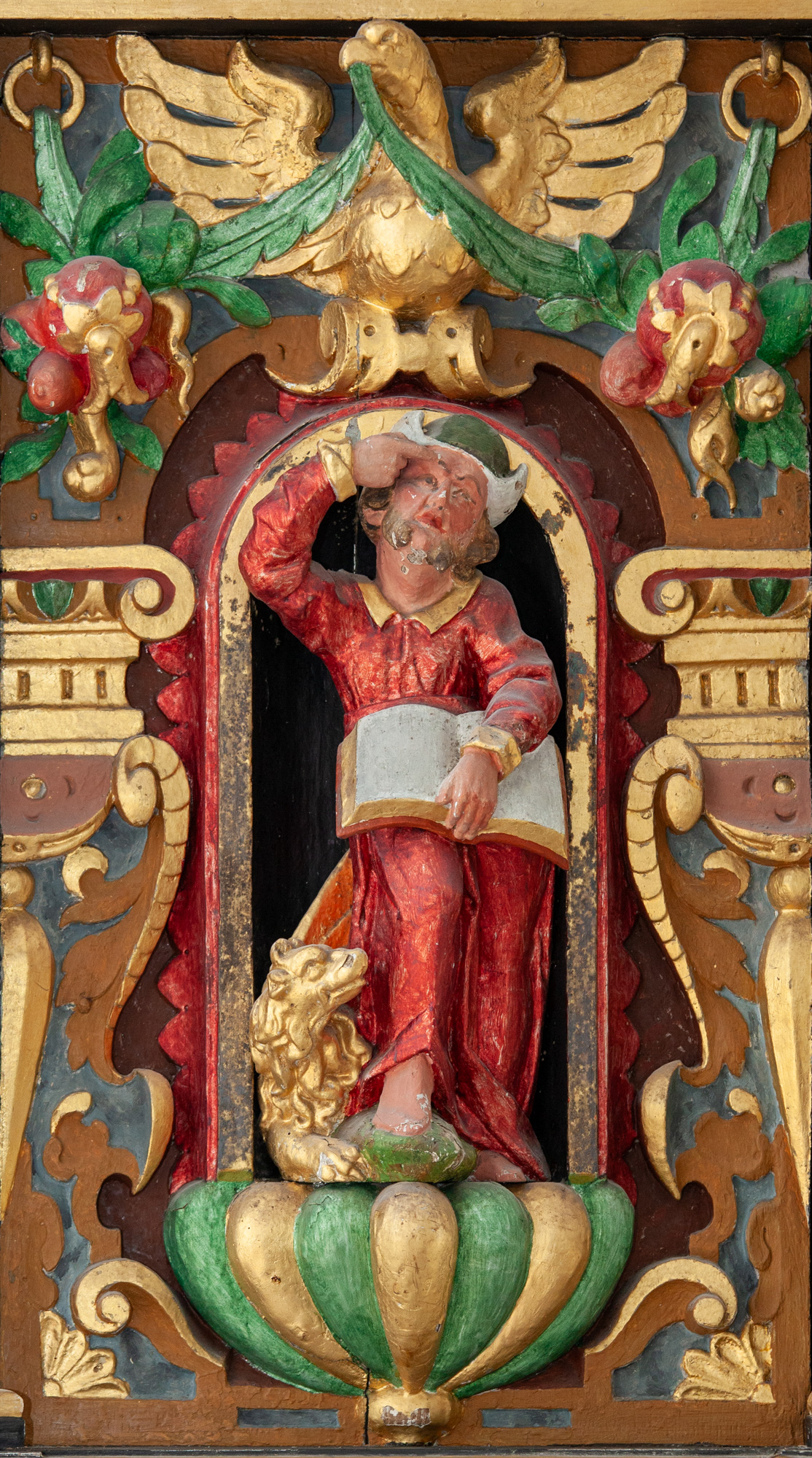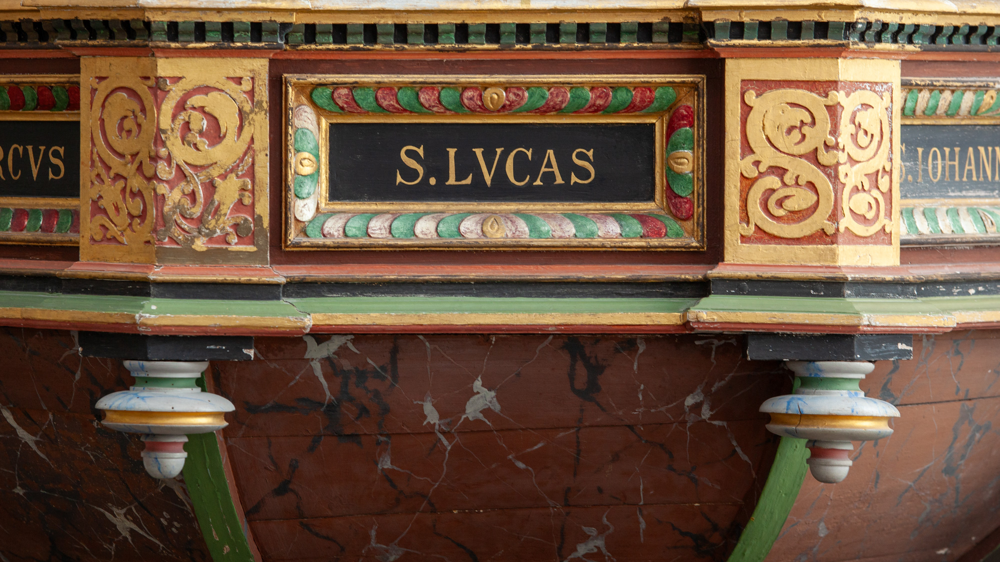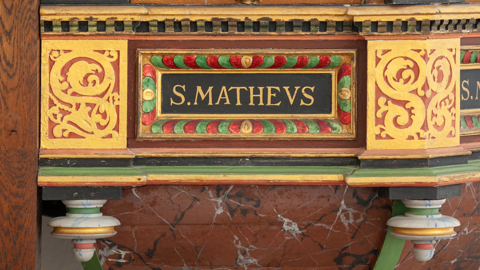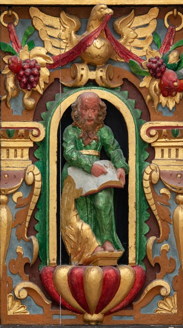 De nederste smalfelter bærer evangelisternes navne. Konsollerne har beslagornamentik og nedhæng.