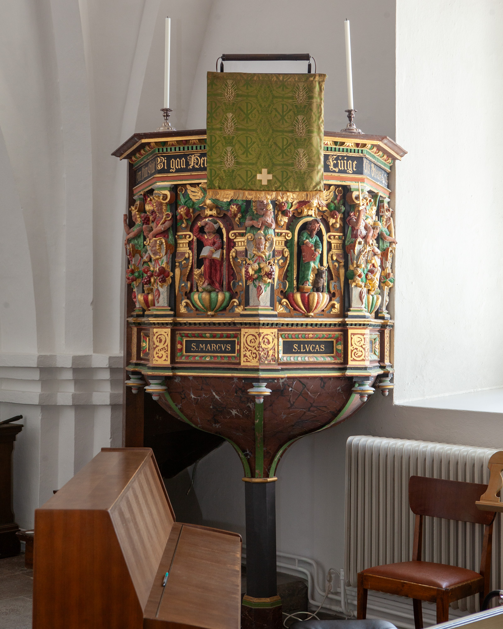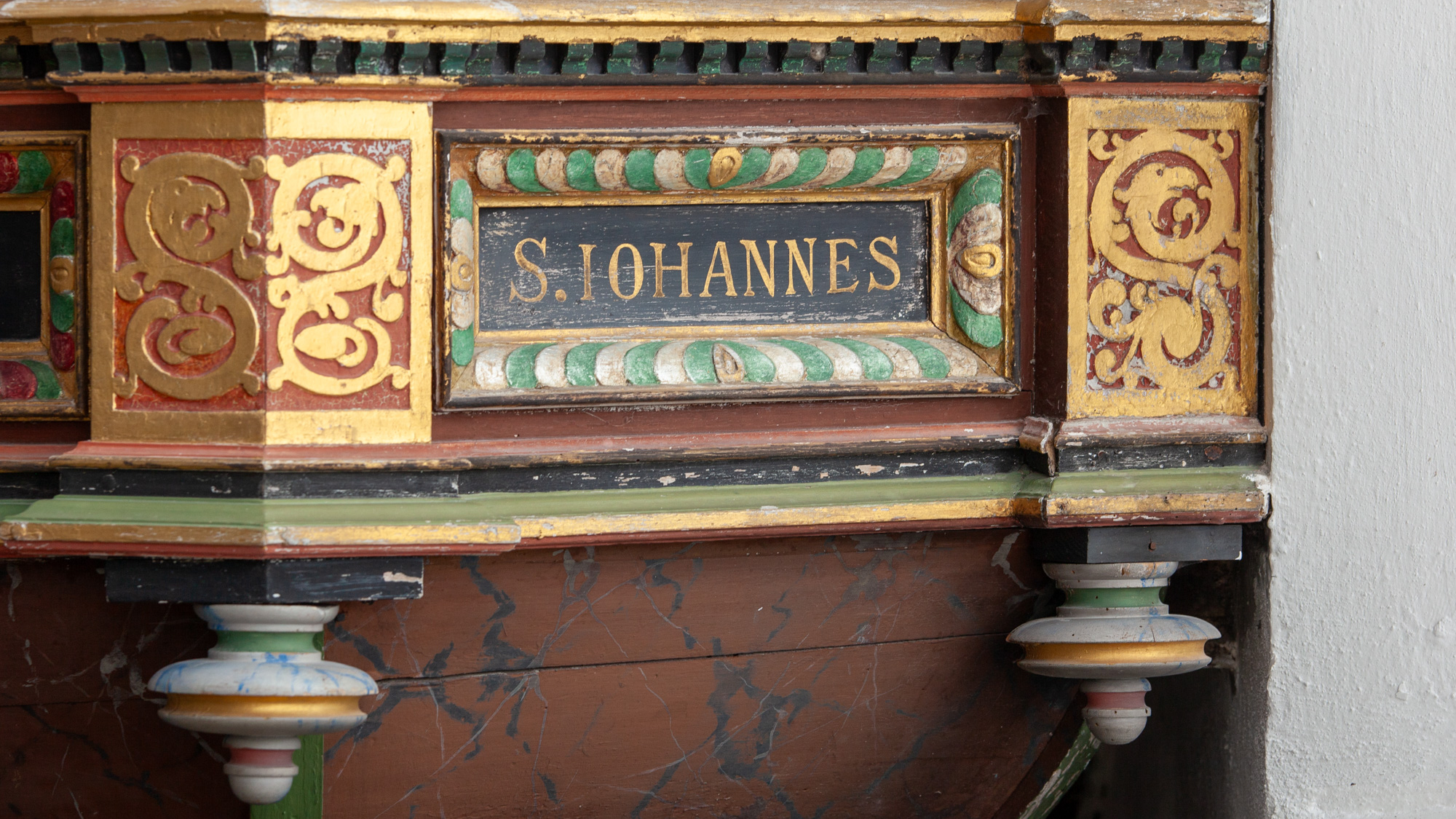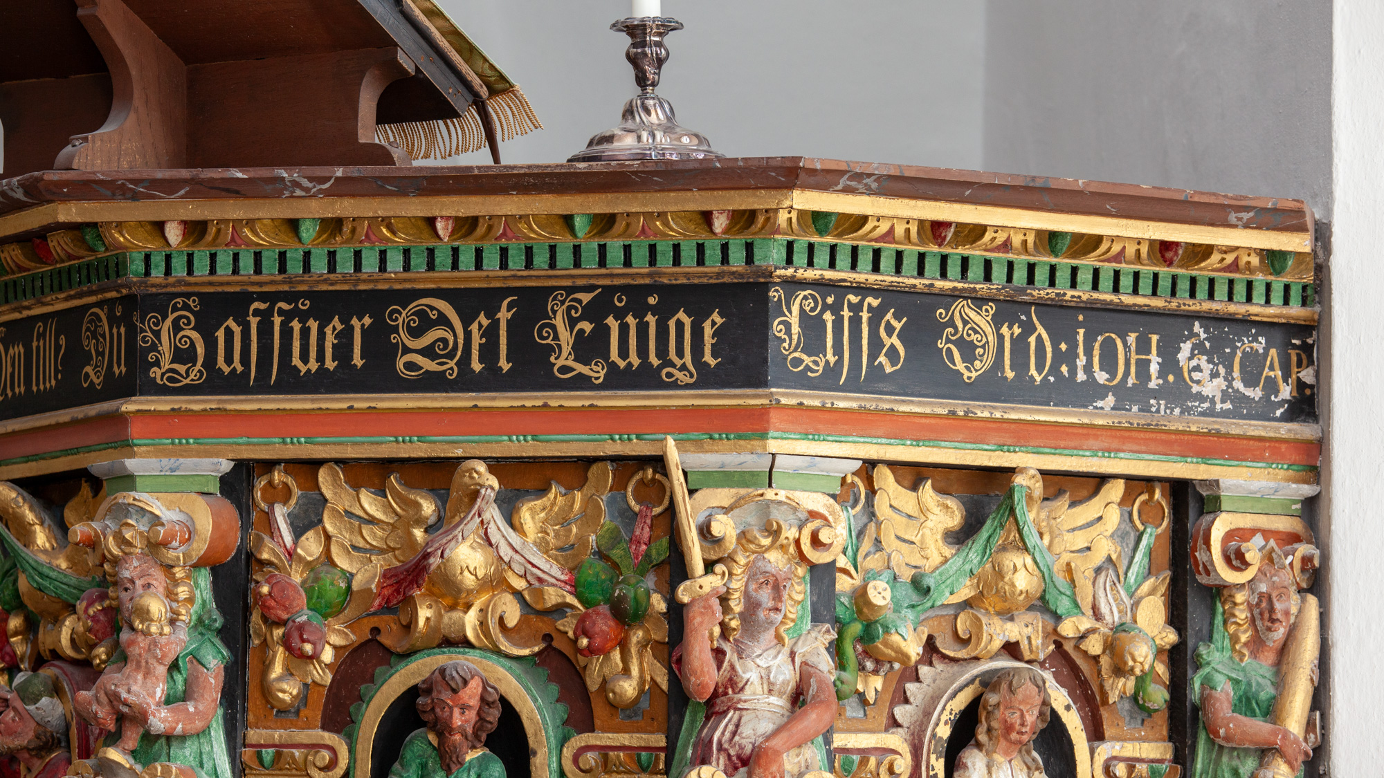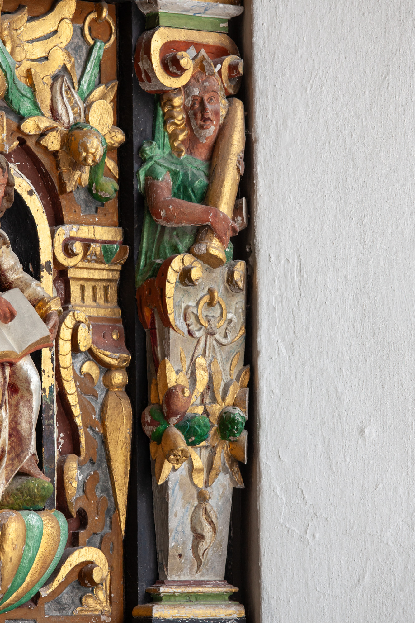 De nederste smalfelter bærer evangelisternes navne. Konsollerne har beslagornamentik og nedhæng.