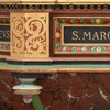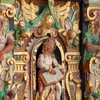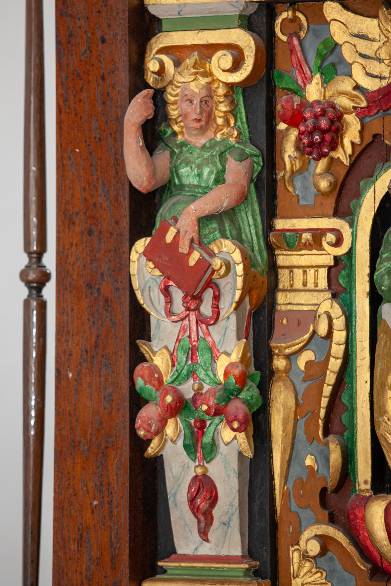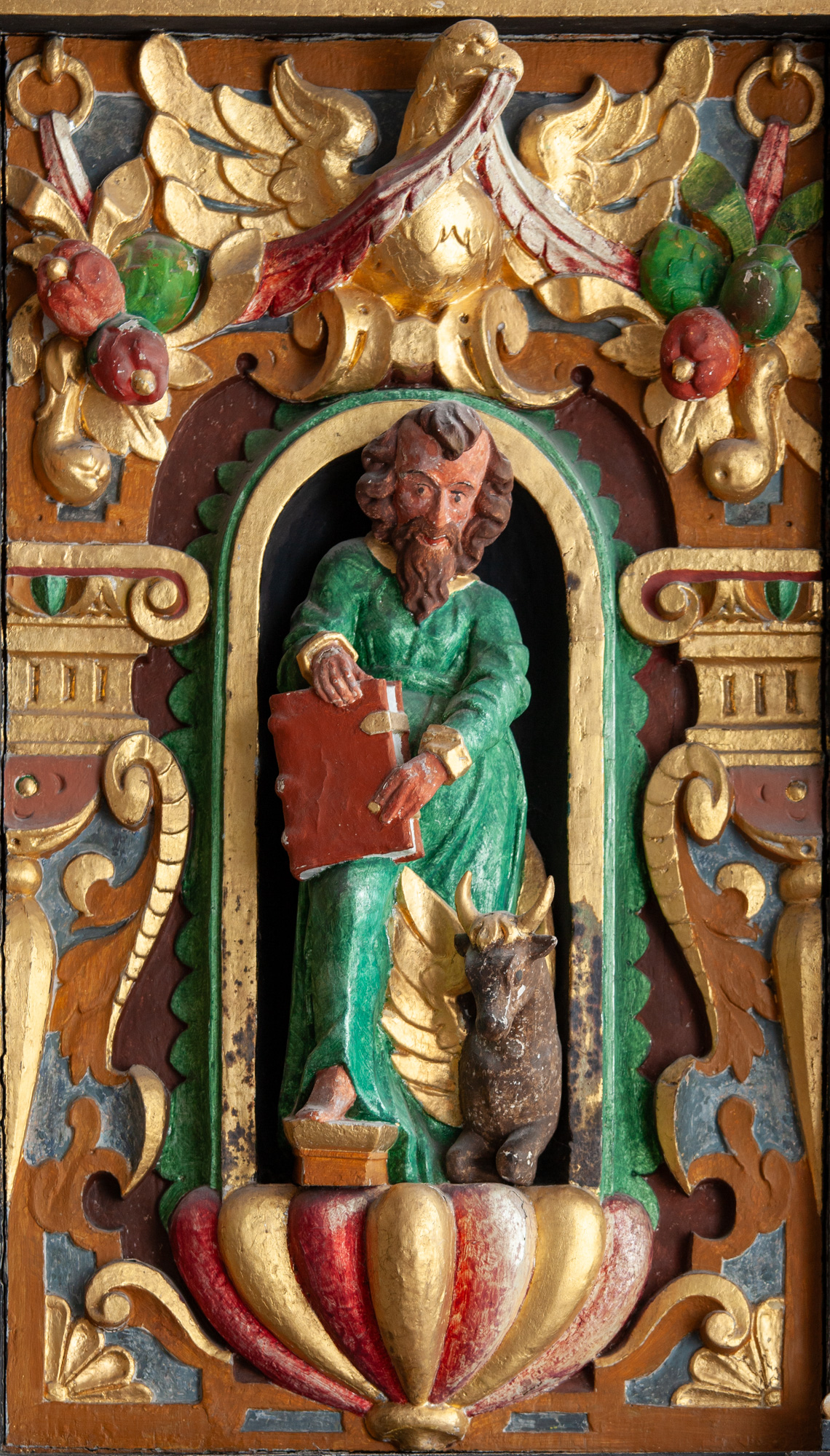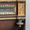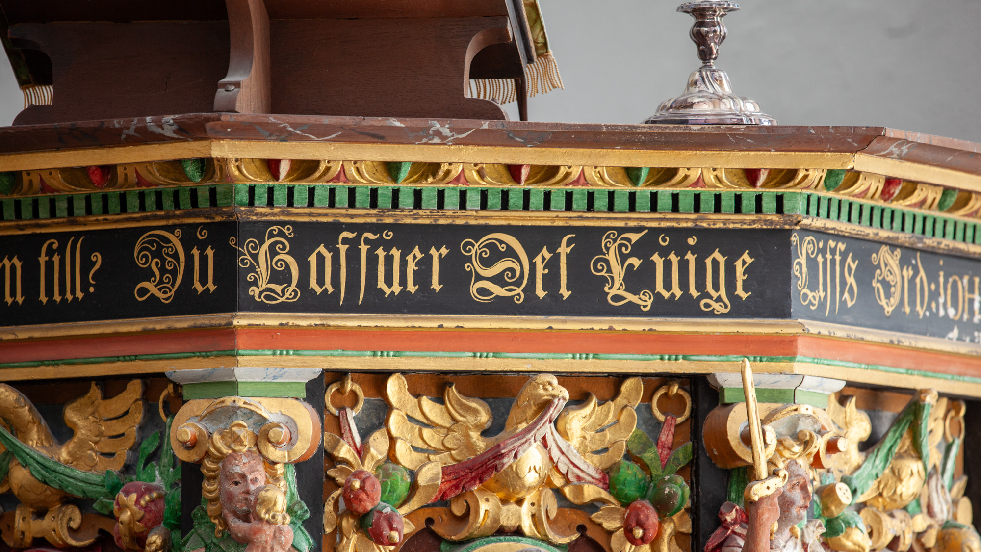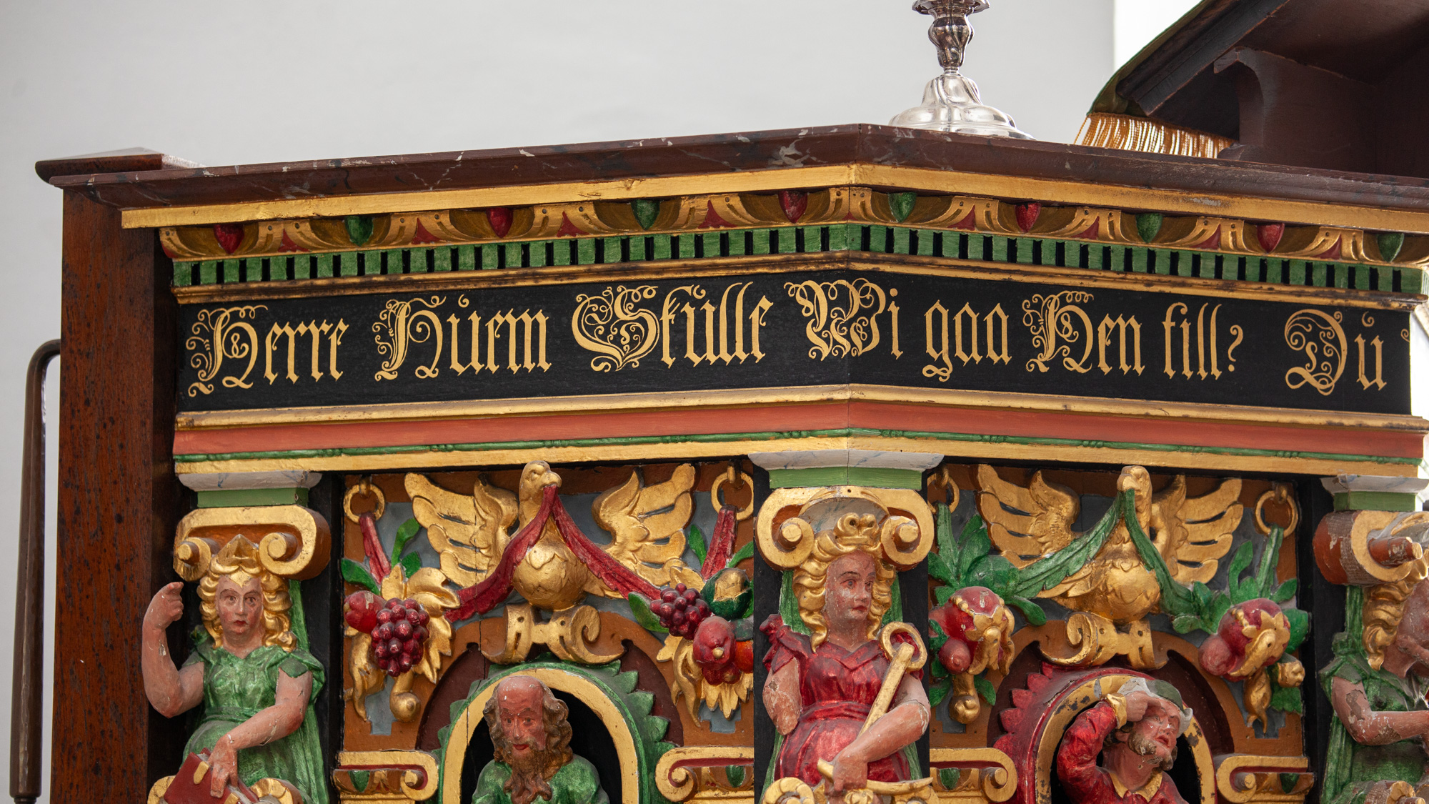 De nederste smalfelter bærer evangelisternes navne. Konsollerne har beslagornamentik og nedhæng.